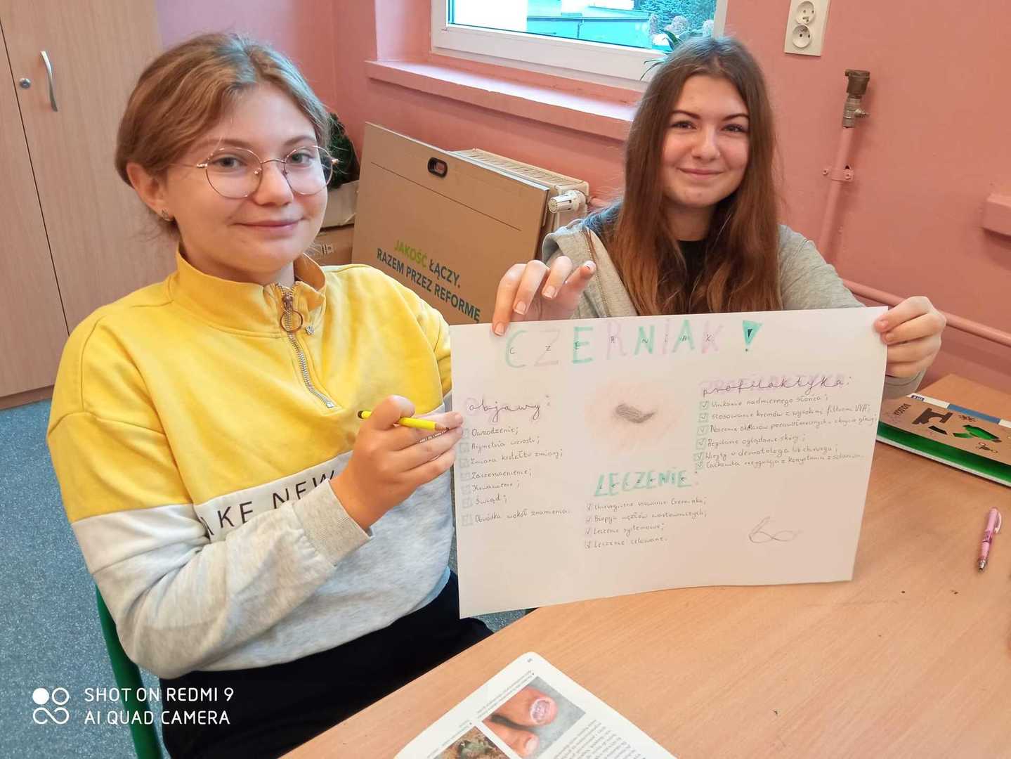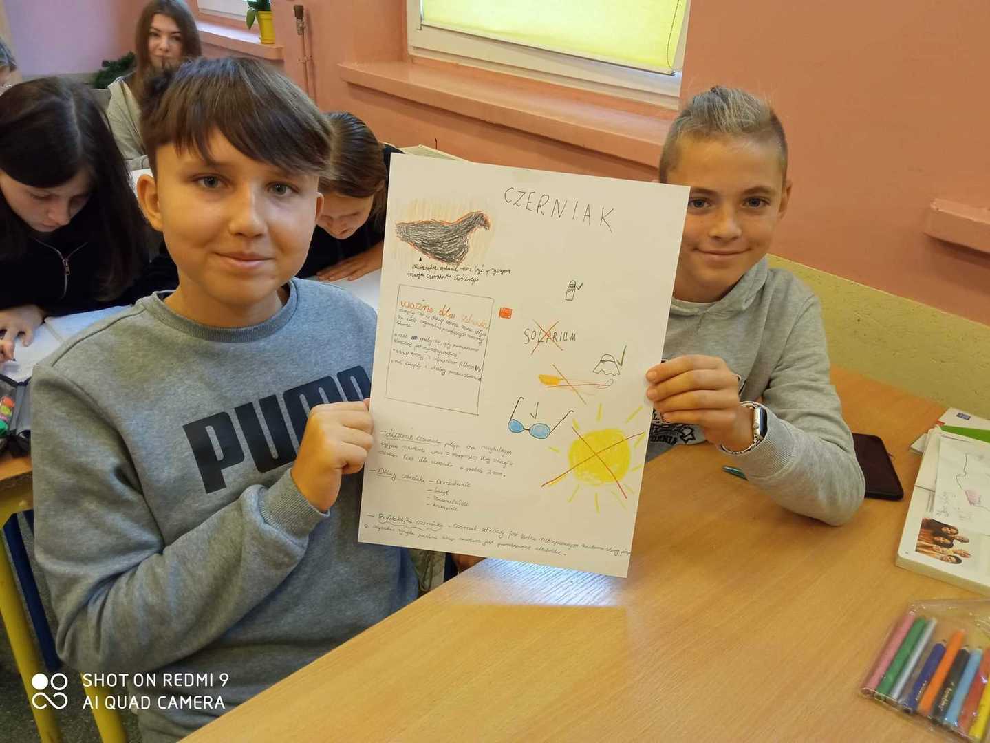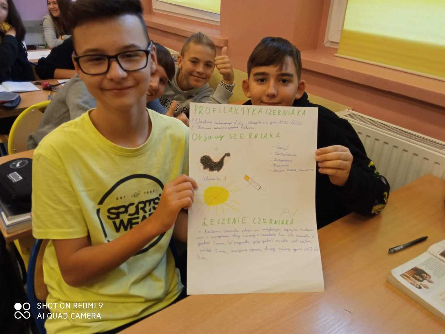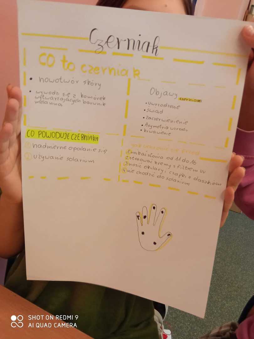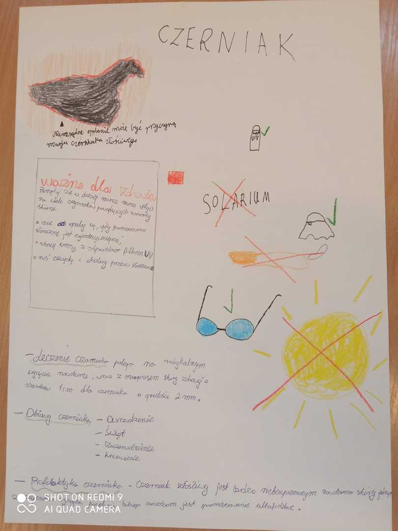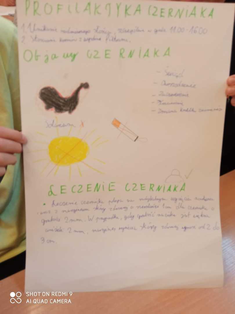 Uczniowie wykonali plakaty na temat czerniaka. Zamieścili na nich jego charakterystyczne cechy, ABCDE czerniaka, złote zasady ochrony przed czerniakiem oraz samobadanie skóry.