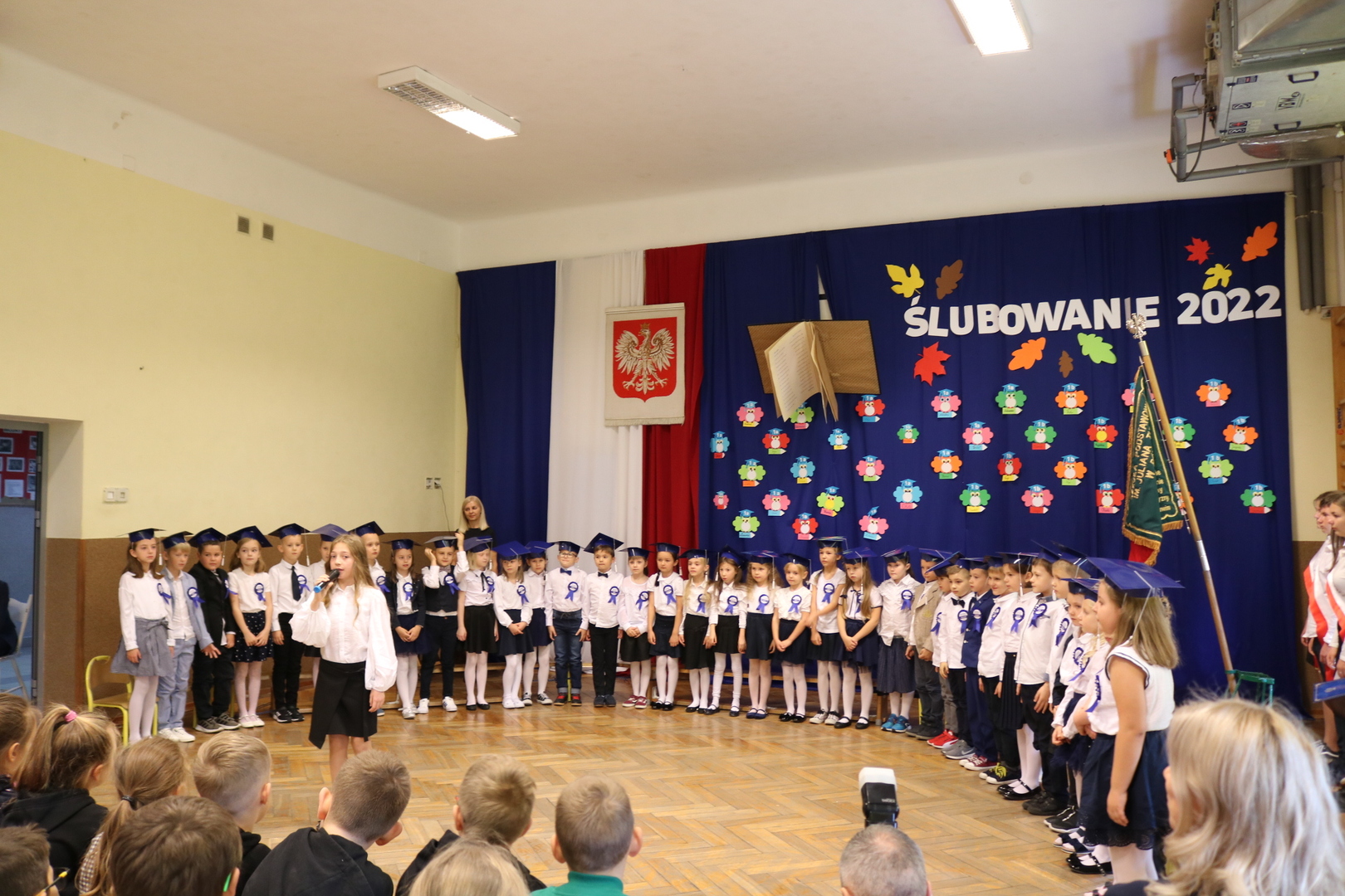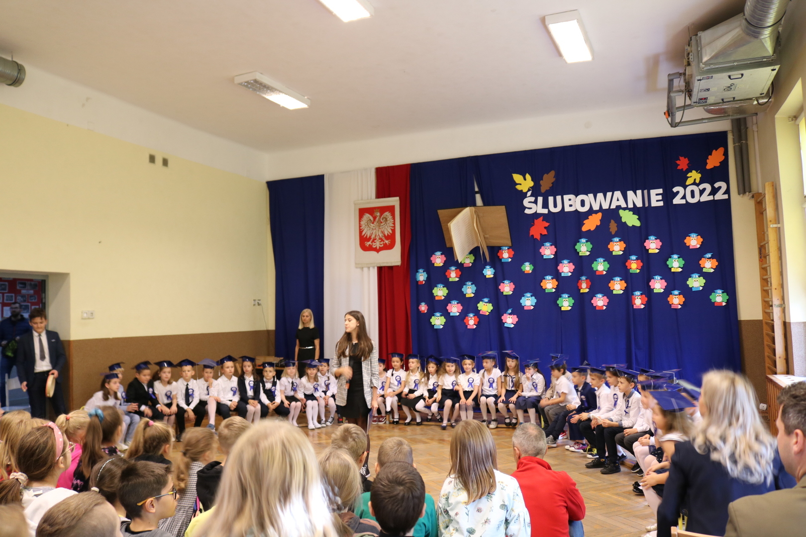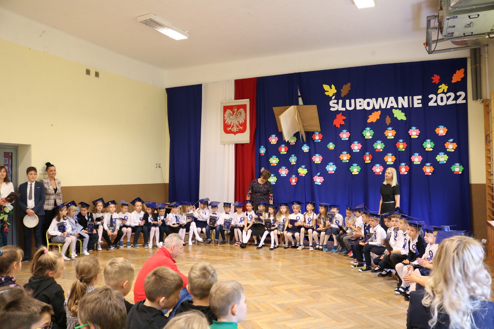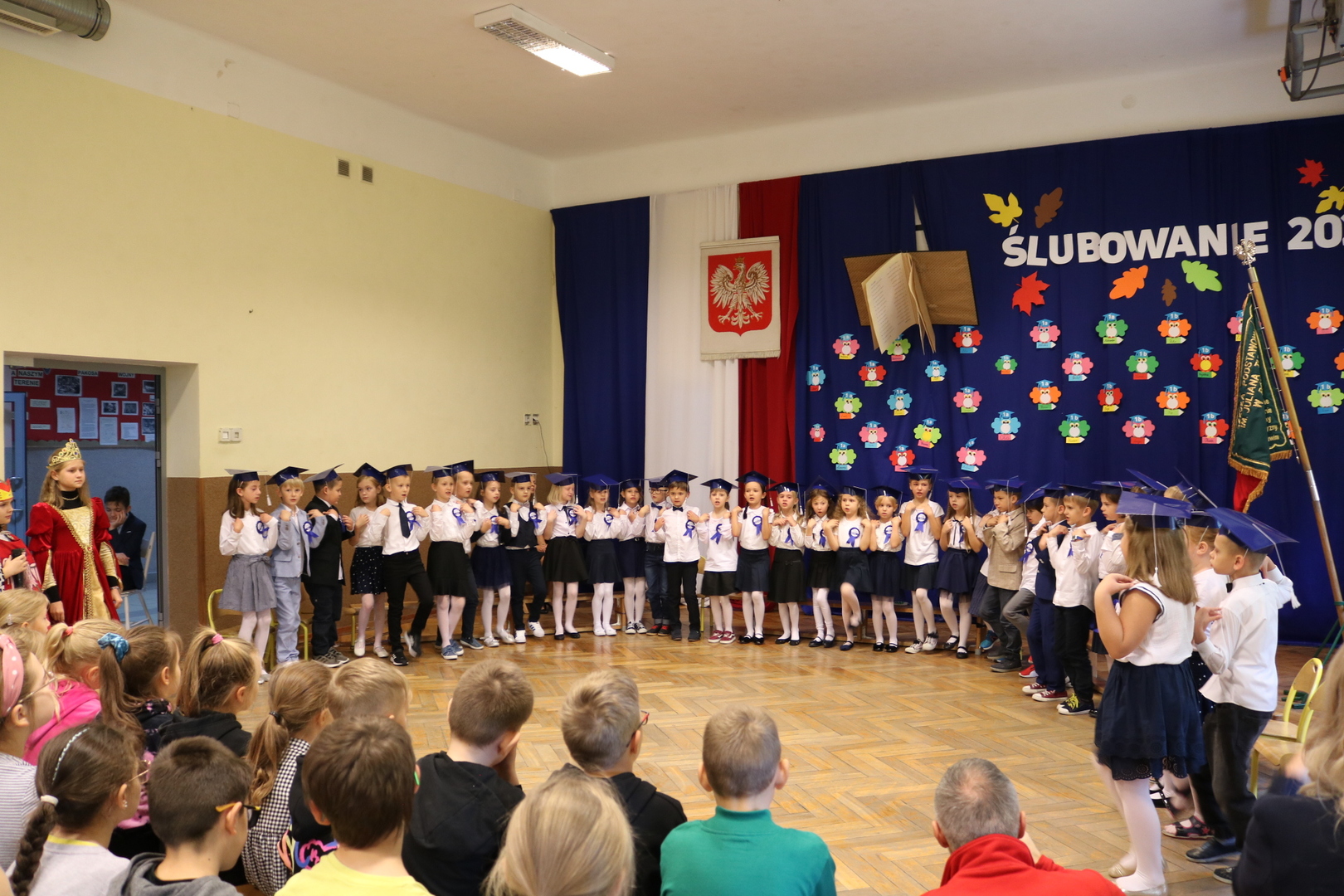 Ślubowanie klas pierwszych to jeden z ważniejszych dni w życiu każdej szkoły. Tego dnia pierwszoklasiści oficjalnie stają się uczniami. To bardzo ważny dzień nie tylko dla nich, ale także dla ich nauczycieli i rodziców. W piątek 21 października w poczet naszej szkoły zostało włączonych 37 uczniów. Pierwszoklasiści przygotowywali się do tej uroczystości od początku roku szkolnego. Pod okiem wychowawczyń - p. Zdzisławy Kupisz i p. Ewy Agier dzielnie uczyli się wierszy i piosenek, wytrwale ćwiczyli podczas prób. Swoje umiejętności zaprezentowali w czasie apelu.