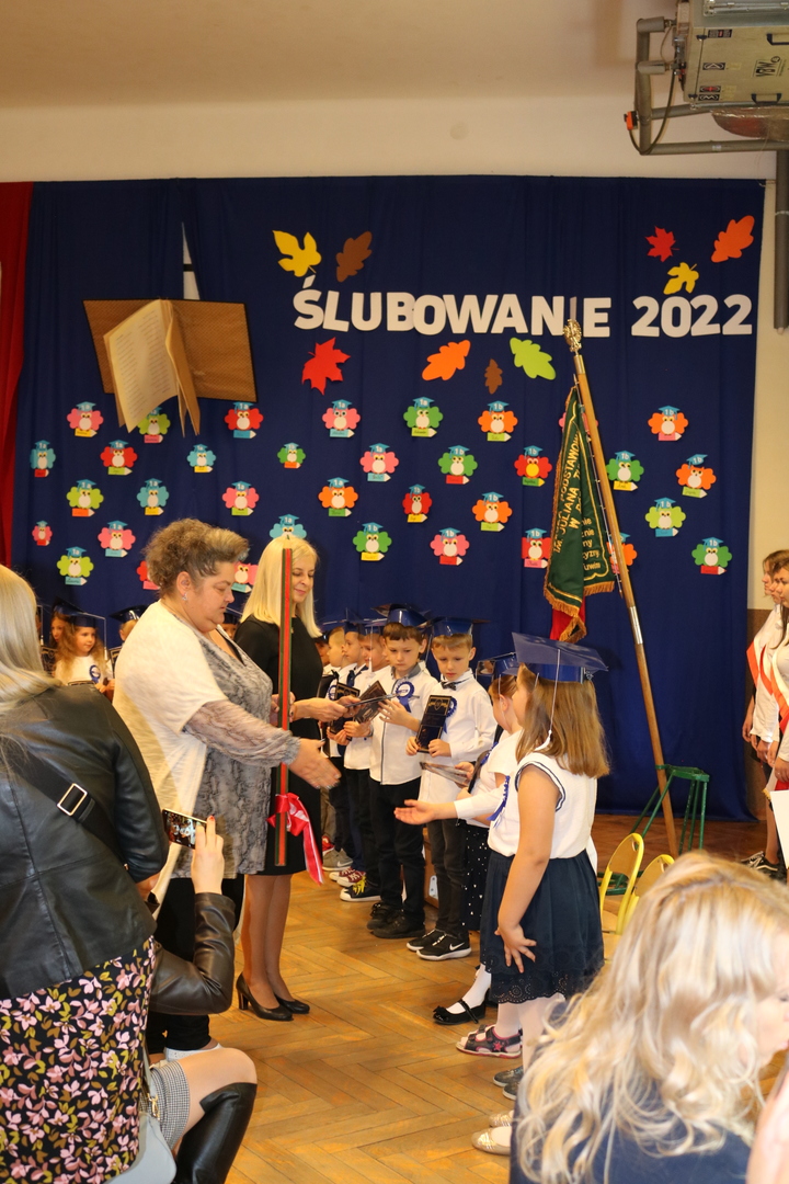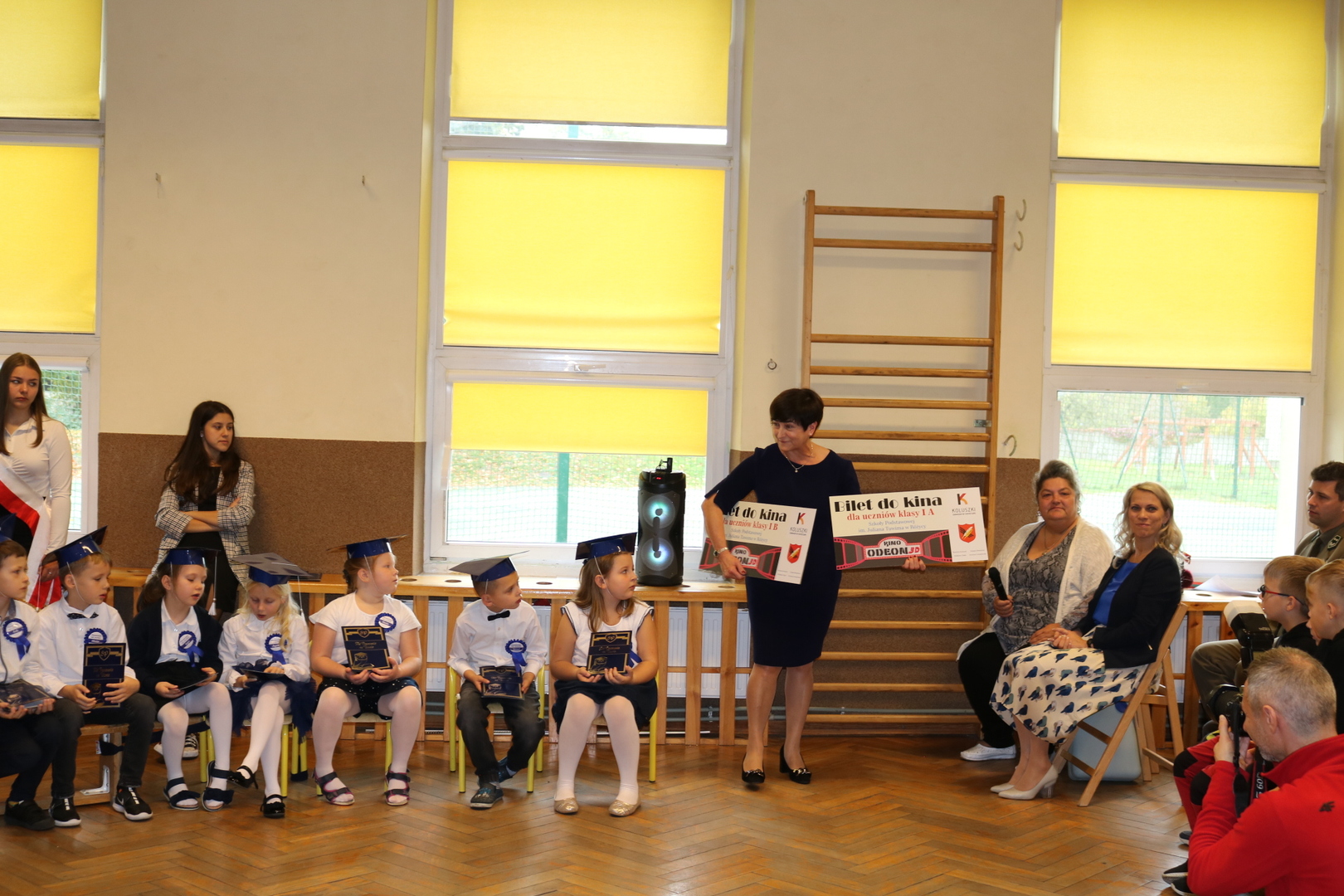 Po zakończonej części artystycznej w niezwykle podniosłej atmosferze, przed pocztem sztandarowym uczniowie ślubowali być dobrymi Polakami, godnie reprezentować swoją szkołę, swoim zachowaniem i nauką sprawiać radość rodzicom i nauczycielom. Po złożeniu ślubowania pani dyrektor Aneta Mrówka dokonała symbolicznego pasowania na ucznia. “Pasuję Cię na ucznia klasy pierwszej” - mówiła, dotykając ołówkiem ramion swoich podopiecznych. Na koniec głos zabrali zaproszeni goście. Pani Krystyna Lewandowska złożyła uczniom piękne życzenia oraz wręczyła bilety do Kina Odeon. Pani Małgorzata Kawczyńska - Paprocka, dyrektor Przedszkola w Różycy, nie kryjąc łez wzruszenia, życzyła uczniom by na ich edukacyjnej drodze nigdy nie zabrakło uśmiechu i radości.