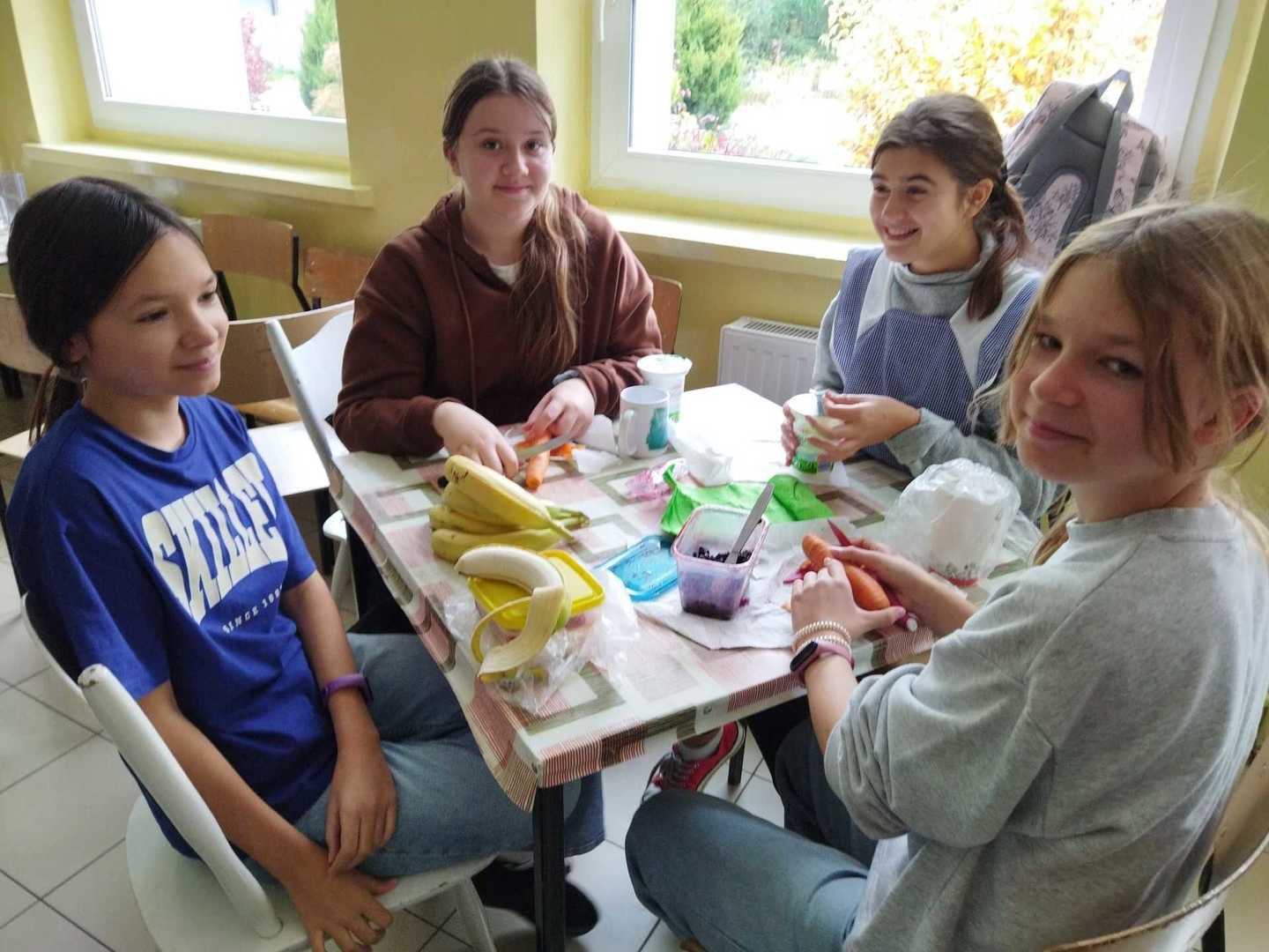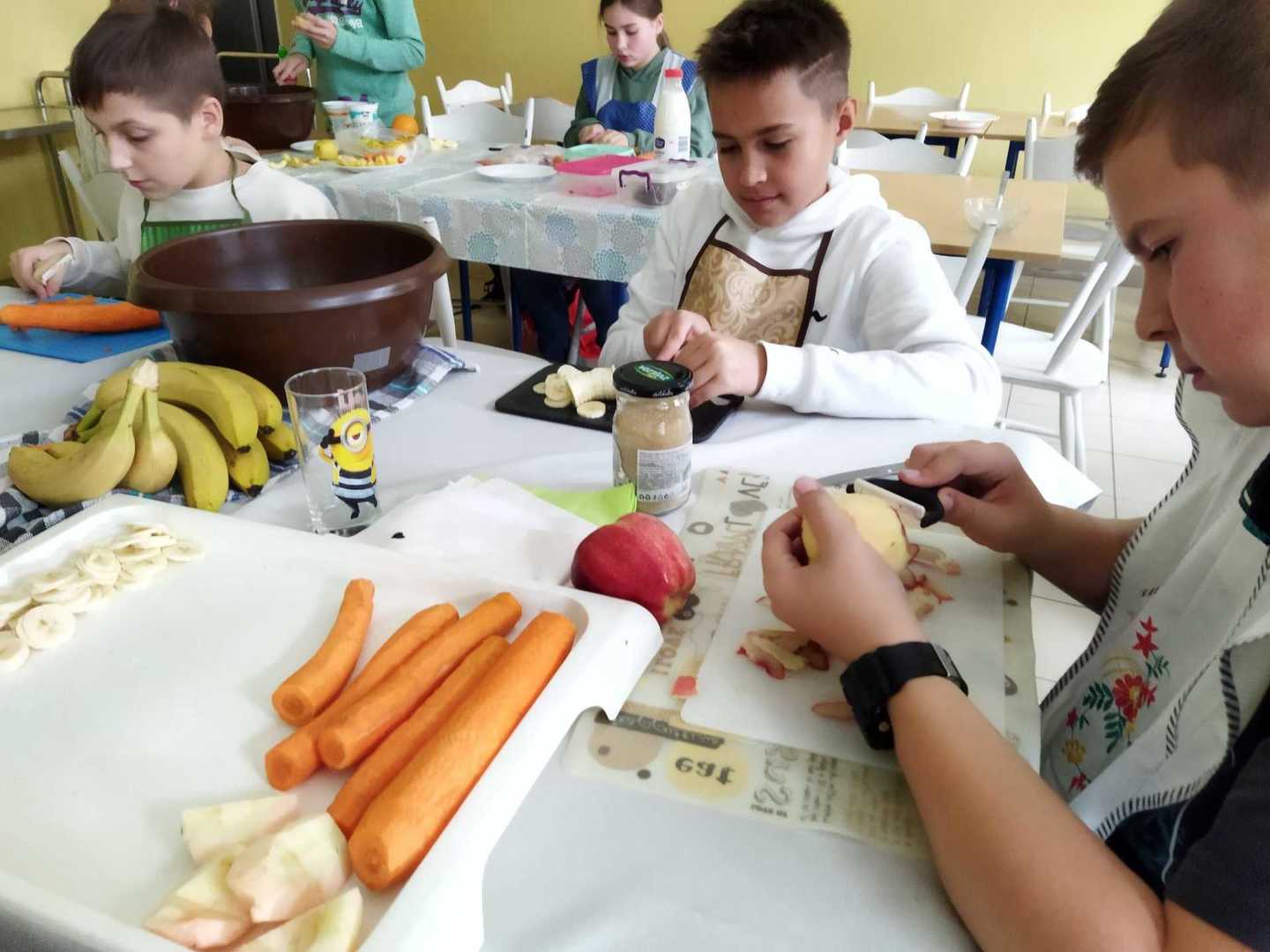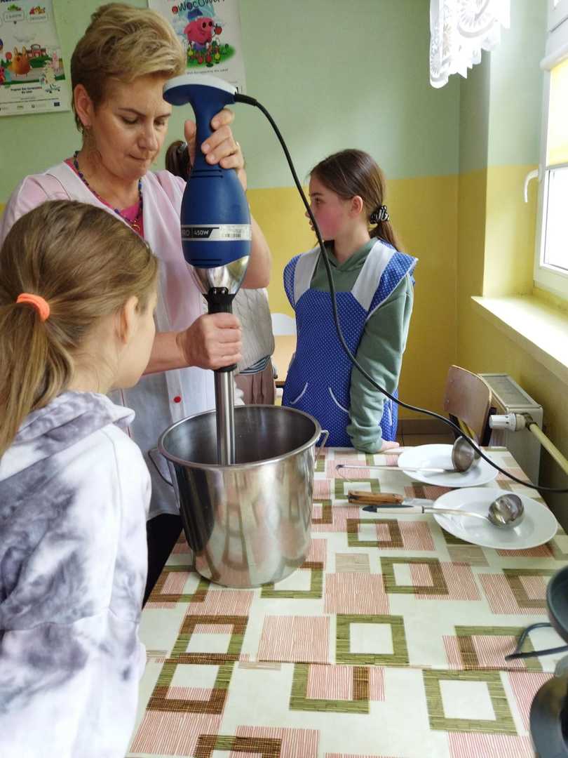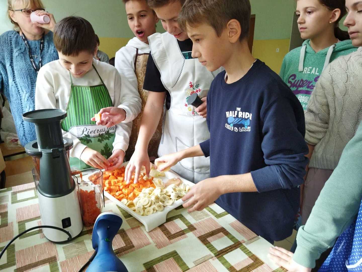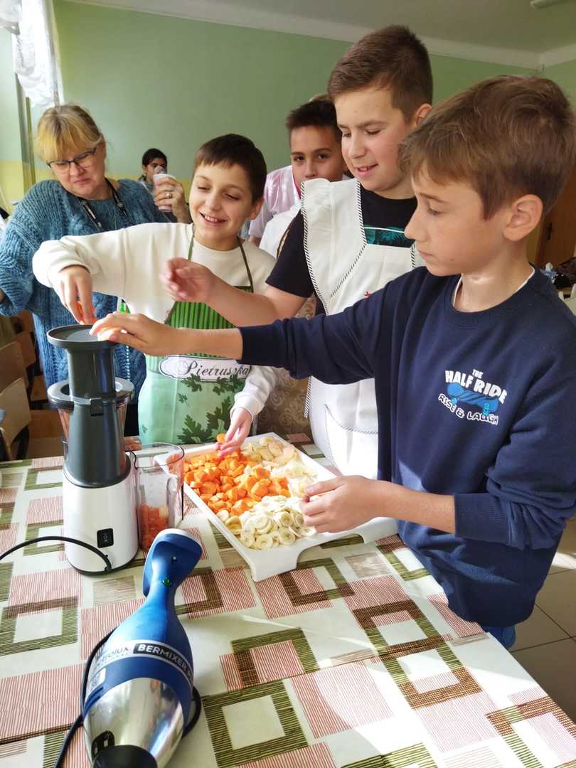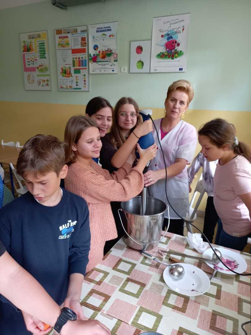 Pani Jolanta Piasecka, nauczyciel techniki i pedagog szkolny, zaproponowała swoim uczniom przeprowadzenie zajęć, na których będą wykonywali soki owocowo-warzywne i koktajle. Szóstoklasistom bardzo spodobał się ten pomysł . Zajęcia odbyły się 19.10.22 r. Prowadziły je p. Piasecka i p. Marczyk . W działania włączyła się także wychowawczyni klasy pani Ewa Pietrzyk. Pani Marczyk opowiedziała dzieciom o zdrowotnych walorach spożywania owoców i warzyw. Uczniowie zaangażowali się w przygotowanie koktajli i soków. Na koniec nastąpiła degustacja. Poczęstowani zostali również pracownicy szkoły i pani dyrektor. Soki i koktajle były przepyszne. Uczniowie dziękują pani Piaseckiej za tak interesującą lekcję, pani Marczyk za fachowe rady i udostępnienie szkolnej stołówki, pani Pietrzyk za pomoc i wsparcie.