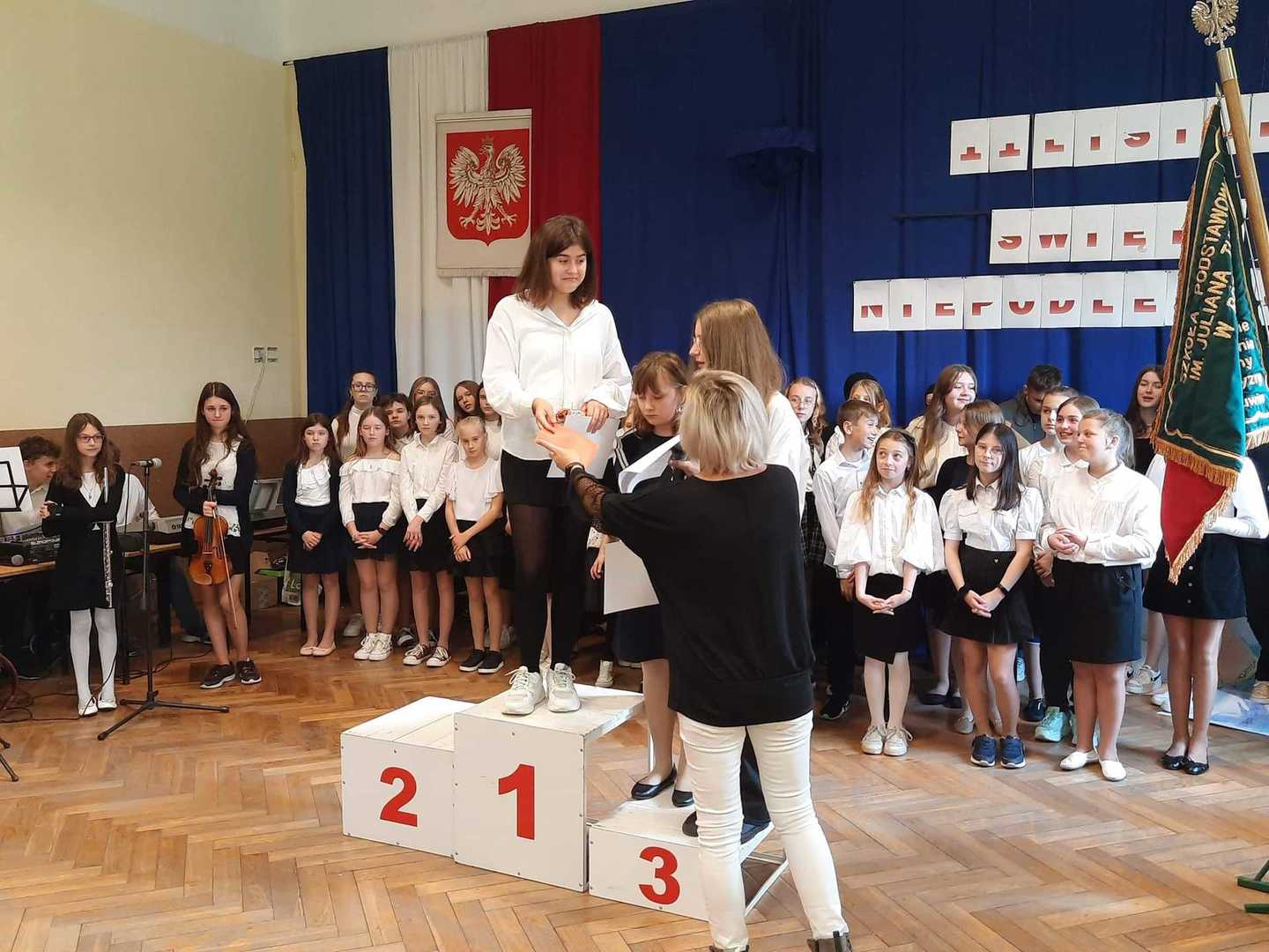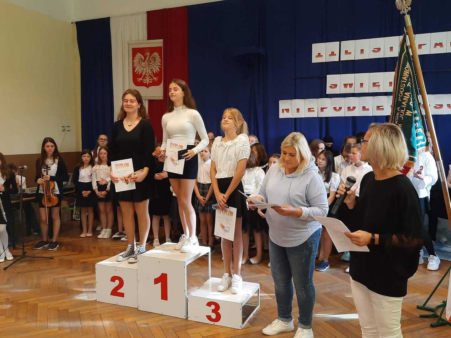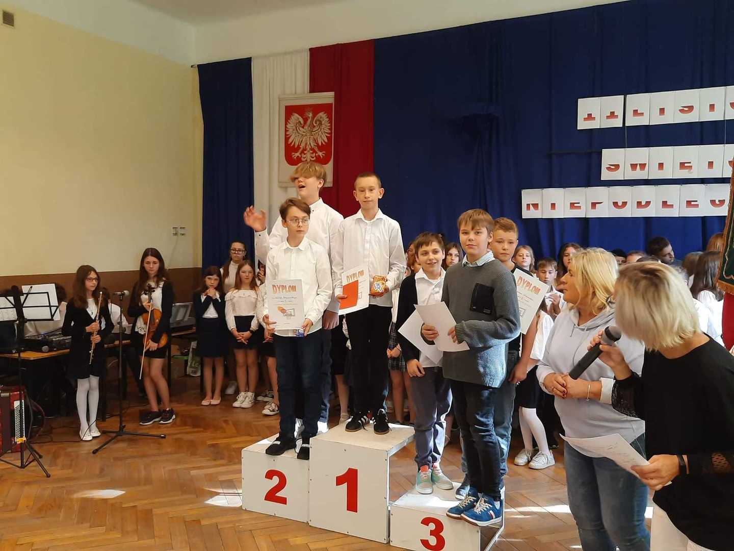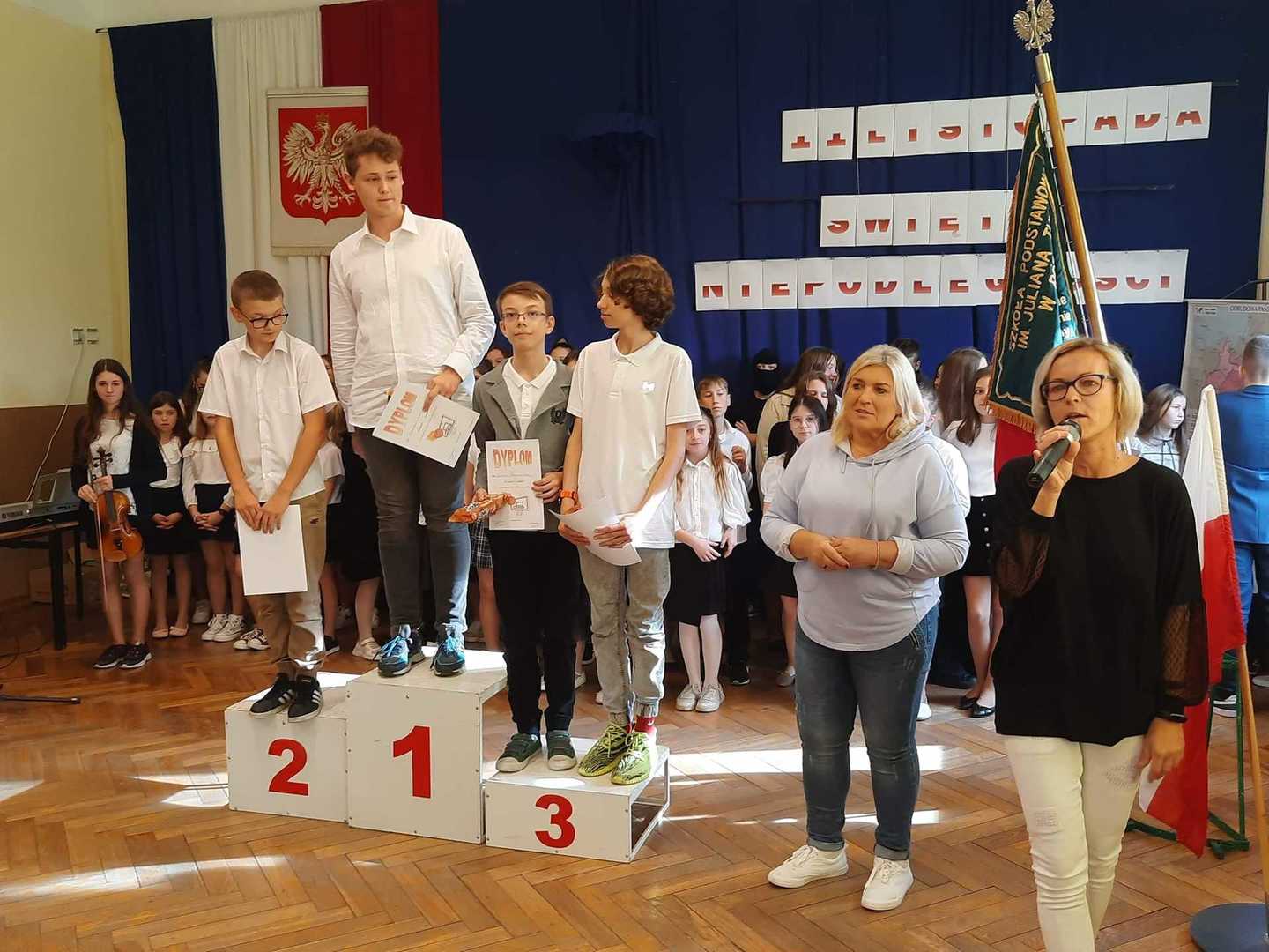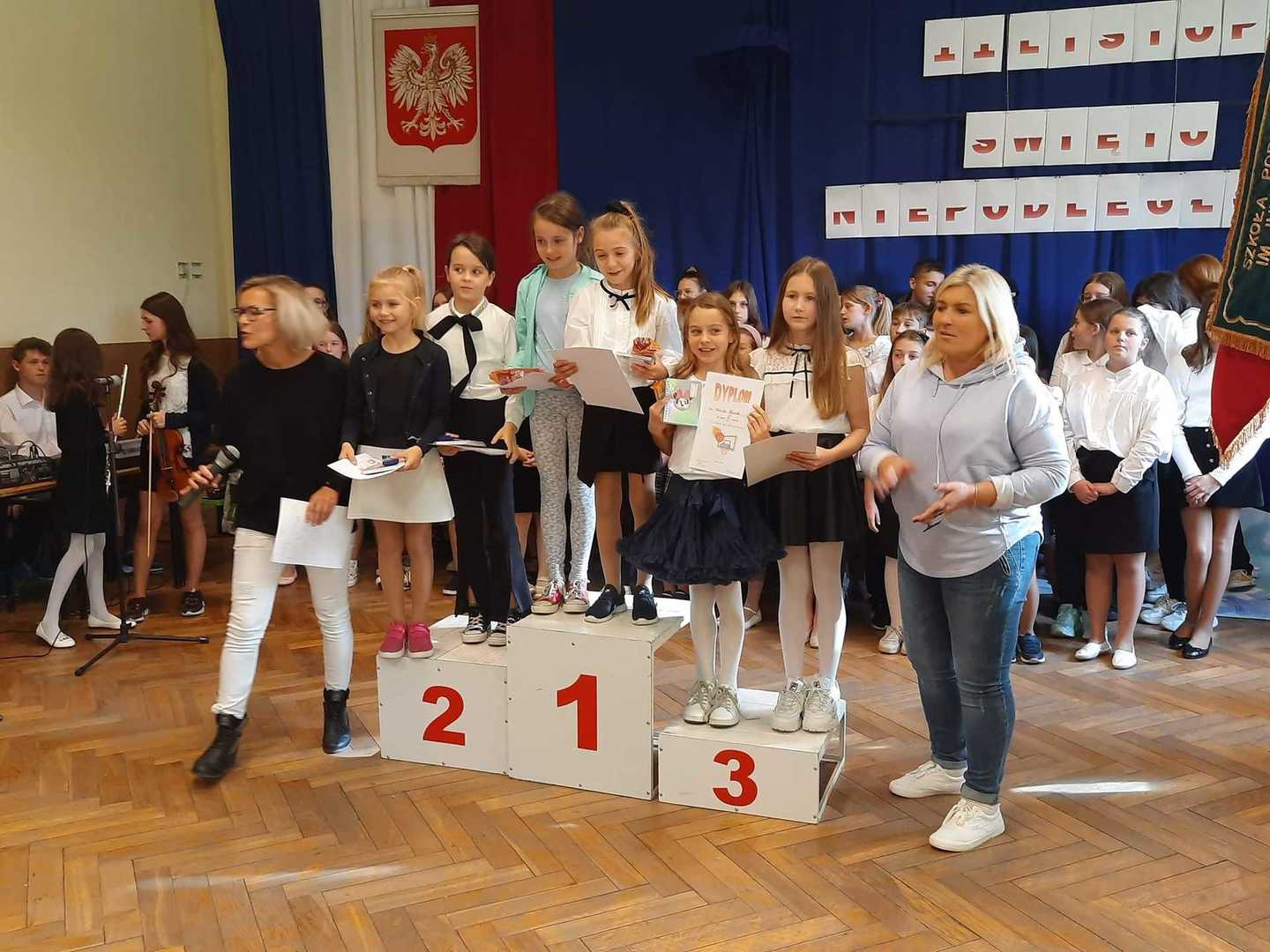W dniu dzisiejszym po uroczystej akademii, został roztrzygnięty konkurs sportowy, który był organizowany przez panią D.Wilkowiecką i panią A.Kołodziejczyk podczas długich przerw. Konkurencja polegała na rzutach do kosza w czasie 1 min.