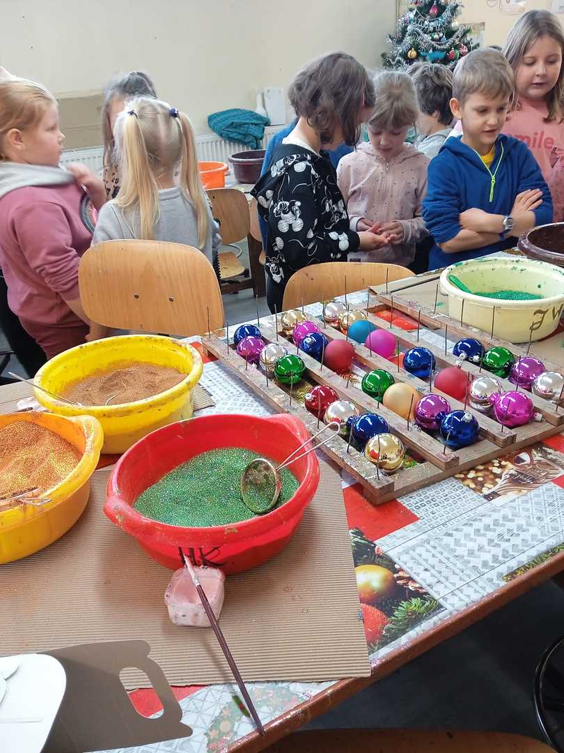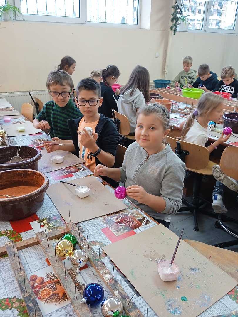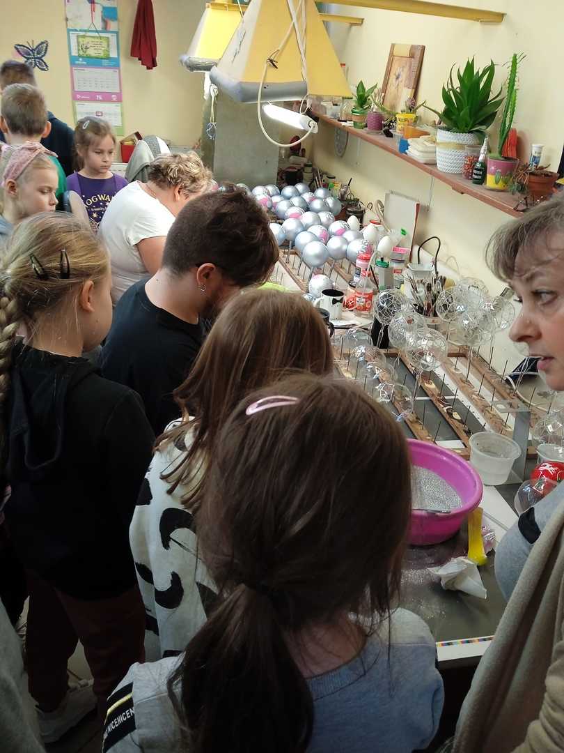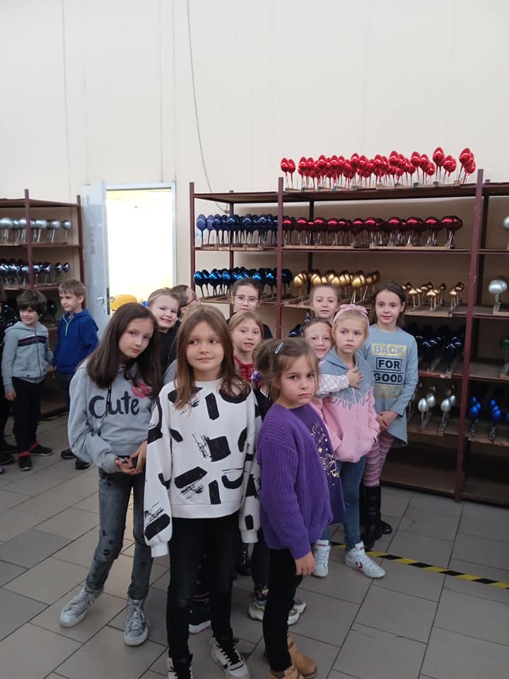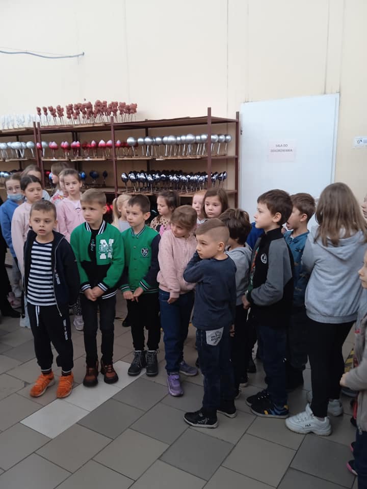 10.11.2022 r. klasa 1b oraz 2b wraz z wychowawczyniami, p.Ewą Agier, p.Justyną Brzezińską oraz bibliotekarką, nauczycielką świetlicy p.Grażyną Welc, wybrały się do fabryki bombek mieszczącej się w Piotrkowie Trybunalskim. Uczniowie mogli zobaczyć bardzo ciekawy, wieloetapowy i pracochłonny proces wytwarzania bombek. Na początku dzieci miały okazję zobaczyć z bliska w jaki sposób wydmuchiwane są bombki oraz jak nadawane są im przeróżne kształty. Dowiedziały się,że srebrne bombki są barwione od środka mieszanką azotanu srebra i glukozy, natomiast barwienie kolorowych bombek odbywa się poprzez ich zanurzanie w wybranym kolorze farby. Obserwowały kolejny etap produkcji, czyli suszenie bombek w bardzo wysokiej temperaturze. Uczniowie odwiedzili również dekoratornię, w której odbywa się ręczne malowanie i ozdabianie zabarwionych bombek. Końcowym etapem wycieczki były warsztaty, podczas których dzieci miały możliwość samodzielnego malowania i dekorowania bombek. Powstały piękne i niepowtarzalne ozdoby, które każde dziecko otrzymało jako pamiątkę z wycieczki. Przed odjazdem odwiedziliśmy również sklepik, gdzie dzieci mogły zakupić upominki dla najbliższych.