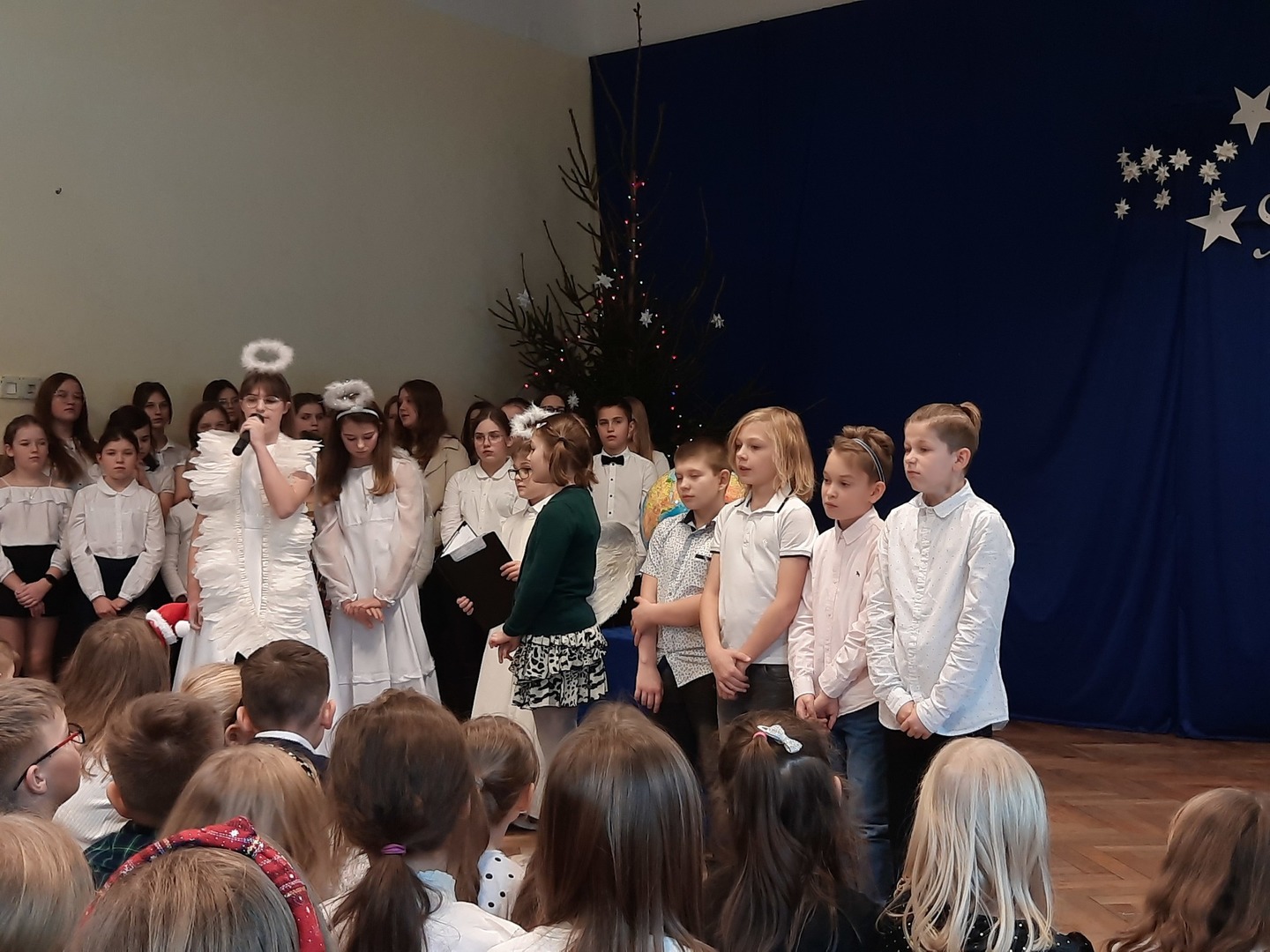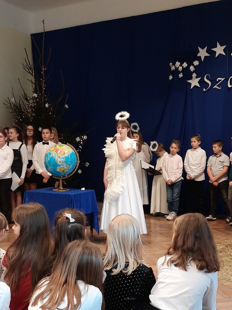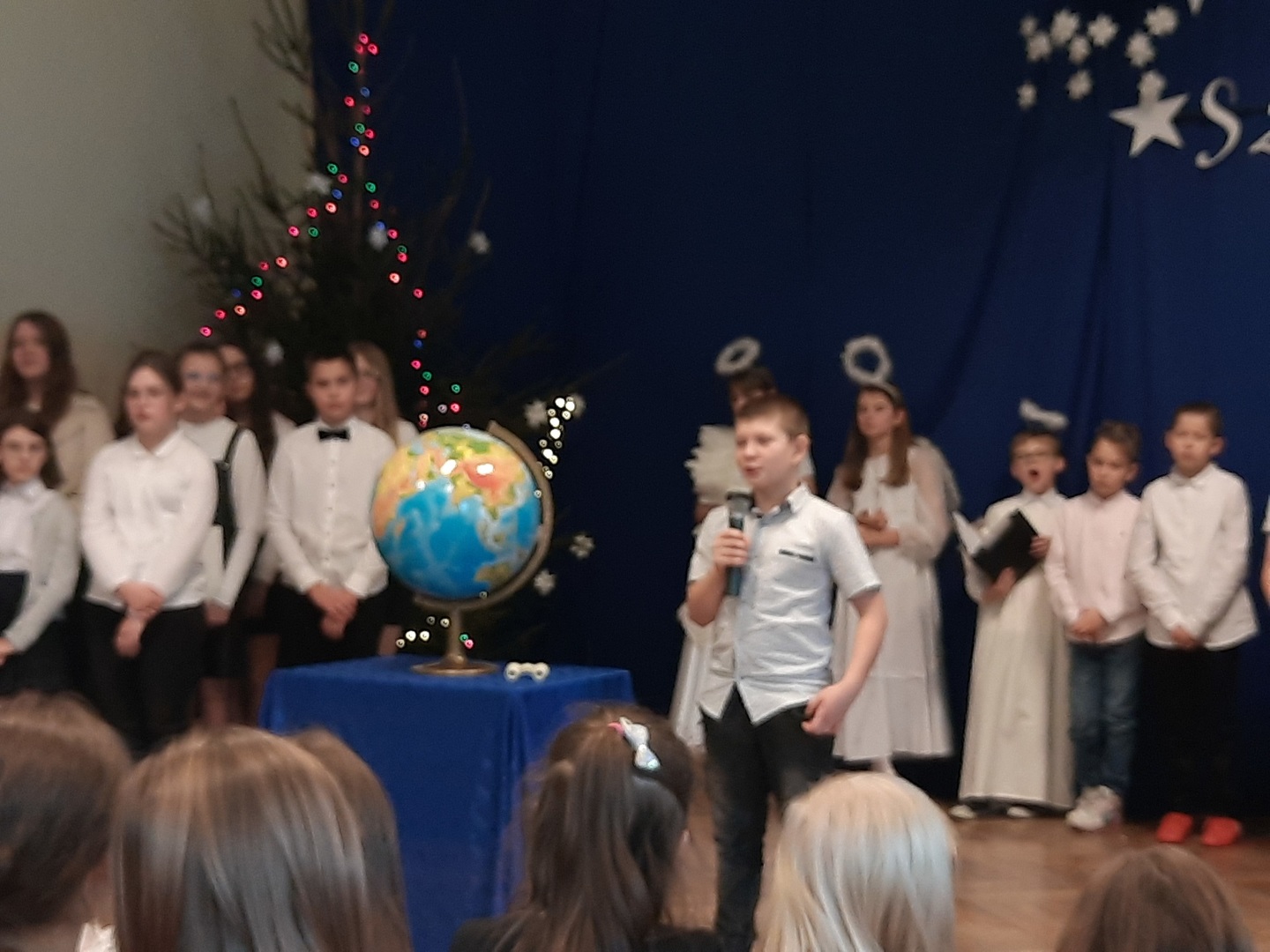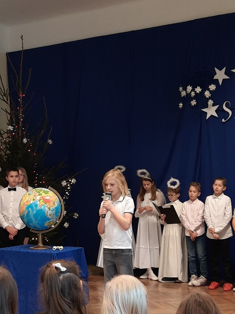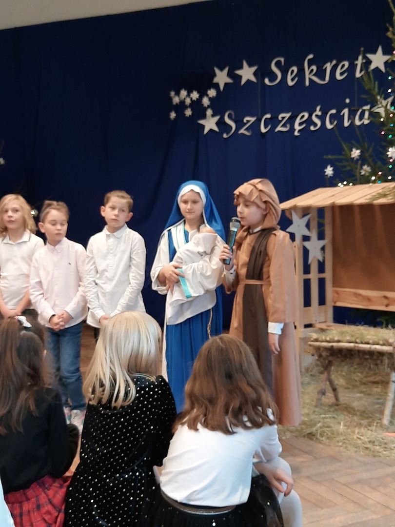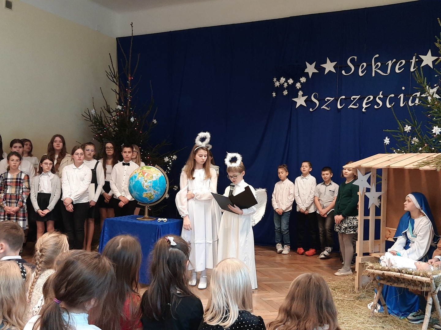 W naszej szkole z okazji świąt Bożego Narodzenia odbyło się przestawienie przygotowane przez uczniów klasy 4a pod kierunkiem pana Adriana Krawczyka. Aktorzy wcielając się m. in. w rolę aniołów, dzieci i Świętej Rodziny wprowadzili wszystkich gości w istotę Świąt. "Jezus- to sekret szczęścia. Przyjmij Jezusa do swego serca!"- wymownie wybrzmiało przesłanie sztuki. Przedstawienie uświetnił śpiew chóru przygotowany przez panią Janinę Wiśnik. Dekorację wykonała pani Ewa Pietrzyk.