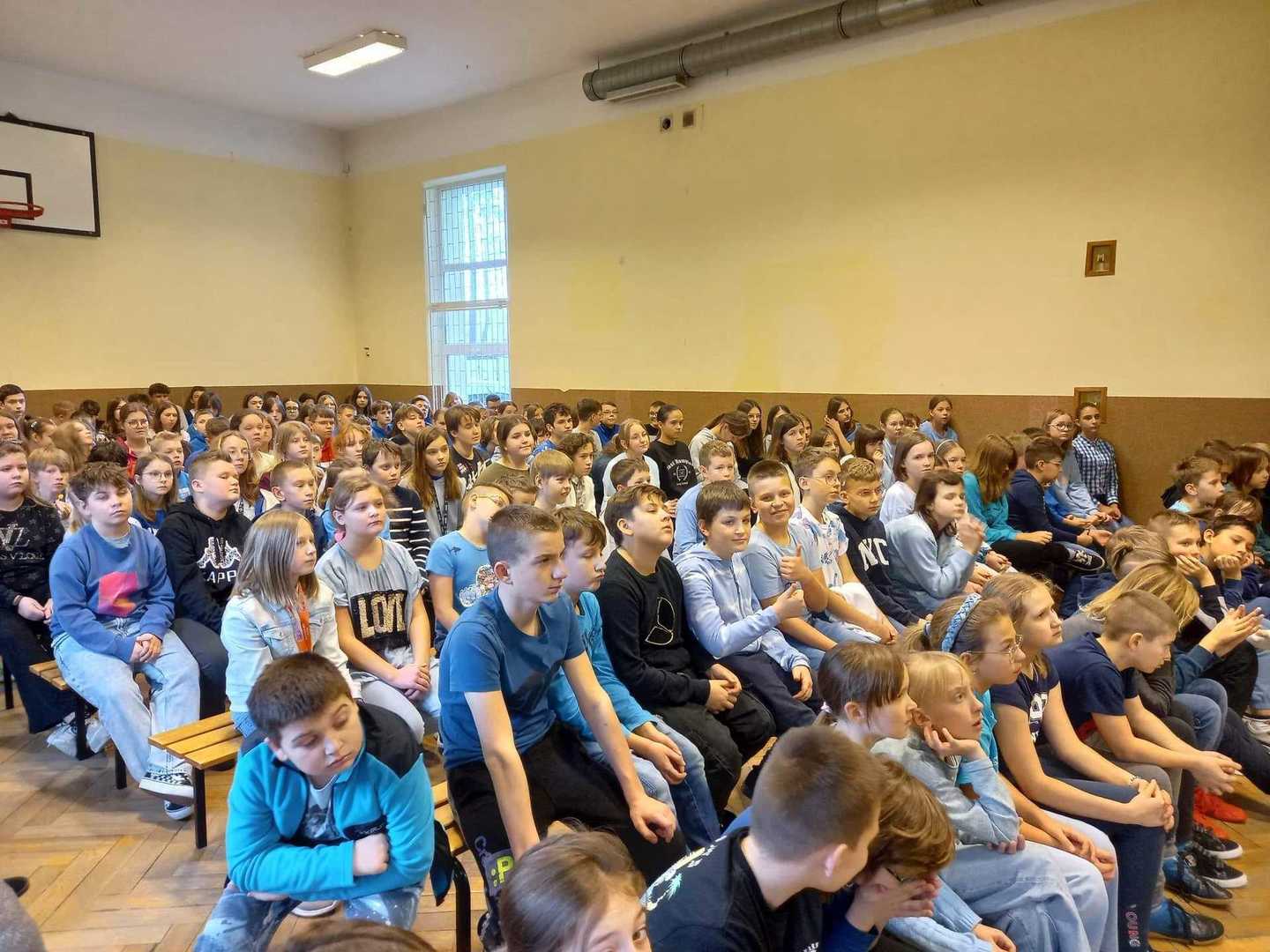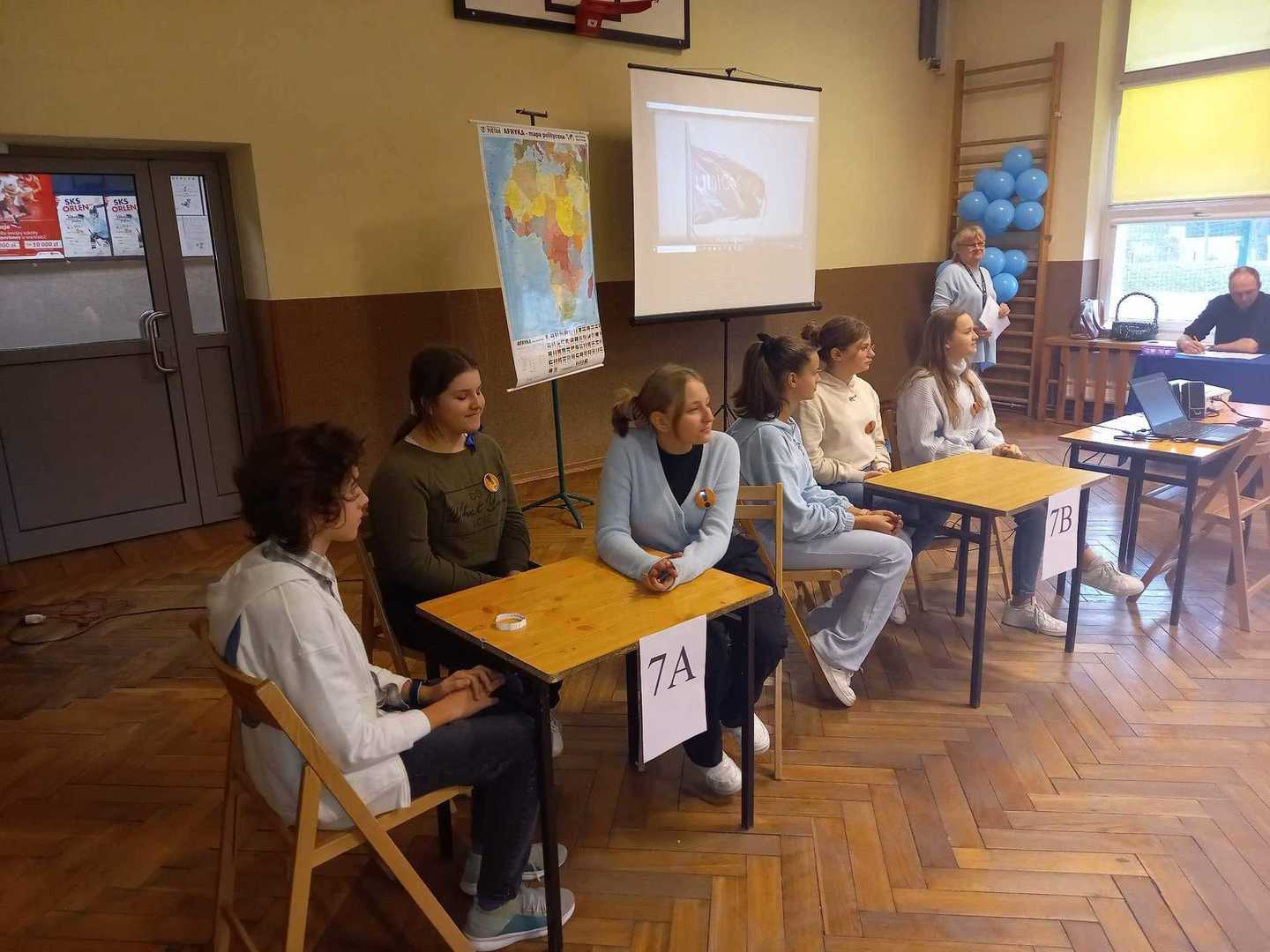 11 stycznia odbył się w naszej szkole apel. Uczniowie klasy 4 -8 zostali zapoznani z działalnością organizacji UNICEF oraz Szkolnego Koła Młodych UNICEF. W ramach współpracy z UNICEF w naszej szkole realizowany jest projekt ,,Na ratunek dzieciom w Rogu Afryki". Podczas apelu odbył się również konkurs wiedzy o UNICEF pomiędzy drużynami z klas 7a i 7b. Rywalizacja była zacięta. Ostatecznie różnicą zaledwie 2 punktów wygrała klasa 7a.