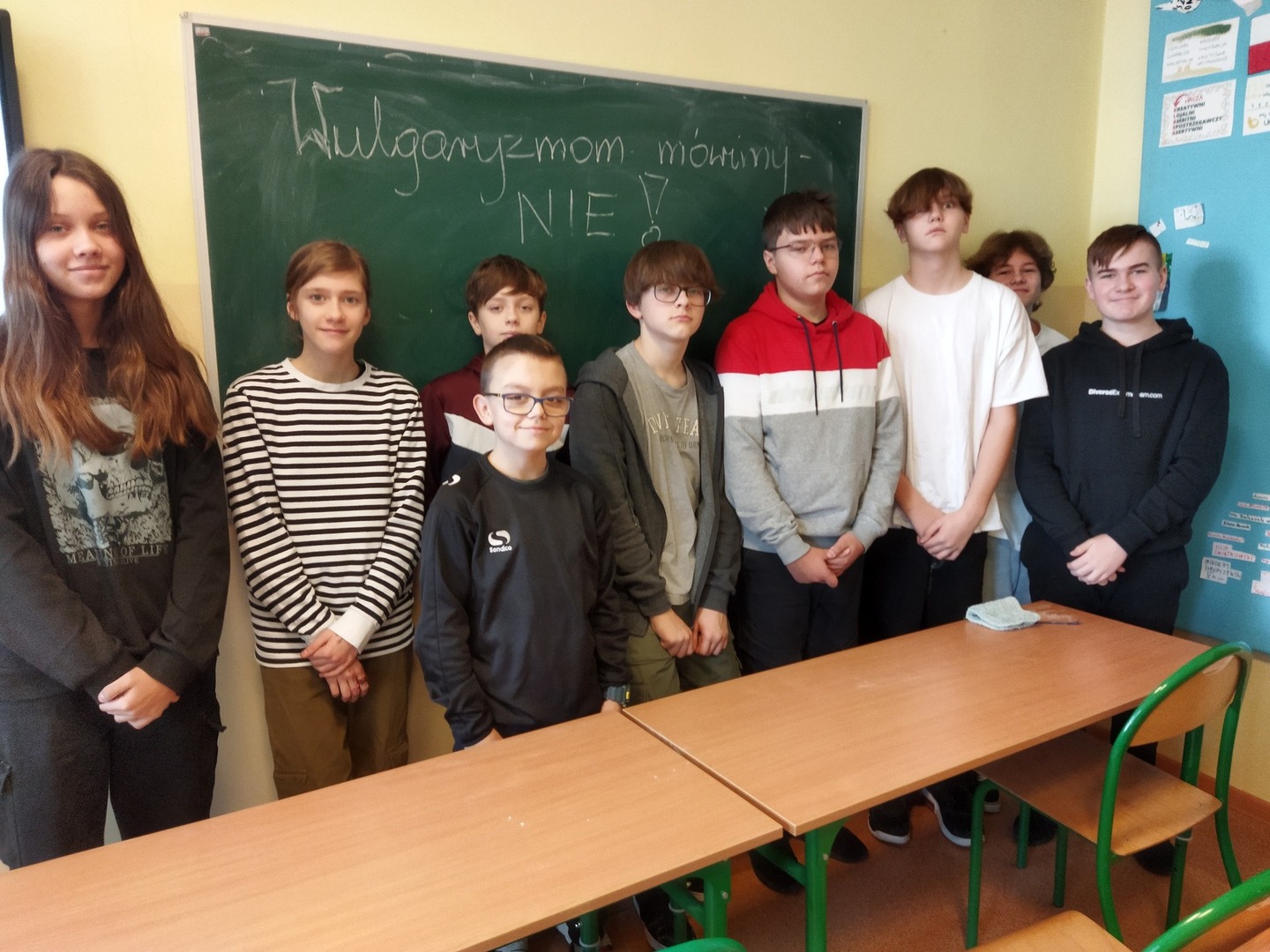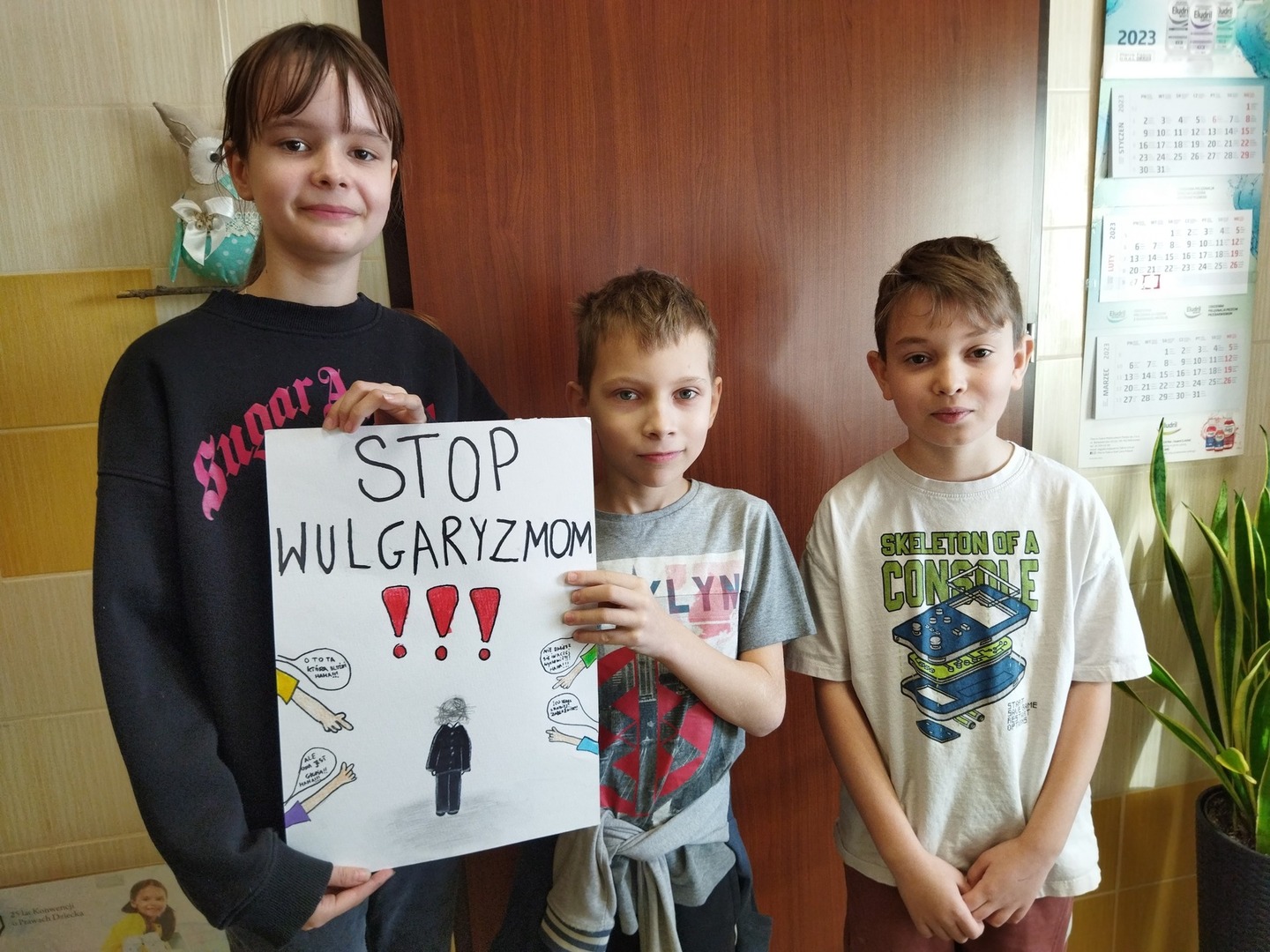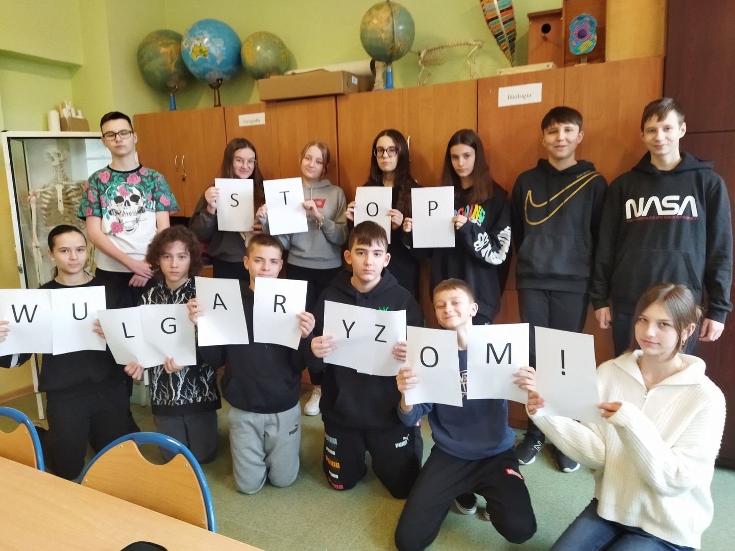 Obecnie dzieci i młodzież cieszą się większą swobodą niż dawniej. Poprzez łatwy dostęp do środków masowego przekazu, szczególnie programów telewizyjnych i Internetu, które uczniowie przeglądają przypadkowo, bez selekcji, nierzadko natrafiając na kanały promujące przemoc i hate, zwiększa się ich poziom agresji, w tym tej słownej. Ogromny jest też wpływ koleżanek i kolegów z grup rówieśniczych, a także brak czasu rodziców, opiekunów i członków rodziny, który ogranicza najmłodszym rozmowy z bliskimi. Te wszystkie elementy wpływają na niedbałość o kulturę języka i używanie wulgaryzmów już wśród uczniów szkół podstawowych. Pragnąc wyjść naprzeciw tym problemom, z inicjatywy pedagoga szkolnego – p. Jolanty Piaseckiej, powstał w naszej szkole najnowszy projekt o charakterze profilaktycznym zatytułowany: „Wulgaryzmom mówimy NIE”. Ma on na celu ograniczenie występowania agresji słownej, a także poprawę relacji interpersonalnych w klasach, między uczniami oraz między uczniami i ich bliskimi. W ramach projektu, przez cały czas jego trwania, a więc przeszło dwa miesiące, zorganizowano szereg działań. W pierwszym etapie każda klasa z 4 - 8 wybrała swojego przedstawiciela, bądź przedstawicieli, którzy ich zdaniem nie stosują wulgaryzmów i przekleństw w codziennym życiu. Te właśnie osoby wzięły udział w kampanii profilaktycznej pod hasłem – „Postaw na swój wizerunek" – jej efektem jest filmik edukacyjny, propagujący kulturę żywego słowa. Co więcej, we wszystkich zespołach klasowych odbyły się warsztaty profilaktyczne, podczas których uczniowie pilnie słuchali, pracowali, a także brali czynny udział w dyskusji oraz proponowanych przez panią pedagog zadaniach. Powstały także plakaty nawiązujące swą tematyką do niestosowania wulgaryzmów, zarówno w szkole jaki i poza nią.