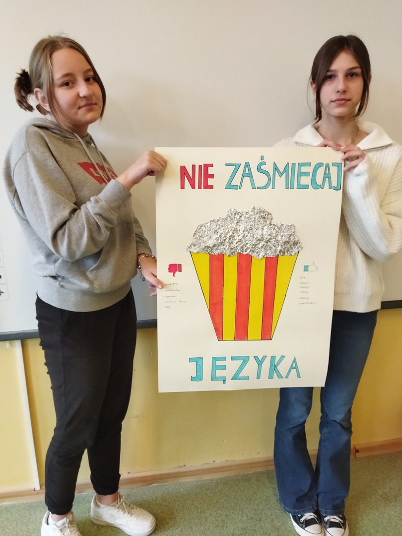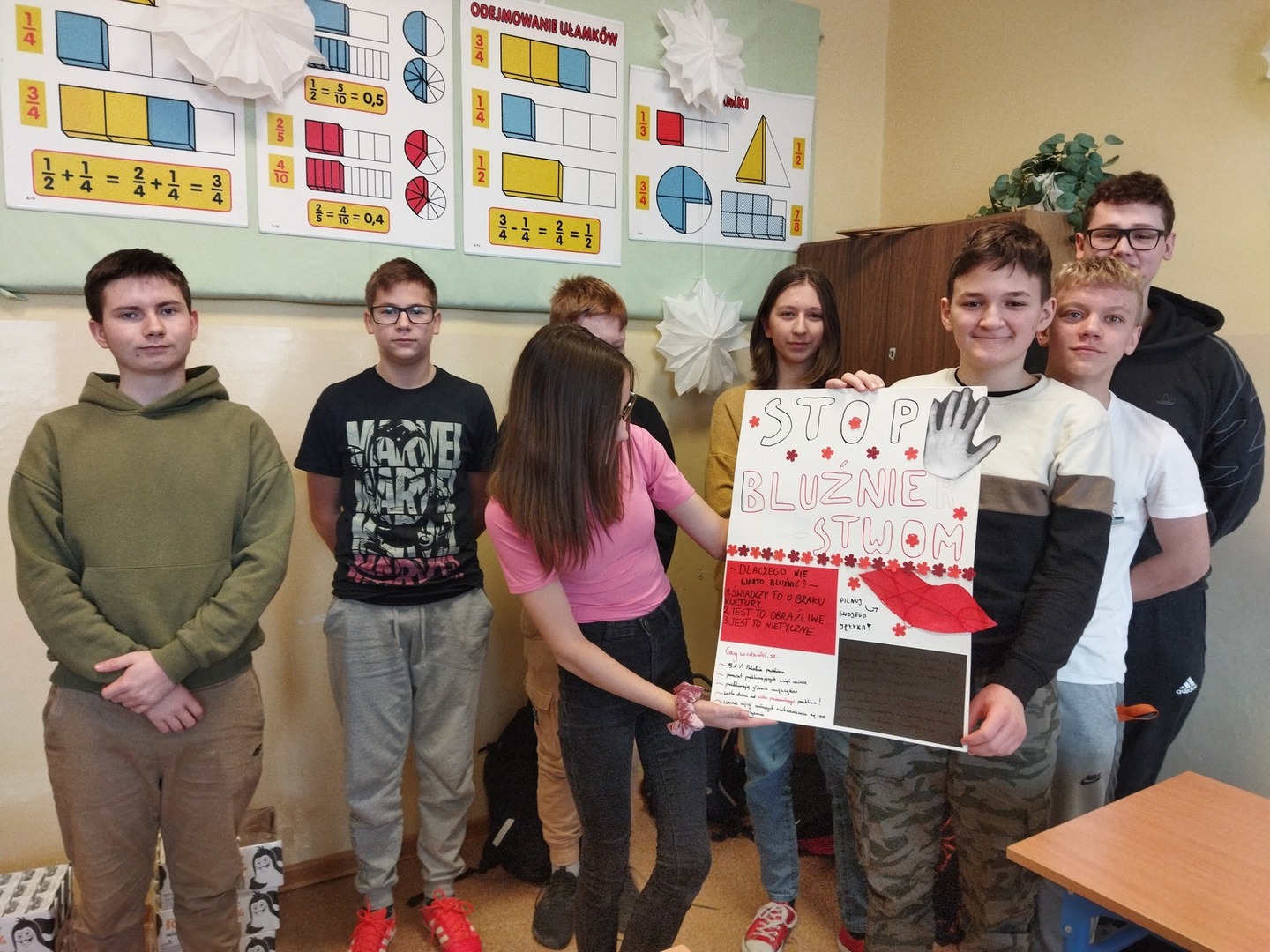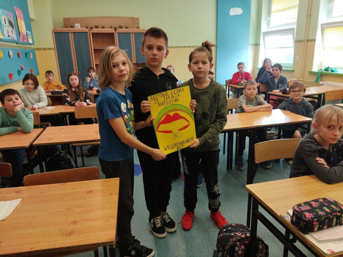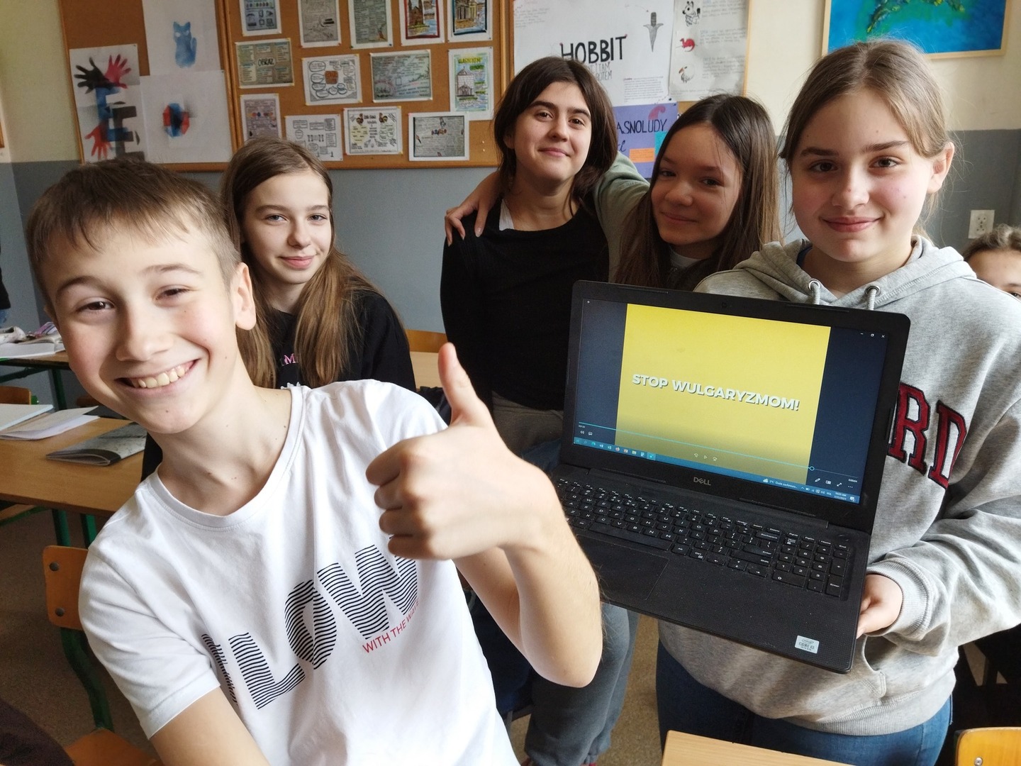 Obecnie dzieci i młodzież cieszą się większą swobodą niż dawniej. Poprzez łatwy dostęp do środków masowego przekazu, szczególnie programów telewizyjnych i Internetu, które uczniowie przeglądają przypadkowo, bez selekcji, nierzadko natrafiając na kanały promujące przemoc i hate, zwiększa się ich poziom agresji, w tym tej słownej. Ogromny jest też wpływ koleżanek i kolegów z grup rówieśniczych, a także brak czasu rodziców, opiekunów i członków rodziny, który ogranicza najmłodszym rozmowy z bliskimi. Te wszystkie elementy wpływają na niedbałość o kulturę języka i używanie wulgaryzmów już wśród uczniów szkół podstawowych. Pragnąc wyjść naprzeciw tym problemom, z inicjatywy pedagoga szkolnego – p. Jolanty Piaseckiej, powstał w naszej szkole najnowszy projekt o charakterze profilaktycznym zatytułowany: „Wulgaryzmom mówimy NIE”. Ma on na celu ograniczenie występowania agresji słownej, a także poprawę relacji interpersonalnych w klasach, między uczniami oraz między uczniami i ich bliskimi. W ramach projektu, przez cały czas jego trwania, a więc przeszło dwa miesiące, zorganizowano szereg działań. W pierwszym etapie każda klasa z 4 - 8 wybrała swojego przedstawiciela, bądź przedstawicieli, którzy ich zdaniem nie stosują wulgaryzmów i przekleństw w codziennym życiu. Te właśnie osoby wzięły udział w kampanii profilaktycznej pod hasłem – „Postaw na swój wizerunek" – jej efektem jest filmik edukacyjny, propagujący kulturę żywego słowa. Co więcej, we wszystkich zespołach klasowych odbyły się warsztaty profilaktyczne, podczas których uczniowie pilnie słuchali, pracowali, a także brali czynny udział w dyskusji oraz proponowanych przez panią pedagog zadaniach. Powstały także plakaty nawiązujące swą tematyką do niestosowania wulgaryzmów, zarówno w szkole jaki i poza nią.
