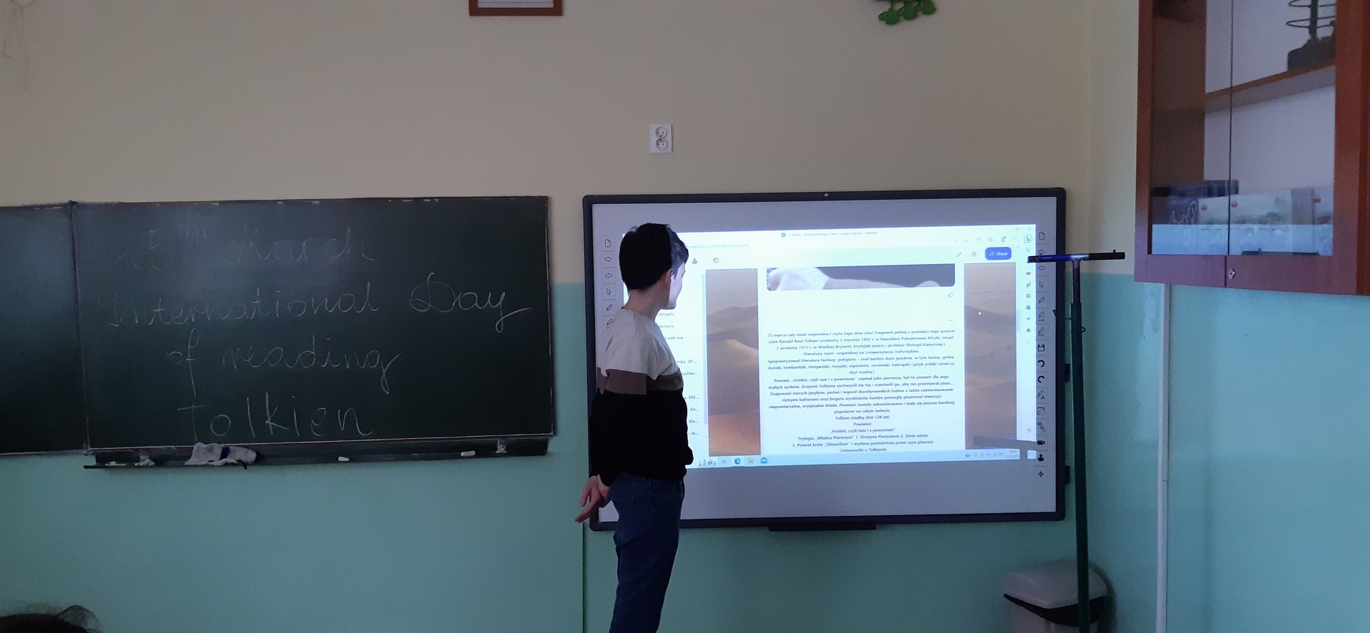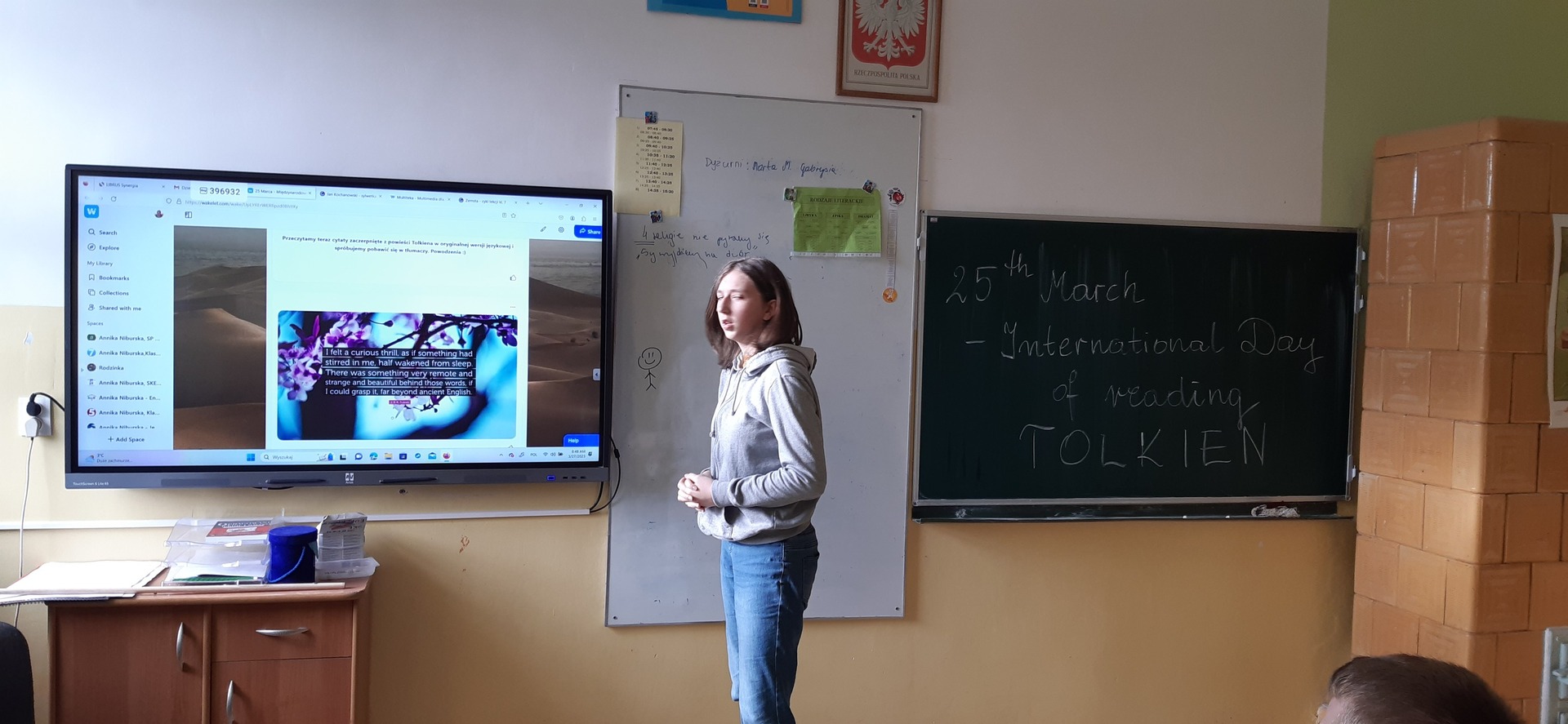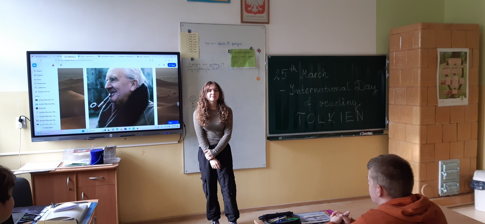 25 marca obchodzimy Międzynarodowy Dzień Czytania Tolkiena. To nie lada gratka dla wszystkich miłośników fantastyki. Włączyli się do tego wydarzenia ósmoklasiści, czytając dziś – 27.03 - fragmenty utworów pisarza w oryginale i tłumacząc je na język polski. Święto organizowane jest przez brytyjskie Towarzystwo Tolkienowskie (The Tolkien Society) od 2003 r., a od kilku lat obchodzone jest także w naszym kraju. W tym dniu fani Tolkiena na całym świecie organizują wydarzenia kulturalne, spotkania literackie, a także konkursy i akcje zachęcające do sięgnięcia po prozę mistrza fantasy. Tu możecie zapoznać się z prezentacją na temat autora „Władcy pierścieni”: https://wakelet.com/wake/UpLYRErWERfipzd0Bh9Xy