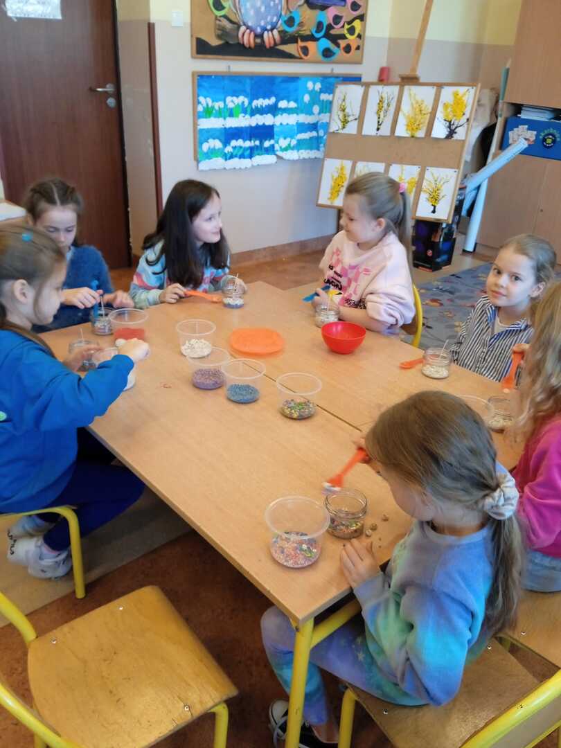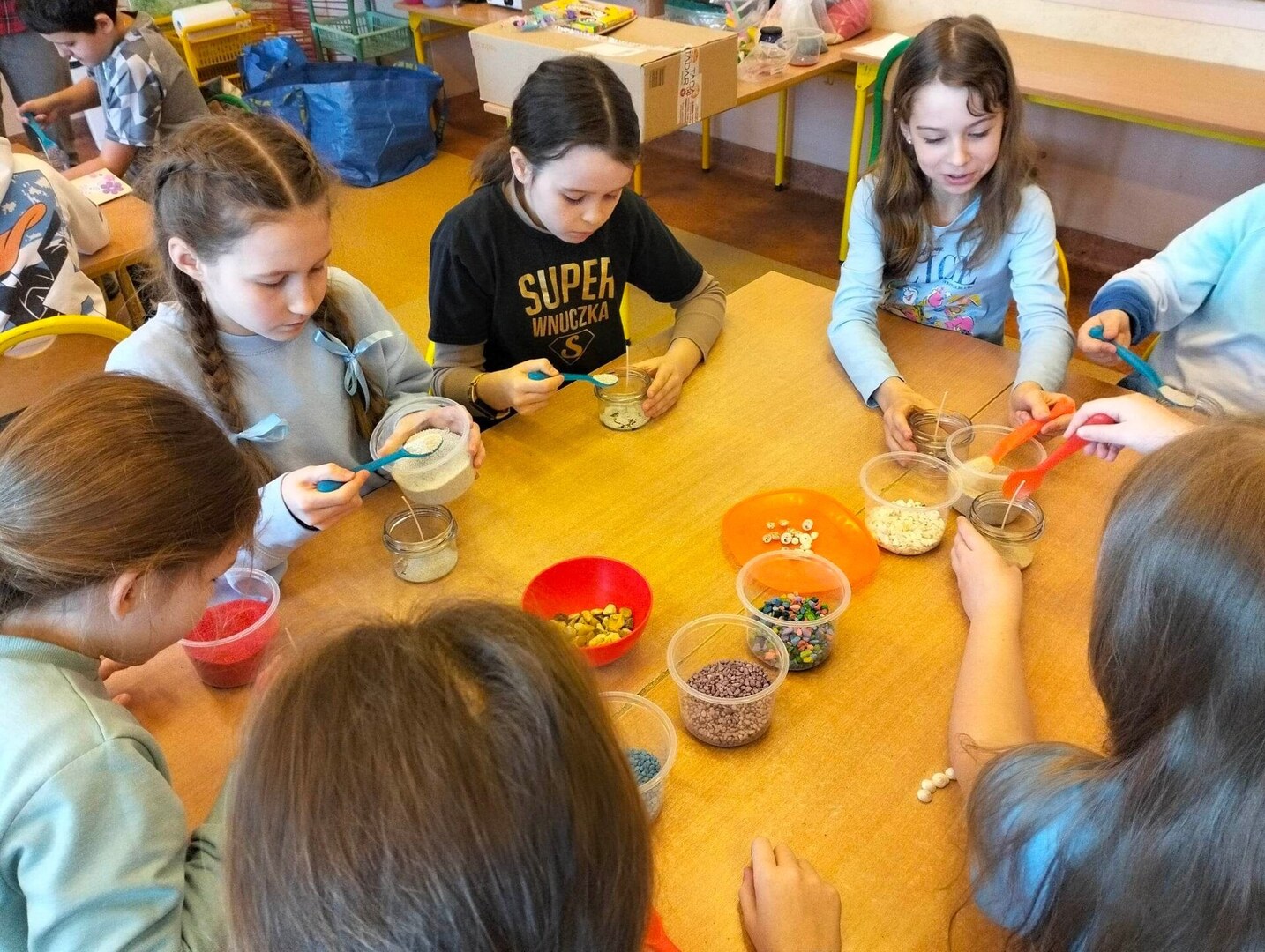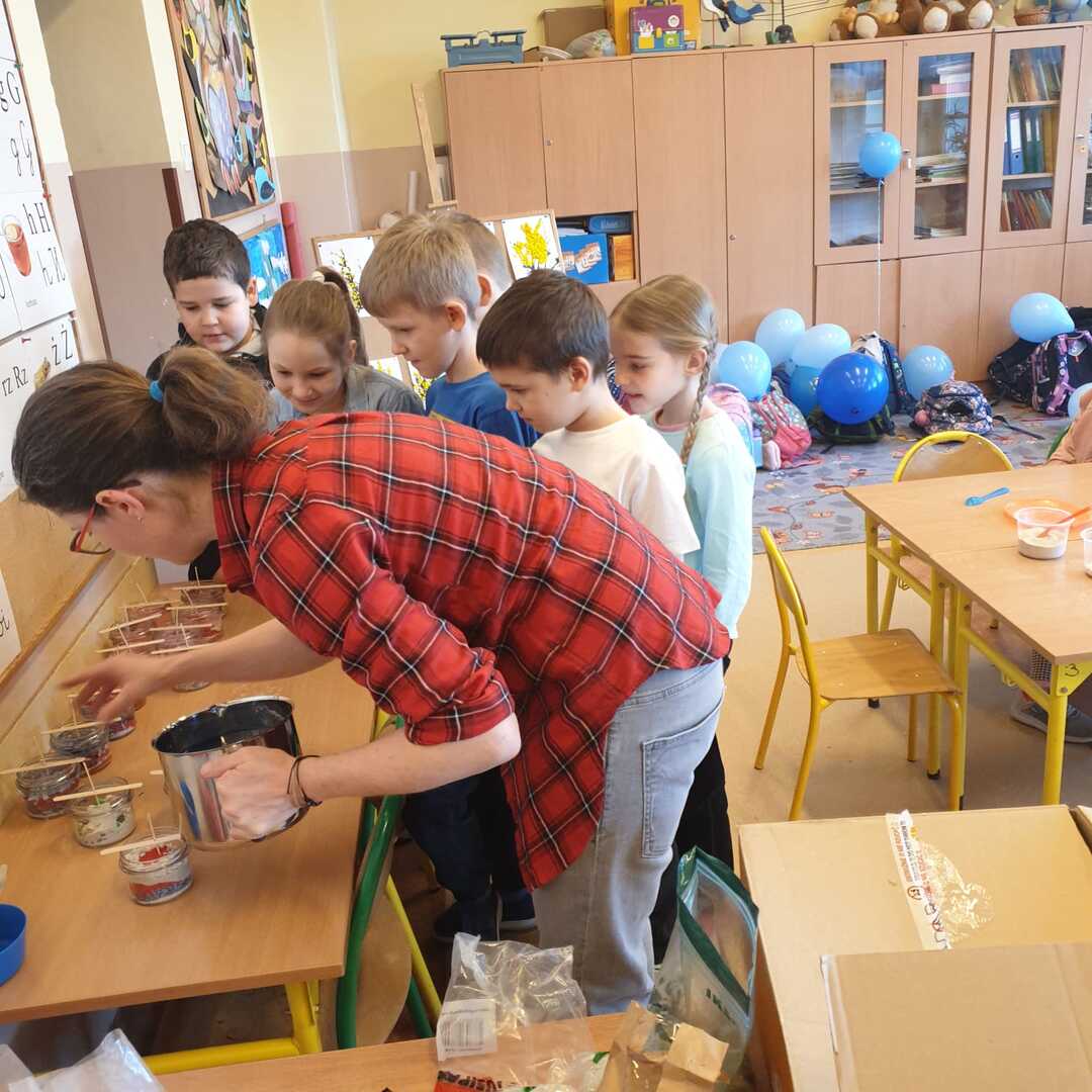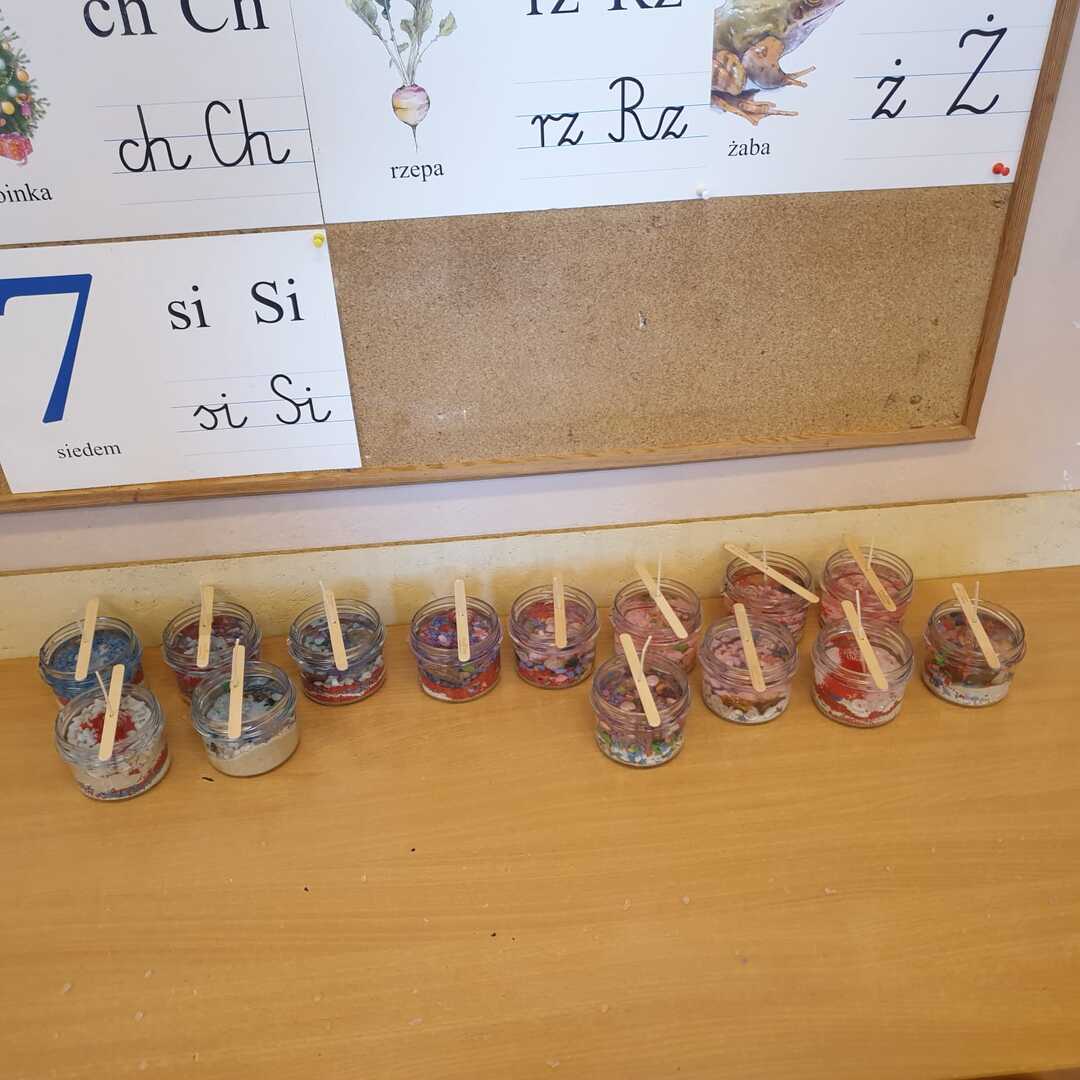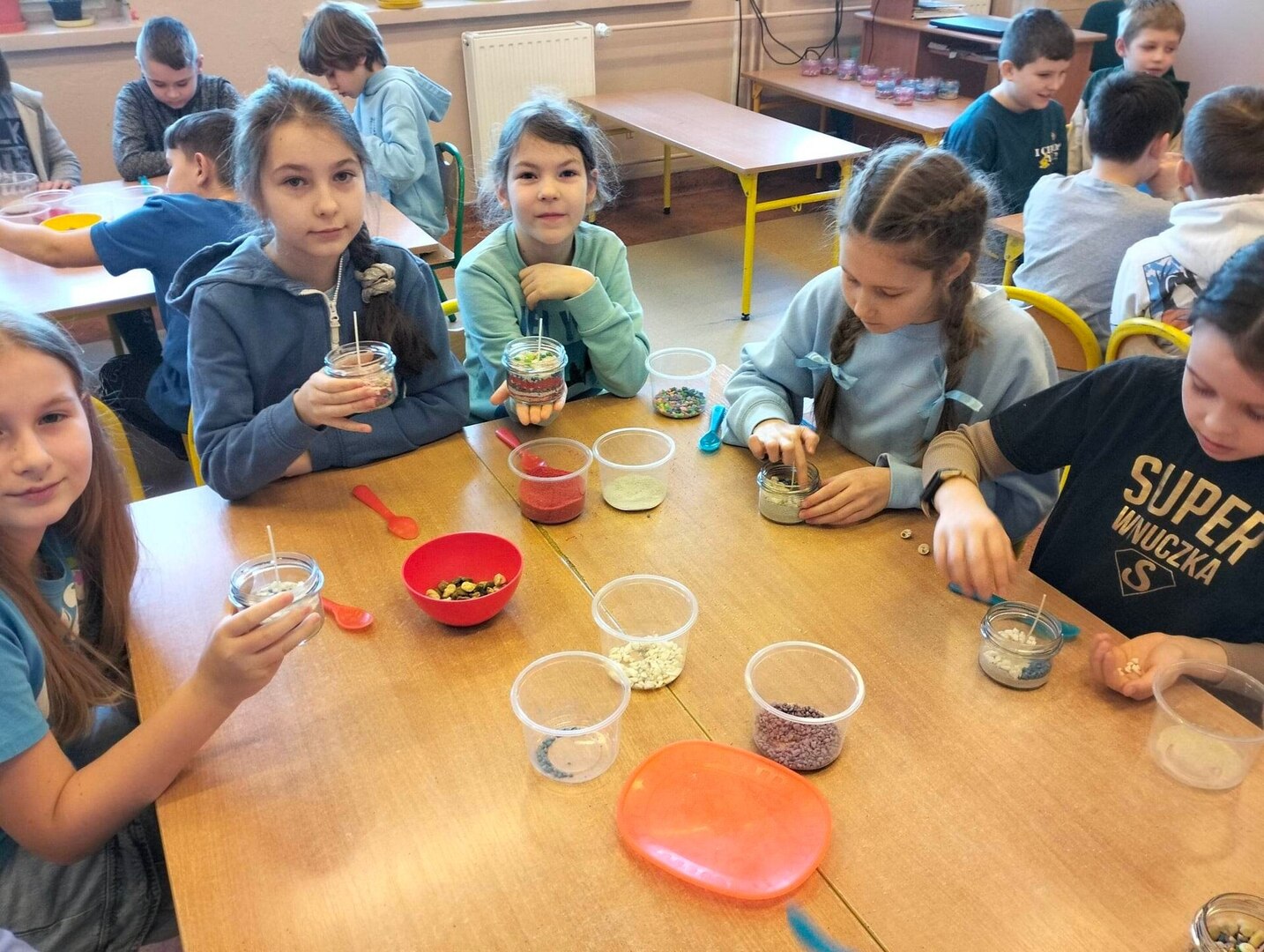 3 kwietnia uczniowie klas 1-3 uczestniczyli w warsztatach świecowych. Dzieci samodzielnie montowały knoty i wybierały ozdoby, które starannie układały w otrzymanych słoiczkach. Powstały bardzo oryginalne i z pewnością niepowtarzalne świece.