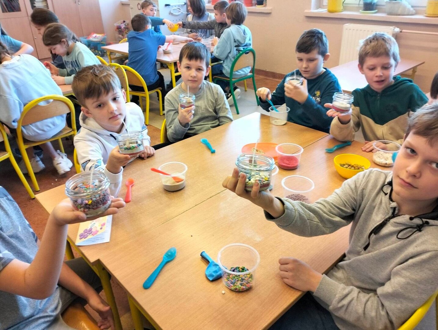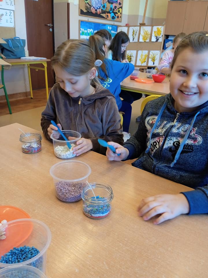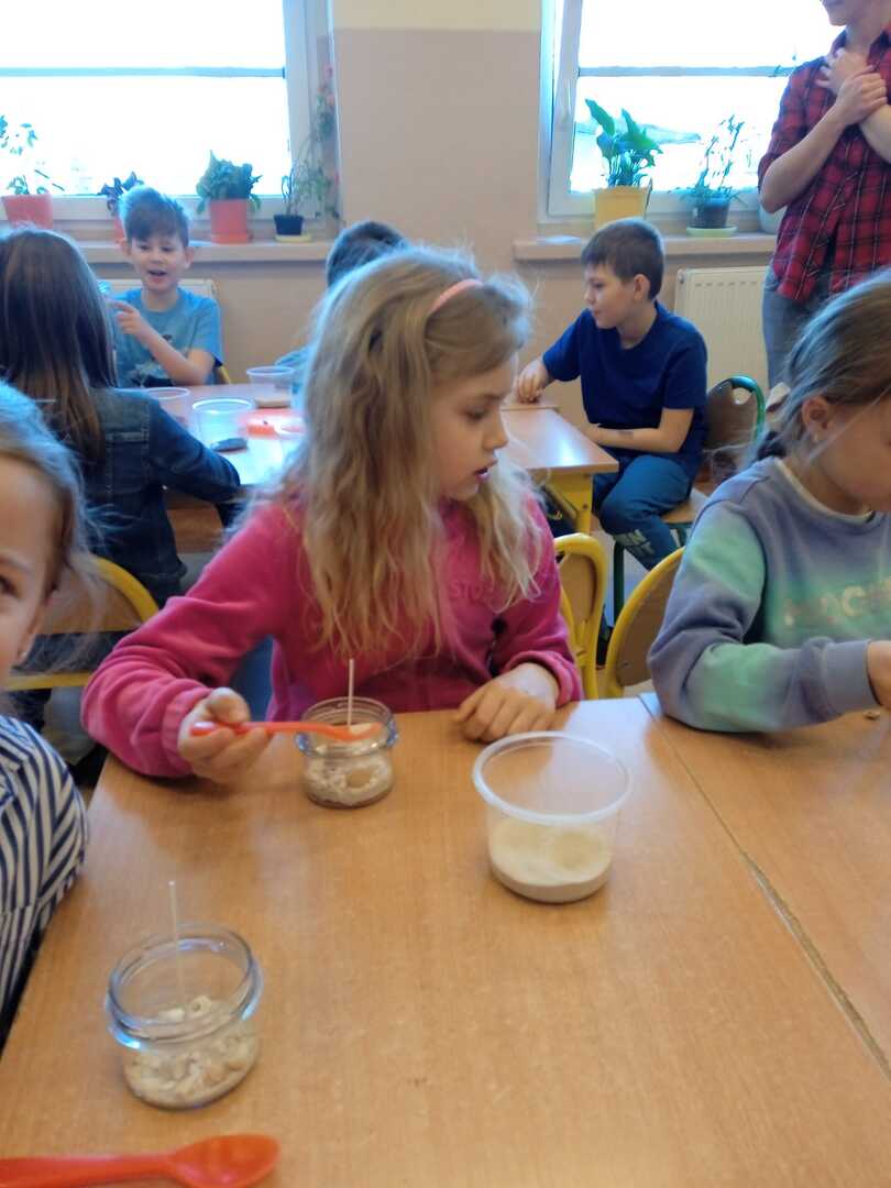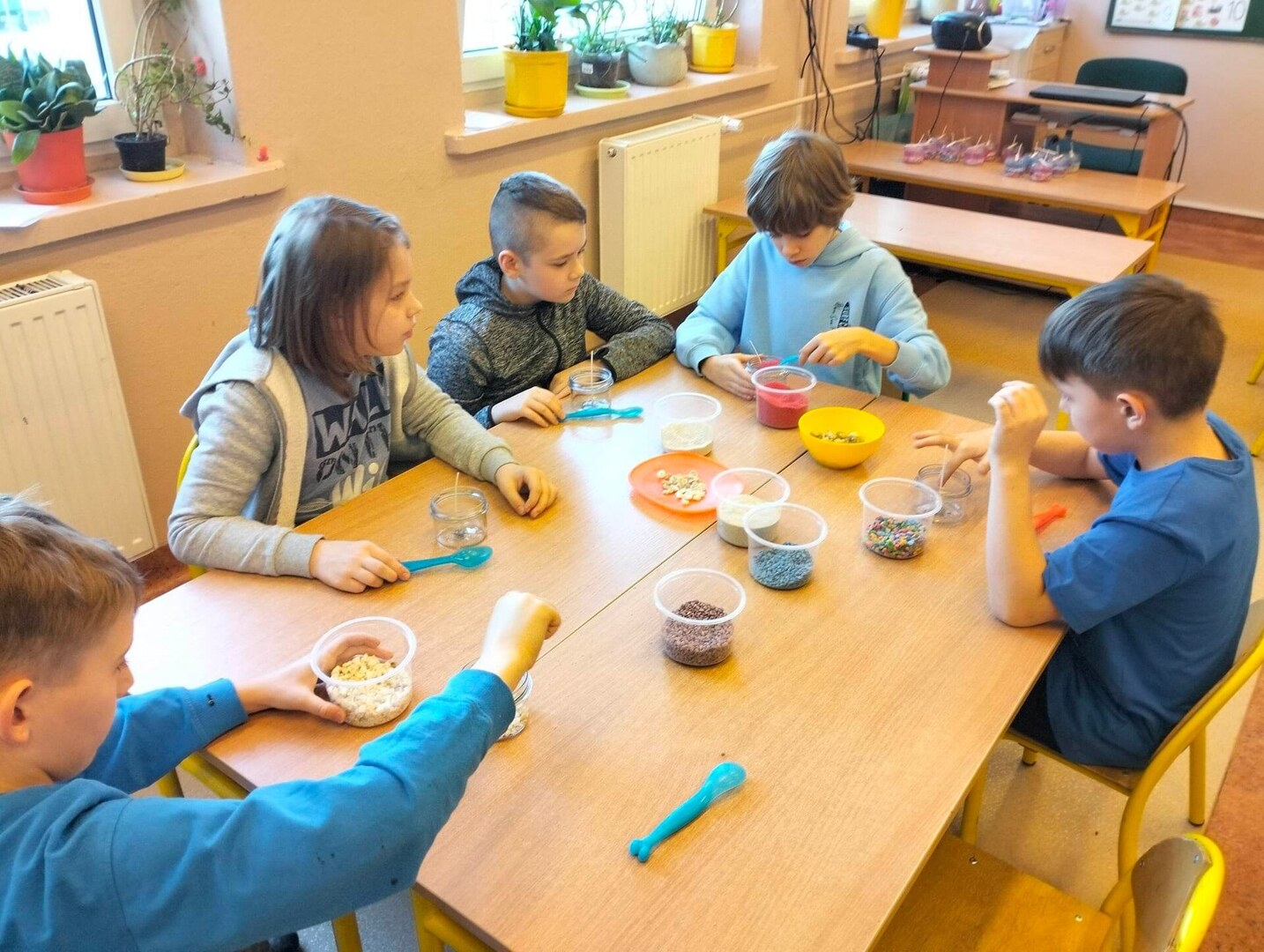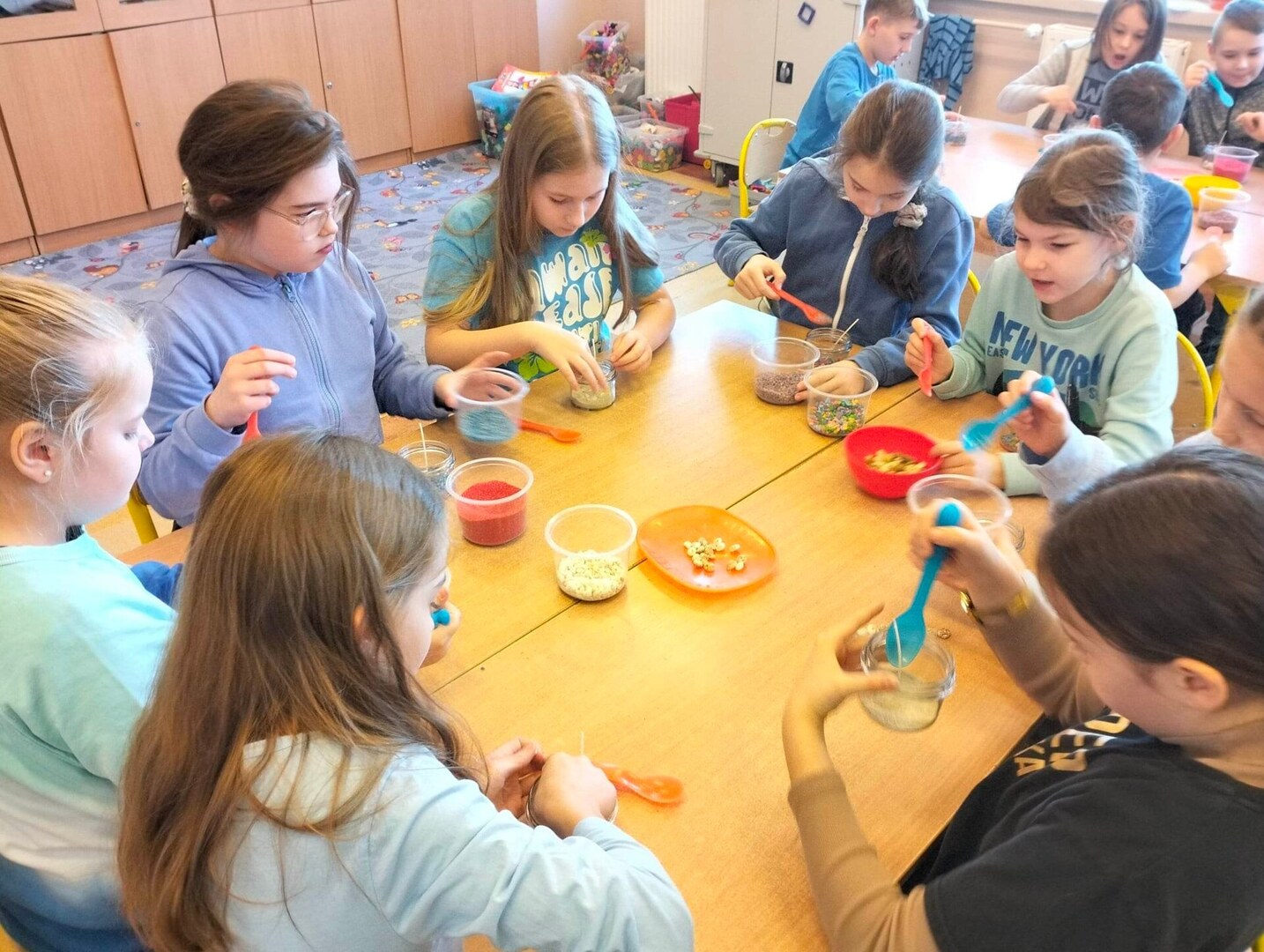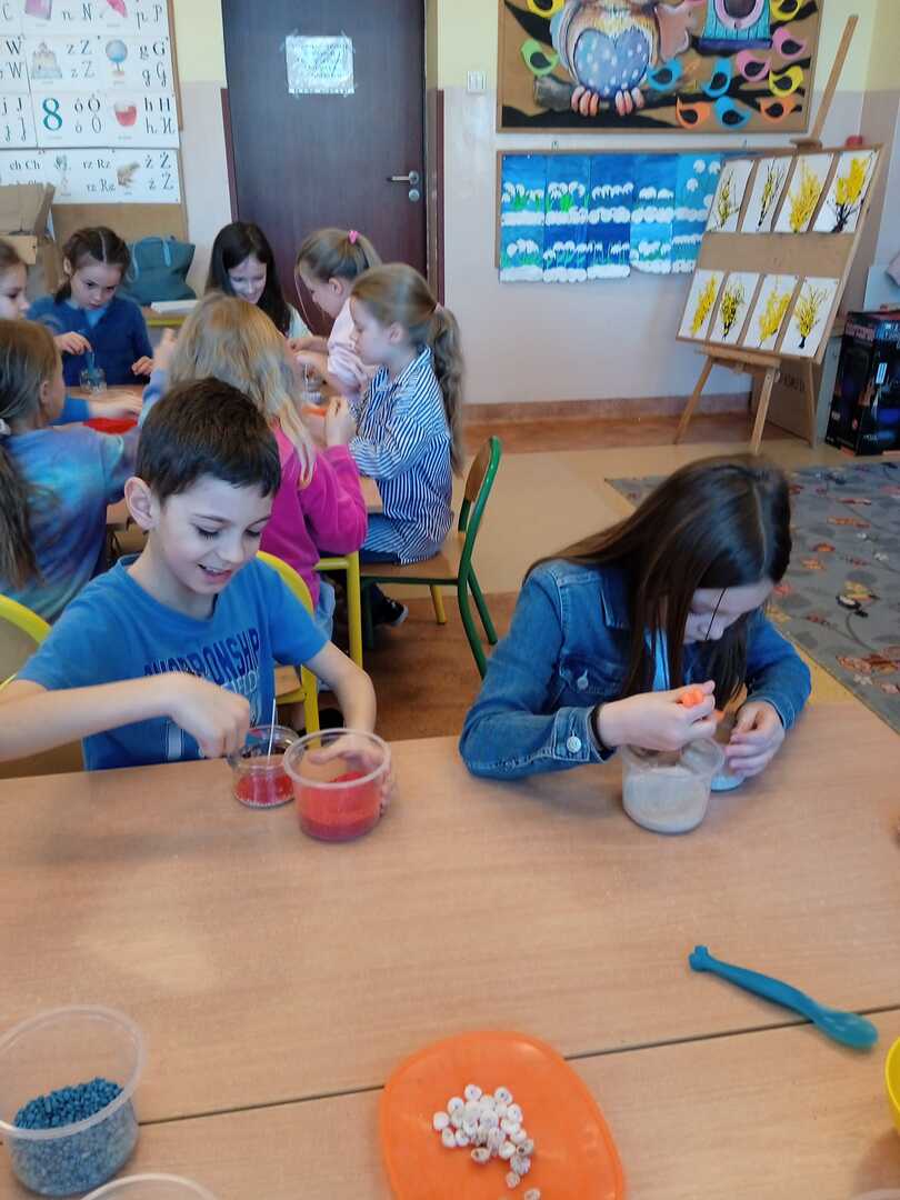 3 kwietnia uczniowie klas 1-3 uczestniczyli w warsztatach świecowych. Dzieci samodzielnie montowały knoty i wybierały ozdoby, które starannie układały w otrzymanych słoiczkach. Powstały bardzo oryginalne i z pewnością niepowtarzalne świece.