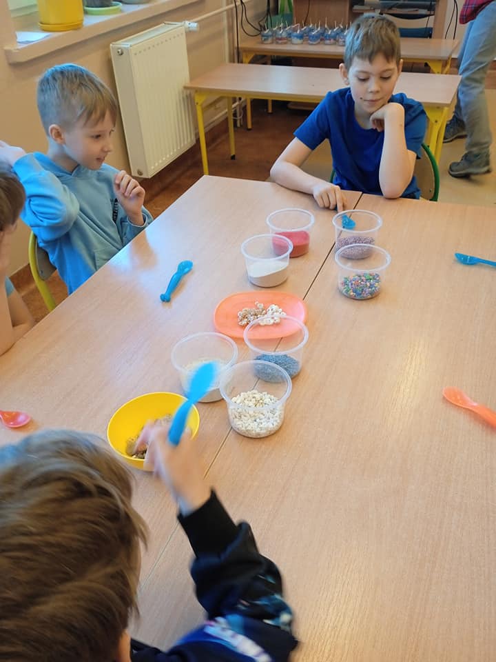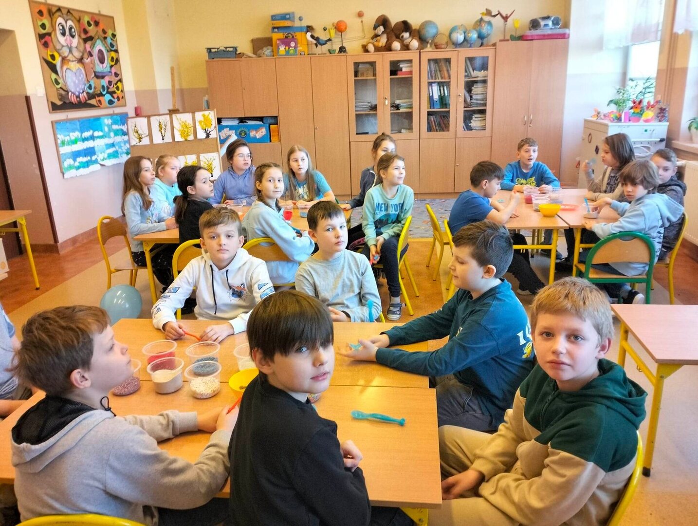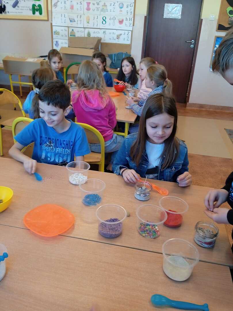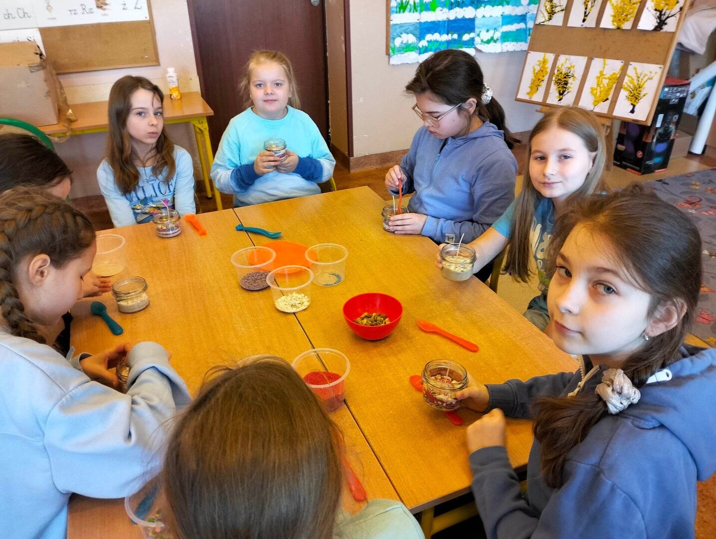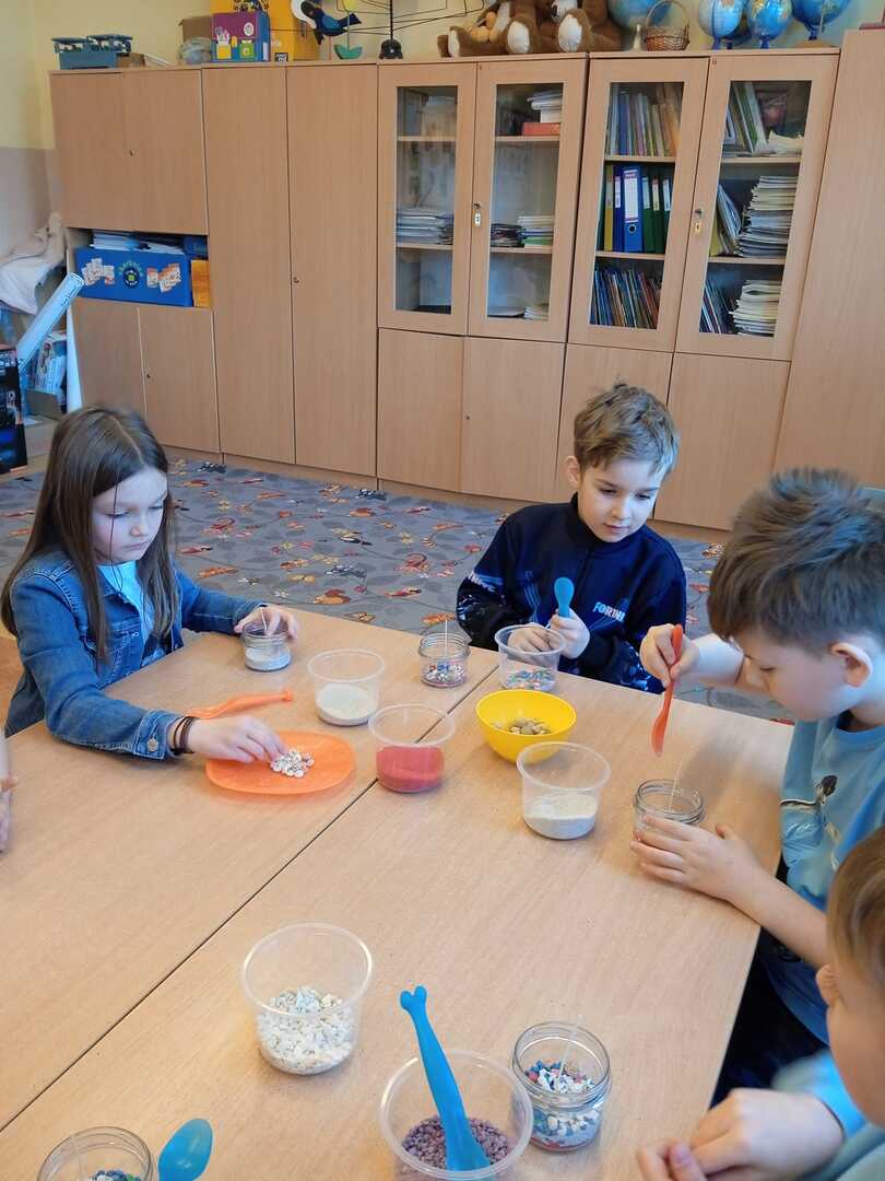 3 kwietnia uczniowie klas 1-3 uczestniczyli w warsztatach świecowych. Dzieci samodzielnie montowały knoty i wybierały ozdoby, które starannie układały w otrzymanych słoiczkach. Powstały bardzo oryginalne i z pewnością niepowtarzalne świece.