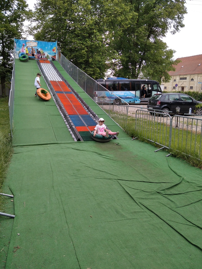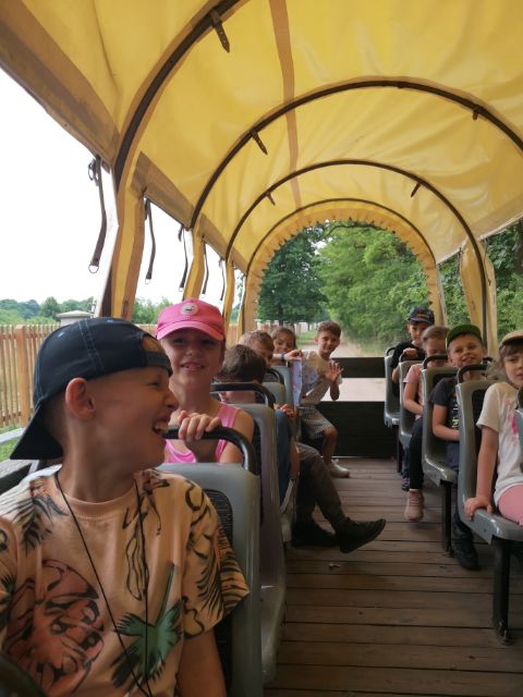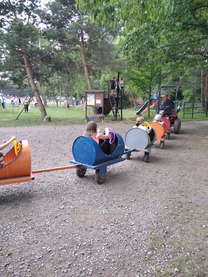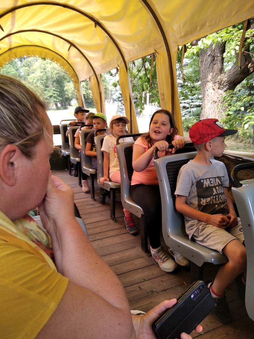 a następnie wybrały się na przejażdżkę wagonikami i wozem prosto z westernu po pięknym lesie Bolimowskim. Zabawy na dmuchańcach oraz szaleństwo na bogato wyposażonym placu zabaw przyniosły dzieciom wiele radości. Jednak największą atrakcją okazały się zjazdy na pontonach. Na koniec były jeszcze kiełbaski z grilla, które po tak intensywnym dniu smakowały