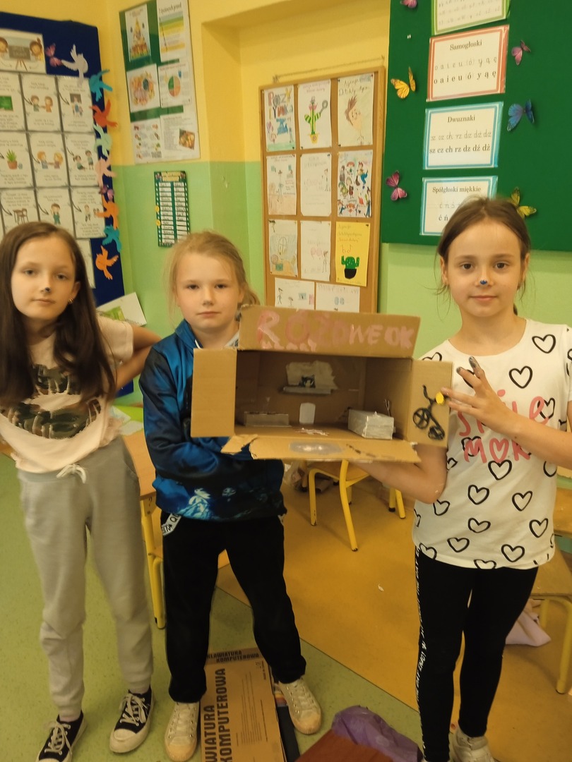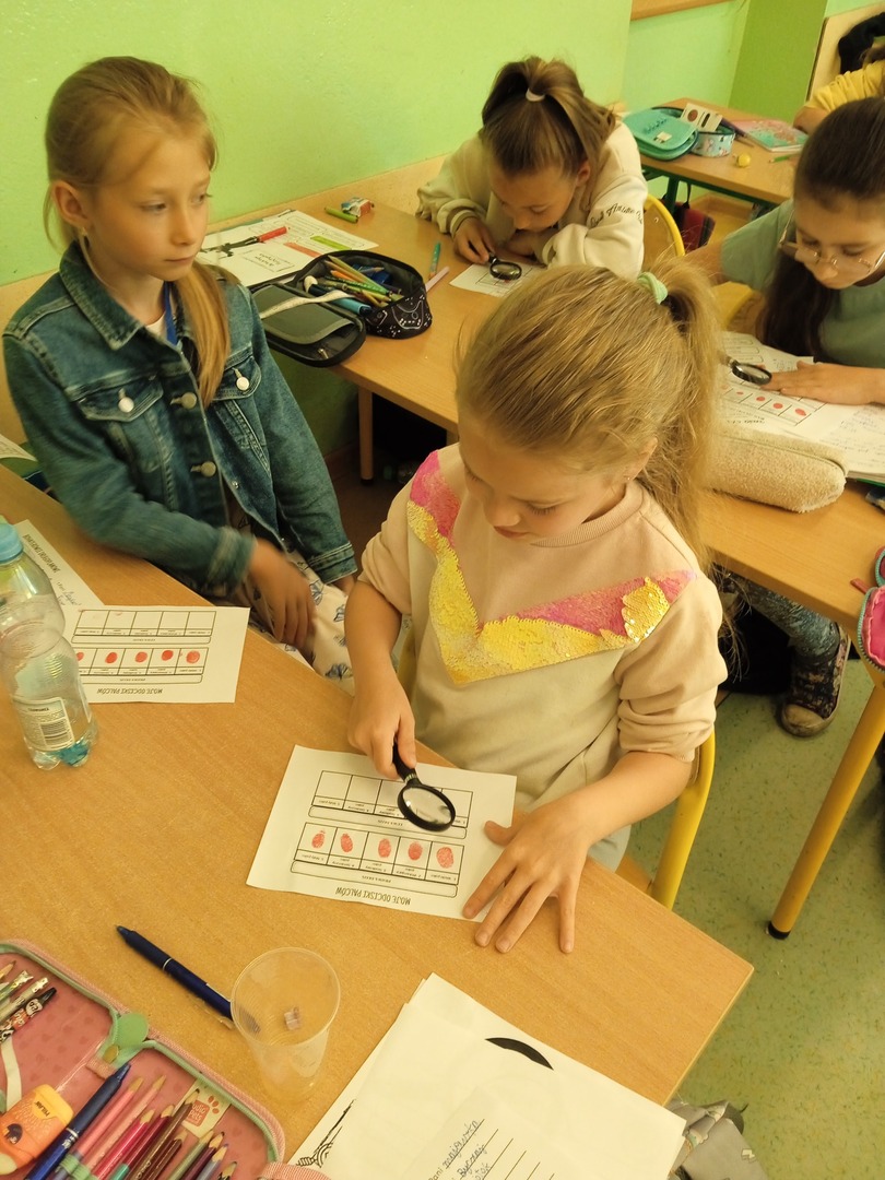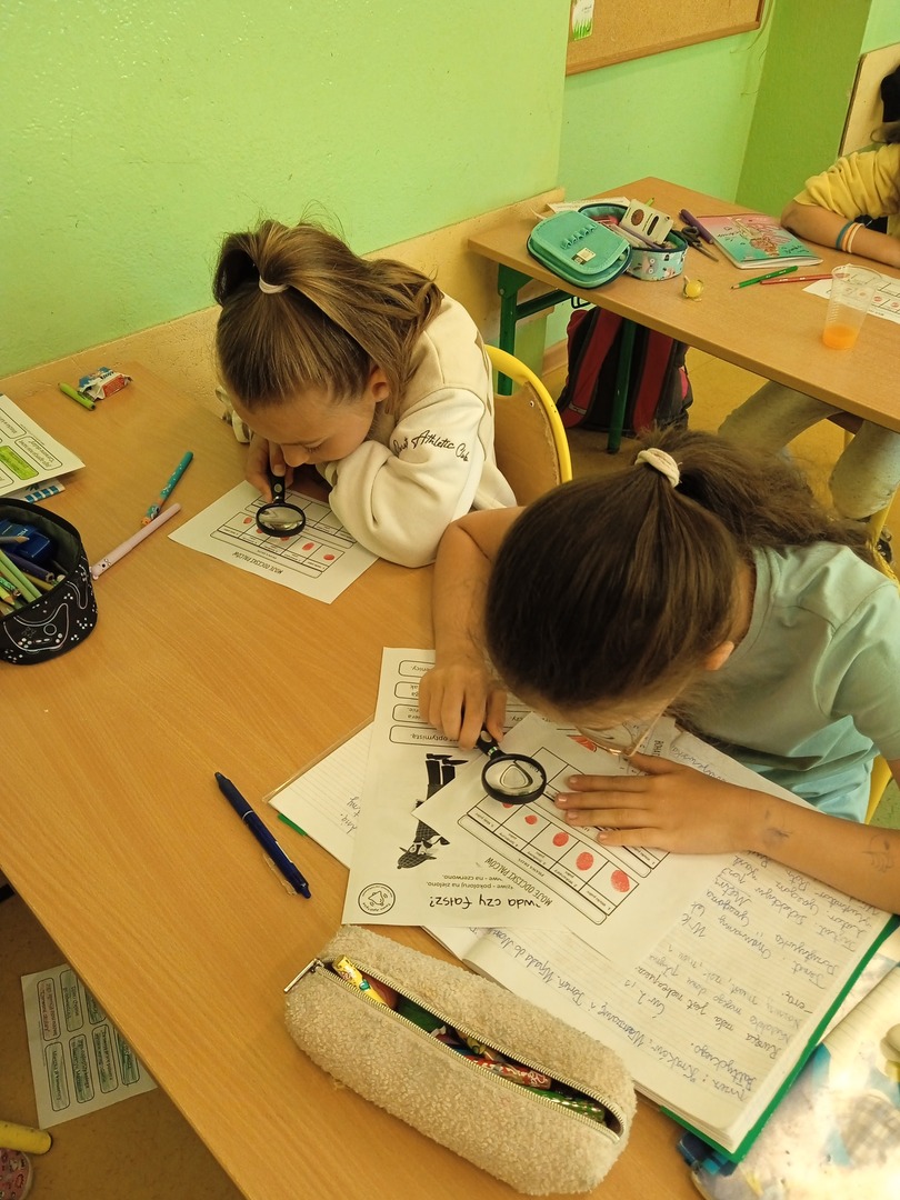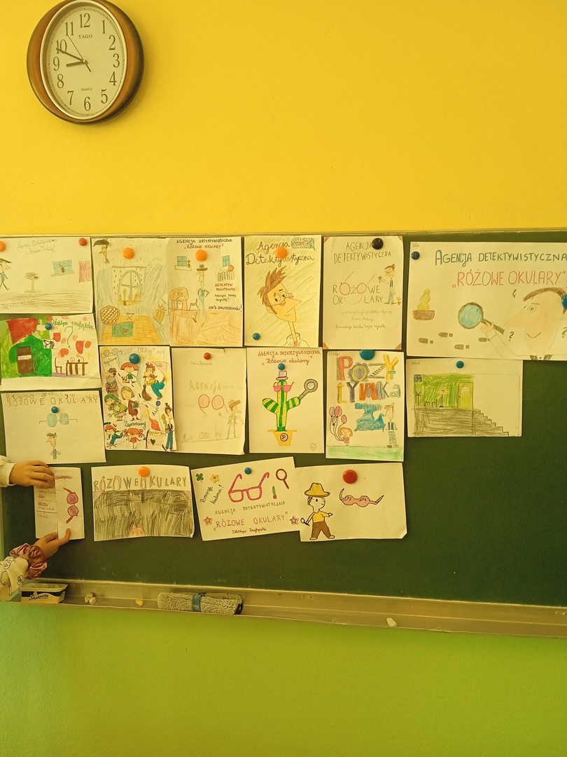 „Detektyw Pozytywka” to ostatnia lektura omówiona w tym roku przez drugoklasistów. Uczniowie zaczęli od zapoznania się z postacią autora oraz jego twórczością. Dzielili się wrażeniami po przeczytanej lekturze, opowiadali najciekawsze zdarzenia. Tworzyli metryczkę książki, krótką charakterystykę głównego bohatera i układali plan wydarzeń. Rozmawiali również o pracy detektywa i niezbędnych mu w niej akcesoriach. Dużą atrakcją było wykonywanie własnych odcisków palców na specjalnych kartach i oglądanie ich po lupą, a także praca z mikroskopem. Drugoklasiści tworzyli również ulotki i plakaty, które miały zareklamować agencję detektywistyczną „Różowe Okulary”. Podczas zajęć rozwiązywali przygotowane przez wychowawcę karty pracy, matematyczne zagadki detektywa oraz zadania multimedialne poświęcone lekturze. Ostatniego dnia powstały makiety biura Pozytywki.