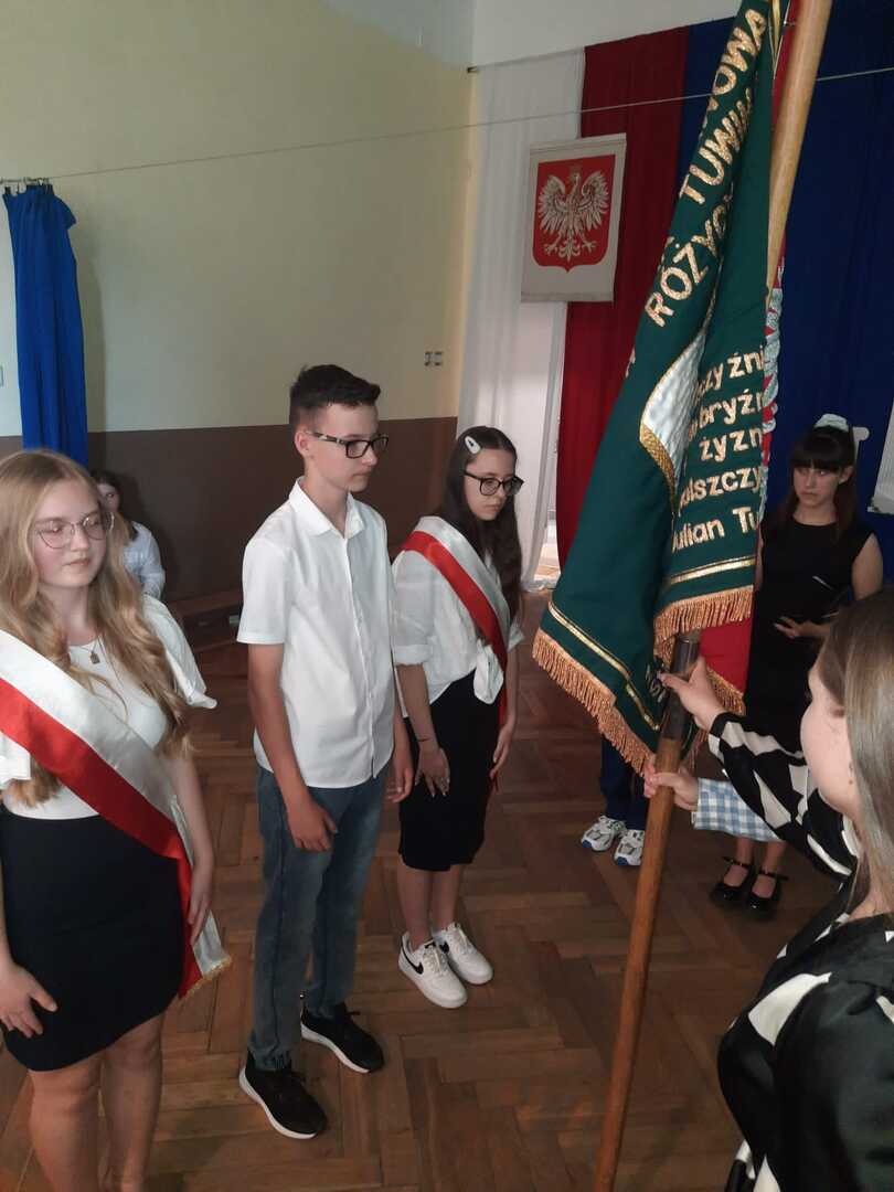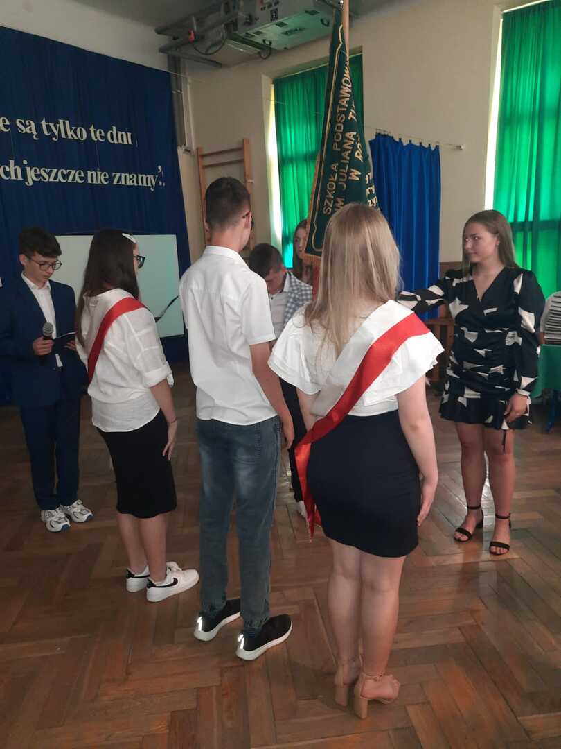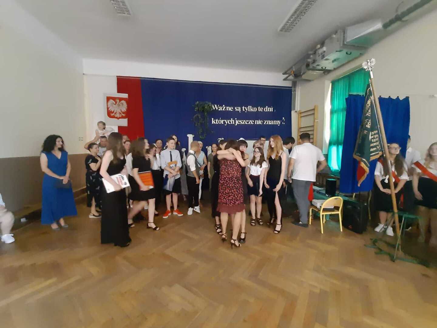 Uczniowie klas ósmych zaczęli tradycyjnie tę podniosłą uroczystość polonezem, następnie ślubowali godnie reprezentować naszą szkolę jako absolwenci oraz przekazali, zgodnie z ceremoniałem, sztandar szkoły swoim następcom, czyli klasom siódmym, które godnie pożegnały swych starszych kolegów.