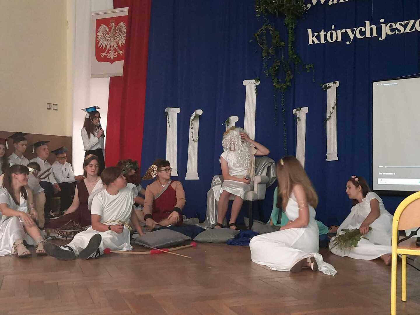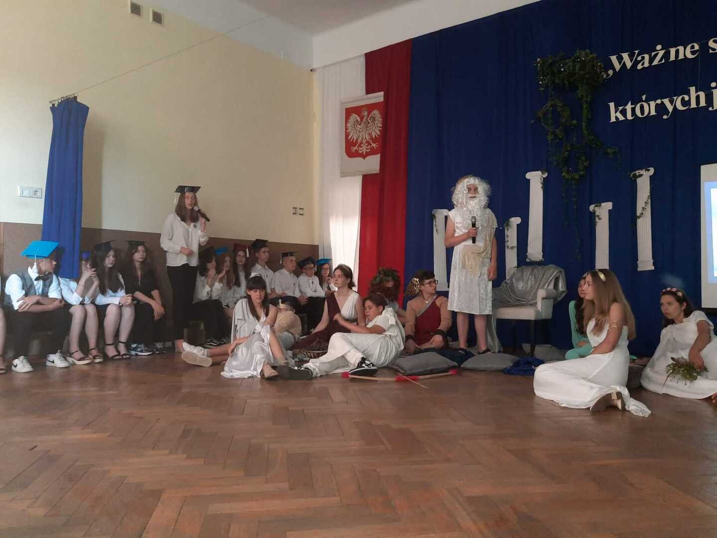 Swoją obecnością zaszczycili nas zaproszeni goście pani wiceburmistrz Koluszek – Krystyna Lewandowska i ksiądz proboszcz z parafii Kaletnik – Stefan Majewski. Po części oficjalnej, opuszczająca szkolne mury młodzież zabrała zgromadzonych gości na Olimp, gdzie przy wtórze „Greka Zorby” i łyków słodkiej ambrozji rozegrała się intryga klas ósmych z bogami greckimi w roli głównej, pt. „My nie chcemy do liceum…”. Mistrzowsko odegrane role, świetna dekoracja (brawa dla p. Ewy Pietrzyk) zabawne dialogi i dopracowane w każdym calu stroje zrobiły na zgromadzonej publiczności ogromne wrażenie. Pod koniec, zaprezentowanej pod kierunkiem p. Anniki Niburskiej i p. Marty Lewandowskiej sztuki, goście mogli obejrzeć filmik ukazujący z przymrużeniem oka jeden dzień z życia ucznia Szkoły Podstawowej w Różycy, a następnie usłyszeć płynące z serca słowa podziękowania dla Dyrekcji, Nauczycieli, Rodziców oraz wszystkich pracowników szkoły za ciepłą atmosferę, za troskę, za trud w przekazywaniu wiedzy, za dobre serce i okazywaną im sympatię. Dopełnieniem ich myśli i uczuć były kwiaty i wesołe skrzaciki jako upominki. Na zakończenie uroczystości rodzice ósmoklasistów zaprosili zgromadzonych gości na przepyszny tort i słodki poczęstunek
