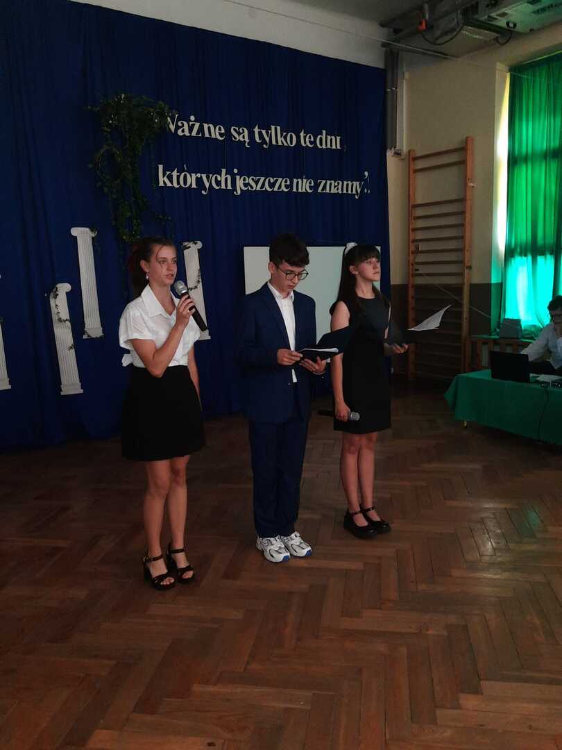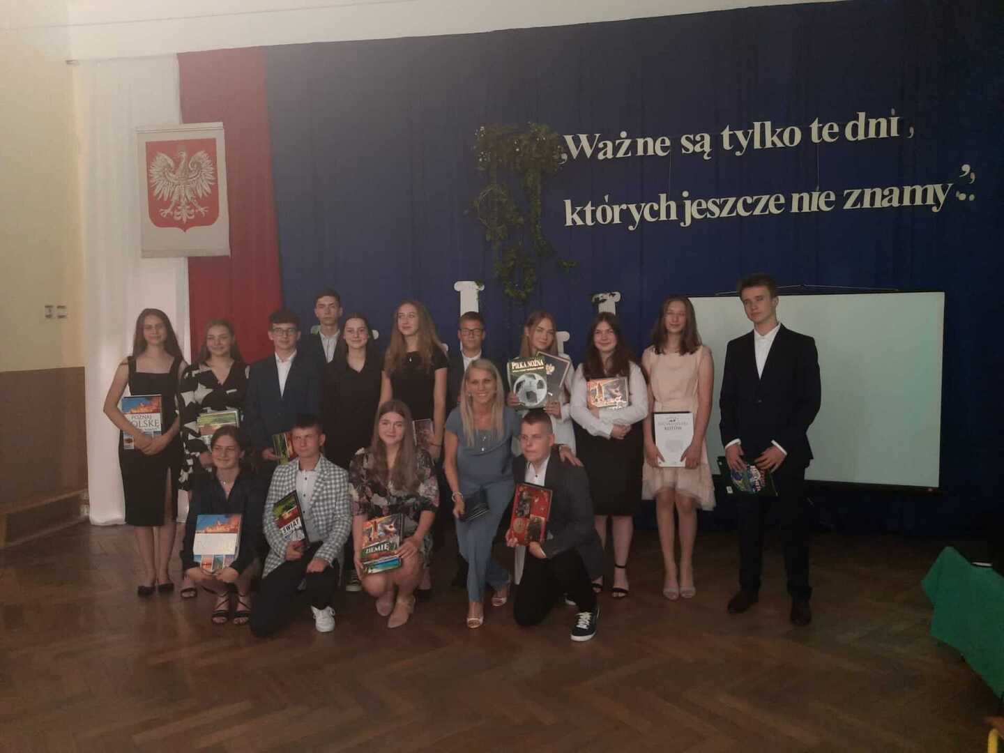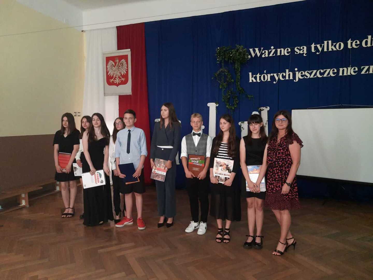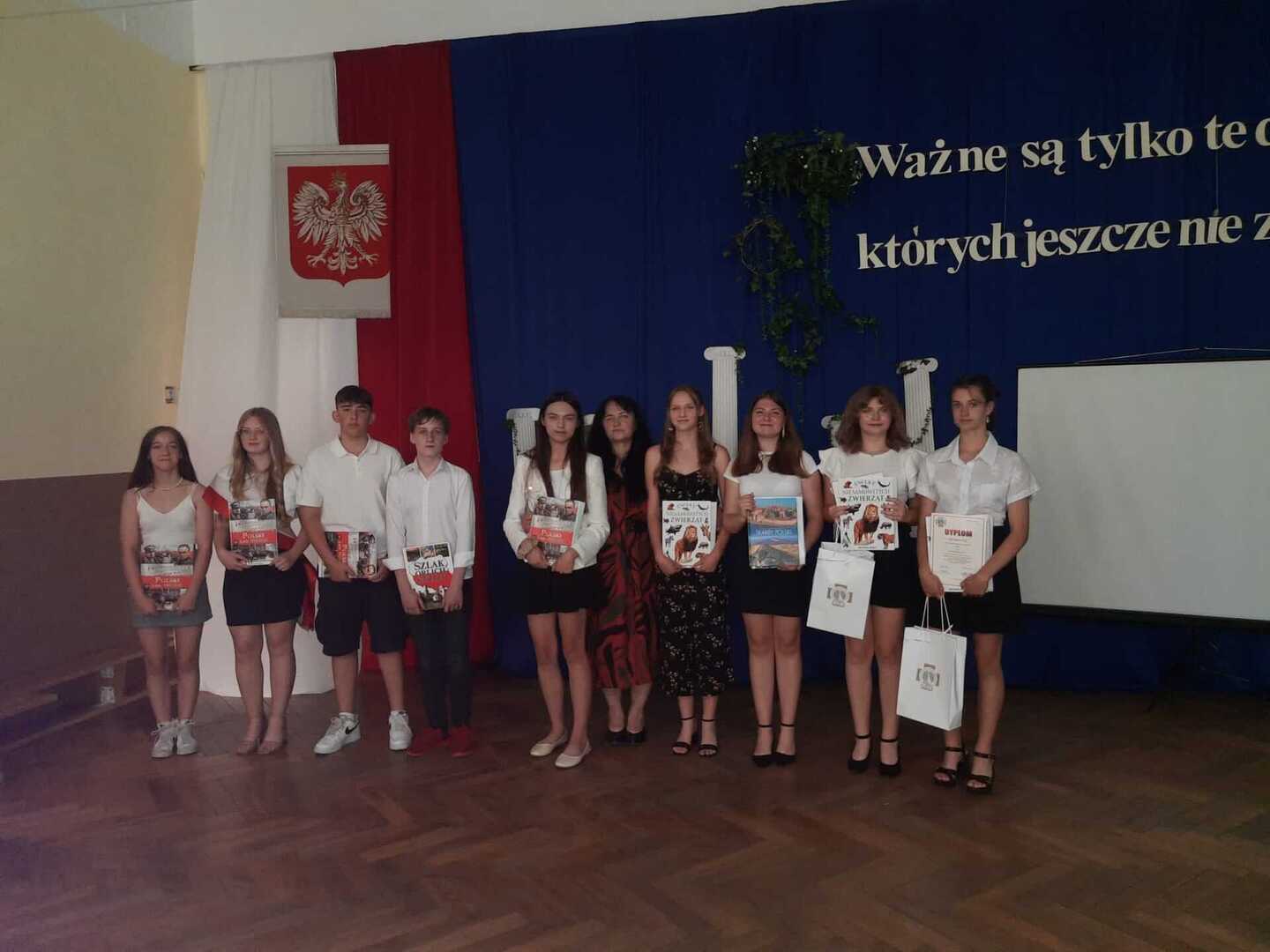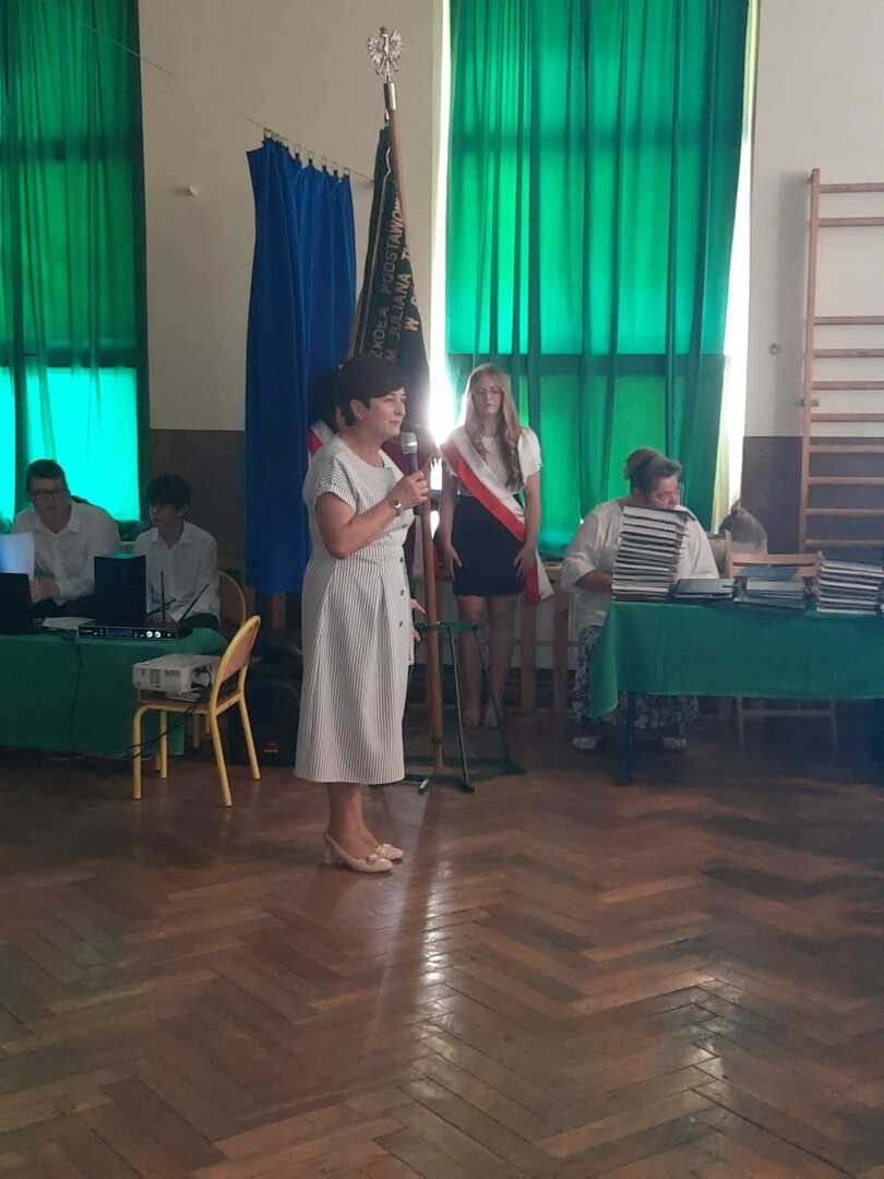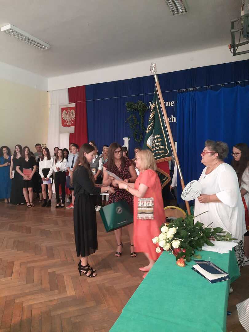Pani Dyrektor Aneta Mrówka wspólnie z wychowawczyniami najstarszych klas wręczyły nagrody książkowe za najlepsze wyniki w nauce oraz sporcie, sukcesy w konkursach oraz pracę w Samorządzie Uczniowskim i Szkolnym Kole Przedsiębiorczości. Podziękowano uczniom oraz rodzicom za aktywny udział w życiu klasy i szkoły.