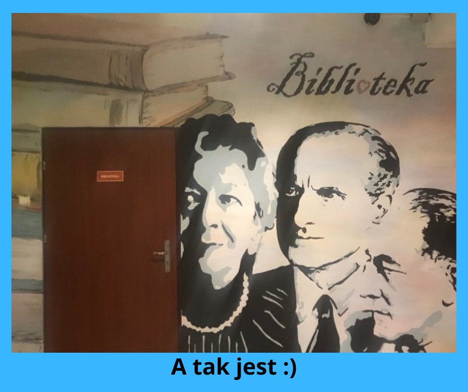 Na górnym korytarzu, przy drzwiach od biblioteki, powstał przepiękny mural, przedstawiający wizerunki znanych pisarzy. Pomysłodawczyniami tej inicjatywy są: pani wicedyrektor Marta Lewandowska oraz nauczycielka plastyki – pani Ewa Pietrzyk. To na ich zaproszenie przybył do naszej szkoły pan Michał Chruściel – artysta plastyk, który zaprojektował i w kilka godzin stworzył nietuzinkowe dzieło. Z pewnością będzie ono cieszyło oko wszystkich spacerujących po korytarzu i odwiedzających szkolną bibliotekę.