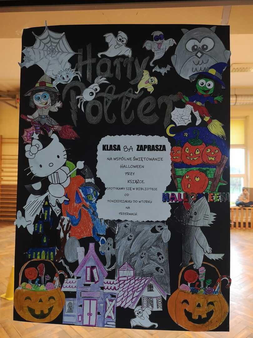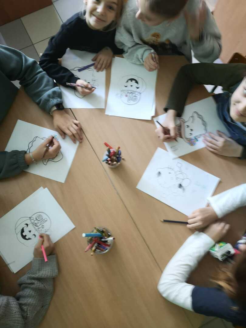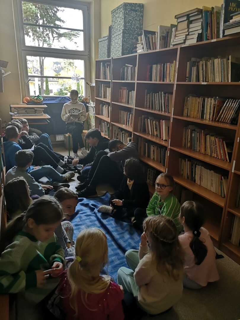 W tym dniu Aleksander Gałka, Kinga Matuszewska, Amelka Szmidel, Alicja Staroń przystroili bibliotekę, przygotowali wystawę ZE STRRRASZNIE FAJNYMI KSIĄŻKAMI, KOLOROWANKAMI, zaprosili pierwszoklasistów, którym czytali książkę pt.: O duszku Eugeniuszku.