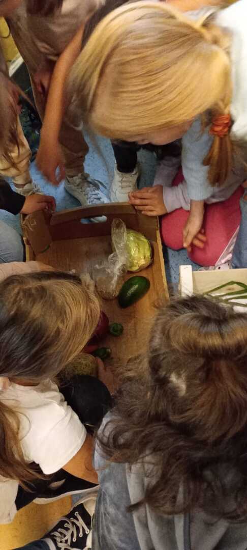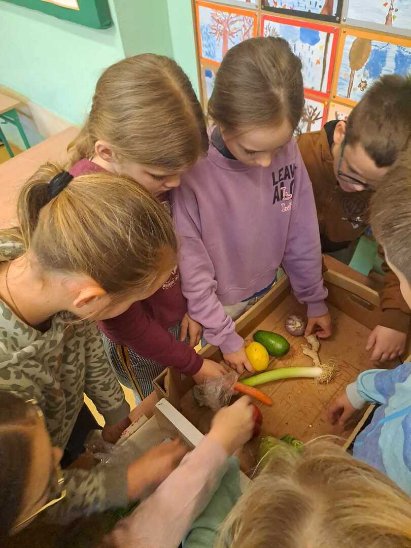 . Uczniowie z klas starszych pod okiem p. Pietrzyk na lekcjach plastyki wykonywali karykatury warzyw, które można podziwiać na szkolnej wystawie. Do akcji przyłączyła się również p. Grażyna Welc, która wraz z czytelniczkami, Julią Związek, Olą Balcerak i Julią Koszadą, przygotowała dla dzieci quiz o warzywach powiązany z odczytaniem wiersza Jana Brzechwy "Na Straganie".