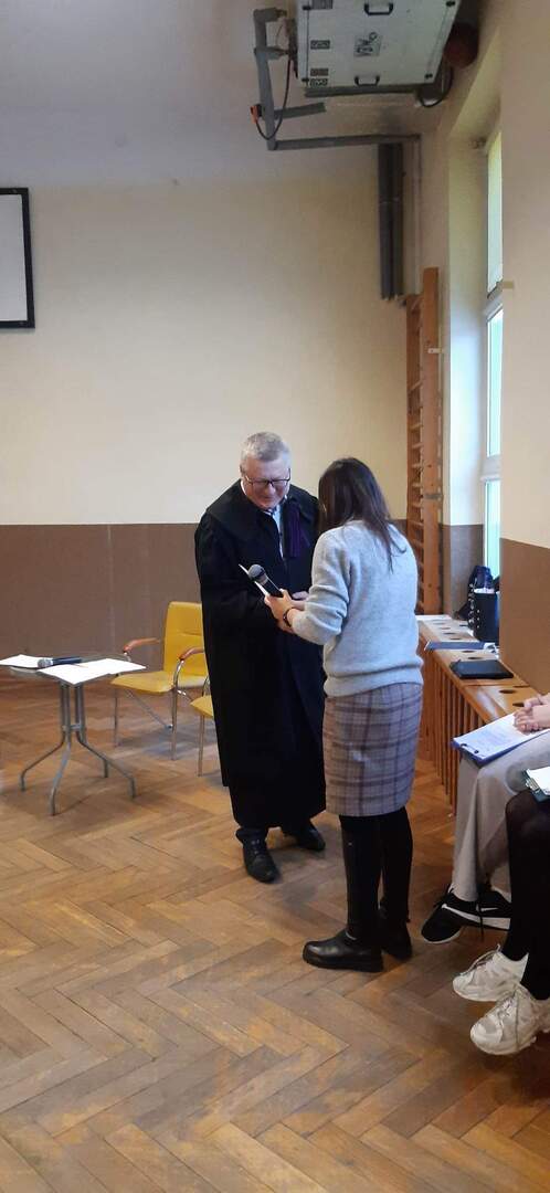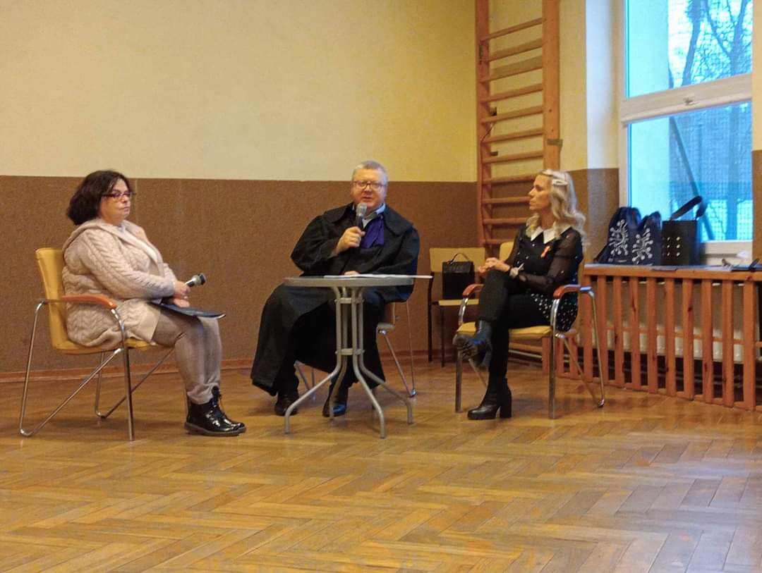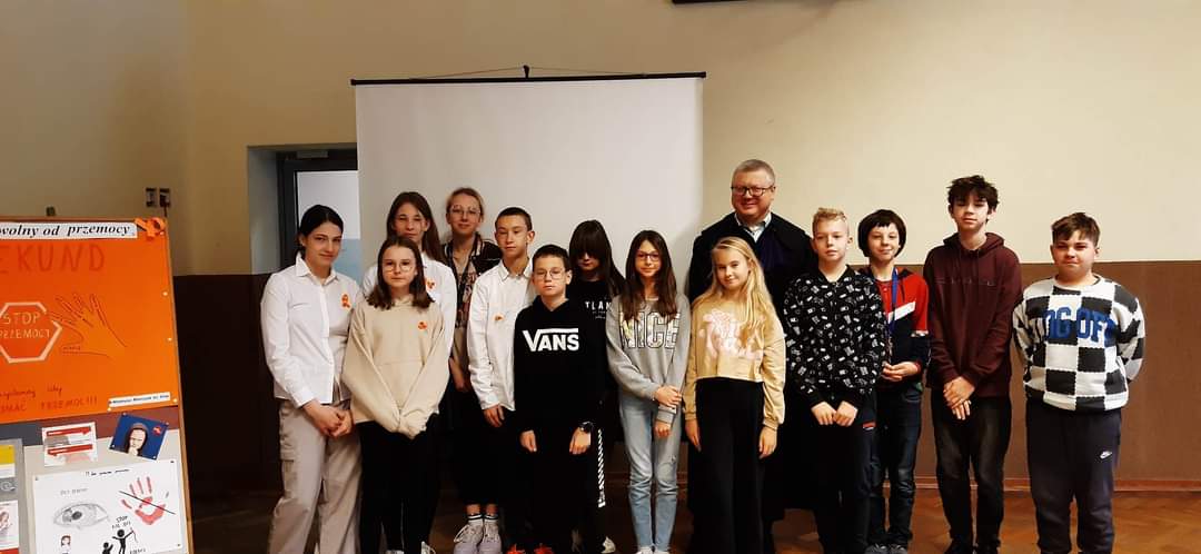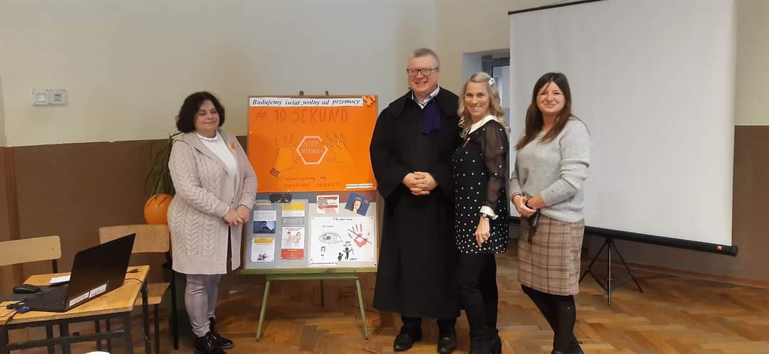 Finałem kampanii był wywiad z sędzią Sądu Rejonowego dla Łodzi-Widzewa – panem Mirosławem Nockowskim, który w rozmowie z panią pedagog i polonistką – panią Anniką Niburską przedstawił aspekty i uregulowania prawne dotyczące przemocy. Uświadomił również dzieci i młodzież o konsekwencjach związanych ze stosowaniem wszelakich form krzywdzenia, poniżania, szykanowania zarówno tych w środowisku szkolnym, domowym jak i w Internecie. Było to niezwykle ciekawe spotkanie z zakresu edukacji prawnej. Na zakończenie tej nietypowej lekcji, pan sędzia – od lat zaprzyjaźniony z naszą szkołą (jako tata trzech synów – absolwentów placówki) – z entuzjazmem obiecał pani pedagog objąć honorowym patronatem reaktywowany w naszej szkole kącik prawny.