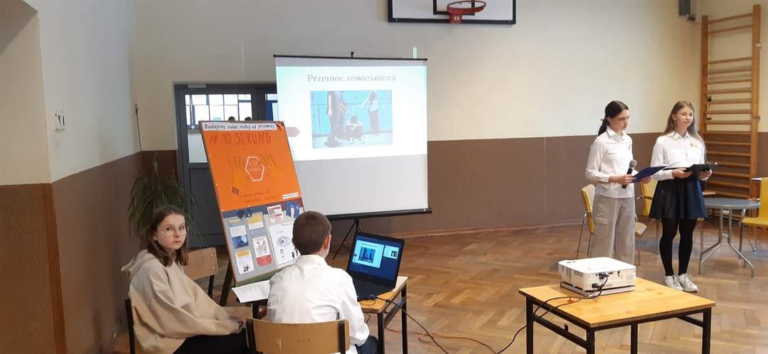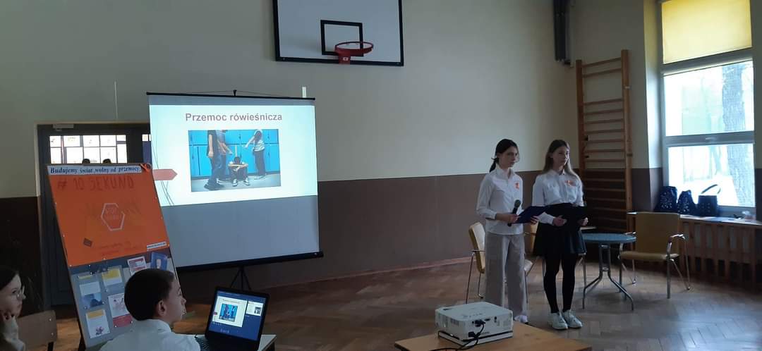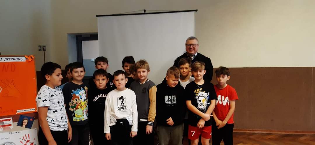 W czwartek, 30 listopada, odbyło się w naszej szkole podsumowanie światowej akcji „19 dni przeciwko przemocy i krzywdzeniu dzieci i młodzieży”. Kampania ta rozgrywa się na wszystkich kontynentach, we wszystkich krajach świata. W tym roku – z inicjatywy pani wicedyrektor Marty Lewandowskiej - dołączyła do niej również i nasza szkoła. Na początku listopada pani pedagog – Jolanta Piasecka rozmawiała z klasami o prawach dziecka, godności, szacunku, bezpieczeństwie i wolności. Przypominała także o tych wartościach, które są niezbędne do prawidłowego rozwoju i dobrego życia. Teraz przyszedł czas na podsumowanie tych rozważań w formie prezentacji, którą przedstawiły klasom 4-8 Pola i Krysia z 6b. Dziewczęta mowiły o rodzajach przemocy, sposobach radzenia sobie z jej przejawami, poinformowały również o telefonach zaufania dla dzieci i młodzieży i o tym, gdzie może poszukać pomocy każde dziecko dotknięte jakąkolwiek formą krzywdzenia. Pani pedagog oznajmiła zgromadzonym, że symbolem kampanii jest pomarańczowa wstążka, gdyż pomarańczowy, to kolor ostrzegawczy, a prowadzone w ramach kampanii działania mają ostrzegać. Zwracać uwagę. Uczyć widzieć więcej i lepiej.
