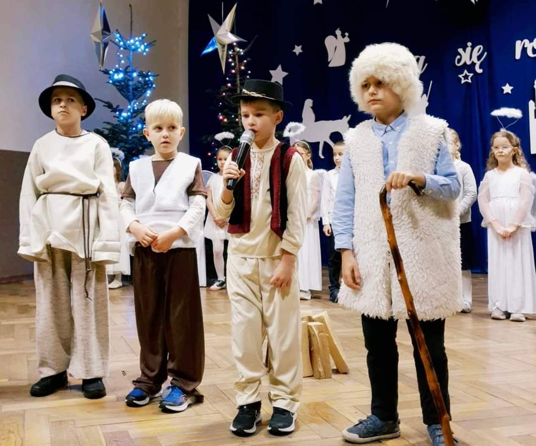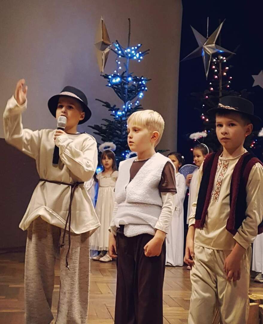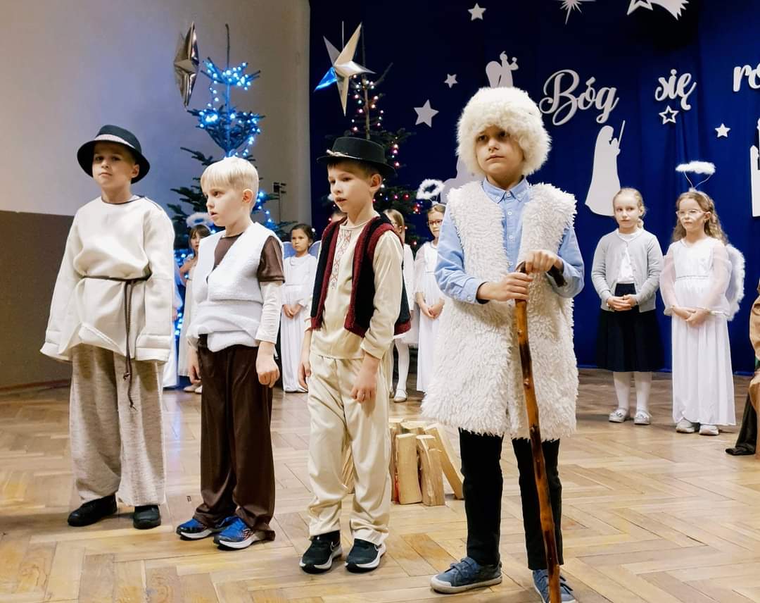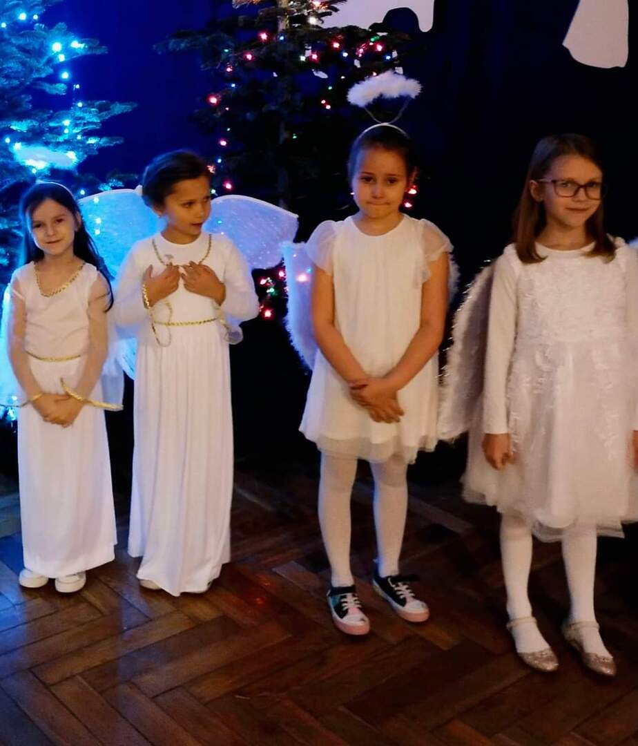 Uczennice (Natalia Rżanek, Antonia Piotrowska, Antonia Sroczyńska, Ewa Wojtylak) w roli aniołów przyniosły publiczność anielskim tańcem 2000 lat wstecz do Betlejem. Pasterze (Krystian Fortuna, Maksymilian Kotynia, Karol Mazur, Artem Slota) złożyli dary dzieciątku Jezus, leżącemu w żłobie. Anioły (Zuzanna Paradowska, Zofia Paradowska, Matylda Palma, Barbara Janus, Aleksandra Naporska) pięknie deklamowały wiersze o trudach, w których znalazła się Maria (Alicja Antosiak) oraz Józef (Nikodem Musiał). W roli prowadzących przedstawienie wystąpili: Karolina Kopka i Dominik Wajda.