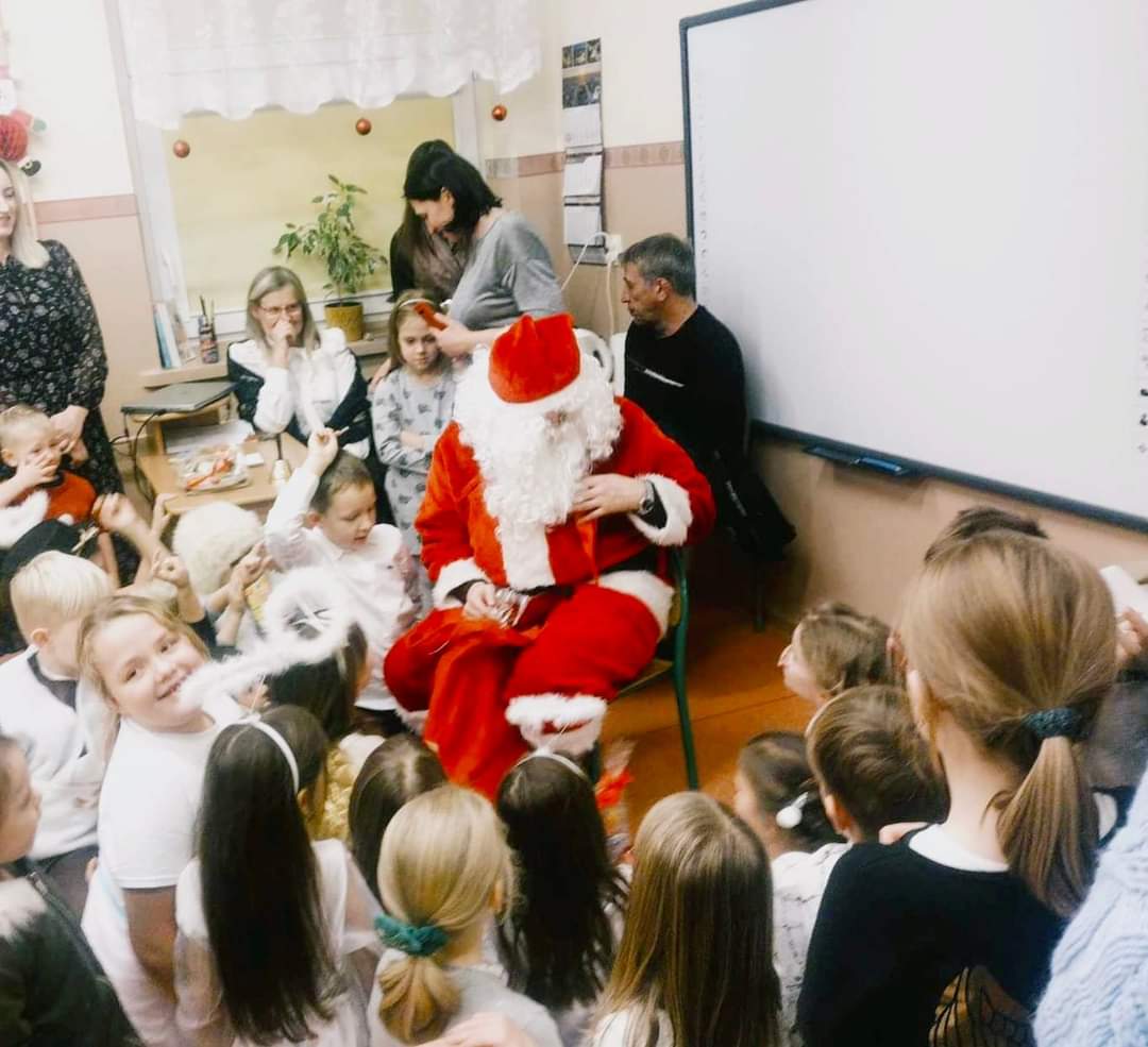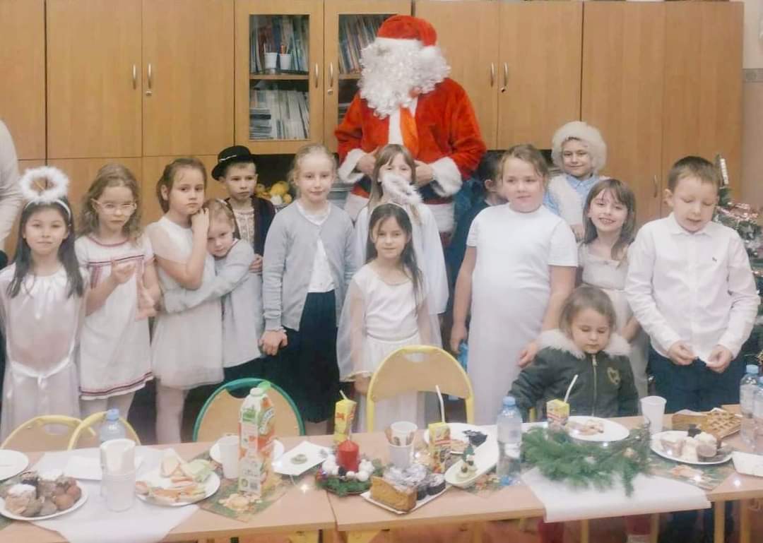 Po części artystycznej zgromadzeni goście udali się na klasową wigilię, podczas której podzielili się opłatkiem. Na uroczystość przybył gość specjalny- św. Mikołaj 🎅 Dzieci z zaangażowaniem recytowały wiersze dla dziadka z długą brodą i ochoczo odpowiadały na zadawane pytania. Ekspert od oceny dziecięcych zachowań zdecydował, że wszystkie zasłużyły na prezenty.