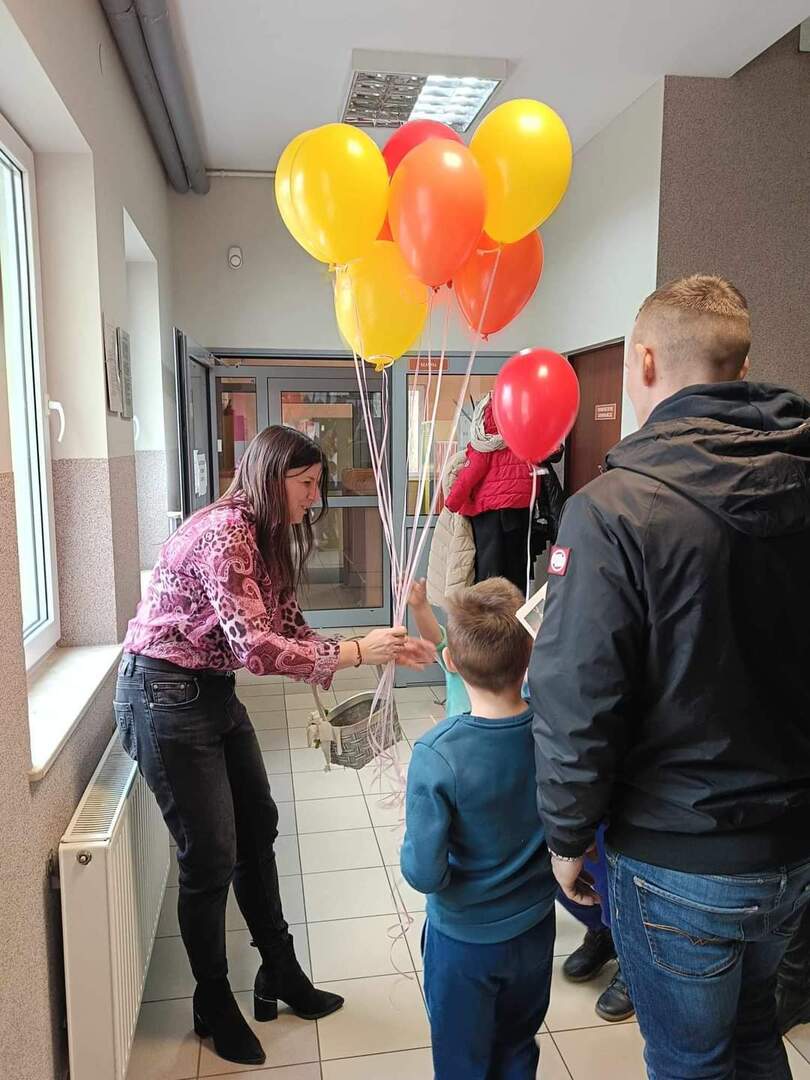 Przyszli uczniowie na pożegnanie otrzymali breloczki w kształcie kostki do gry, które zostały wydrukowane na szkolnej drukarce 3d, balony oraz upominek z masy solnej od świetliczaków.