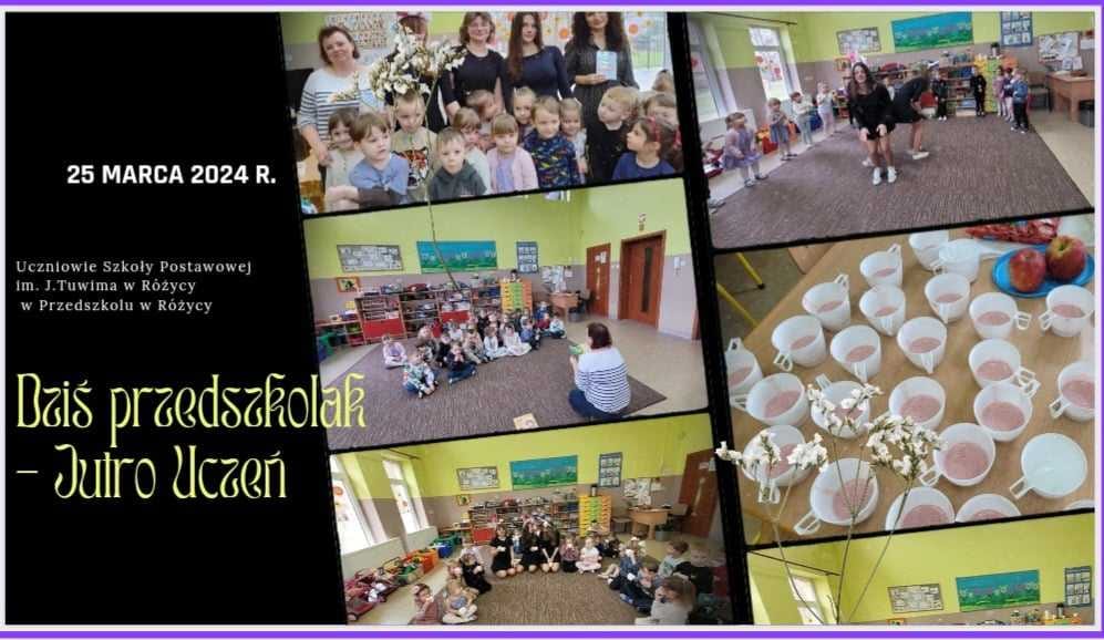 w Różycy. To już kolejne działania w ramach wspólnego projektu: „Dziś przedszkolak- jutro uczeń” . Tym razem przedszkolaki mogły usłyszeć o „Szkole Promującej Zdrowie” prężnie realizującej zadania w naszej placówce. W atmosferze radości i śmiechu razem zaśpiewaliśmy oraz zatańczyliśmy do piosenki: „A ram sam sam”. Następnie dzieci spróbowały zdrowego koktajlu. Wcześniej obserwowały jak ich starsze koleżanki go przygotowują i z jakich owoców. Zadowolone buzie były dowodem, że napój smakował. Gdy brzuszki się nieco nasyciły, „Motylki" uważnie słuchały czytanych im bajek.