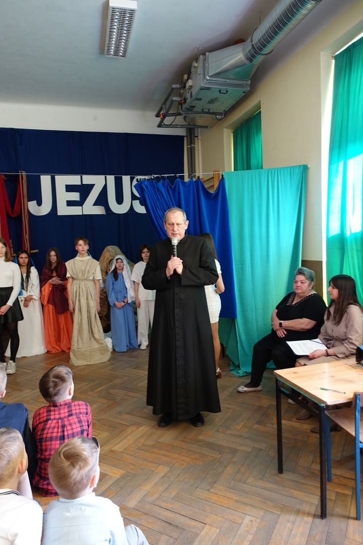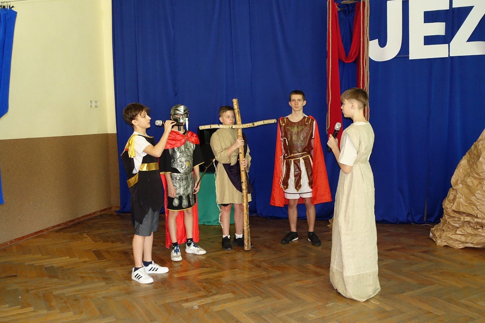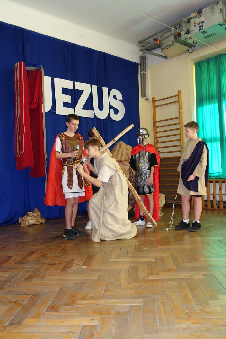 W Wielką Środę cała społeczność szkoły oraz zaproszeni goście uczestniczyli w Misterium Męki Pańskiej przygotowanym przez uczniów klasy 6a pod kierunkiem p. Ewy Pietrzyk , p. Justyny Brzezińskiej i p. Agnieszki Krawczyk. Na scenie mogliśmy podziwiać szóstoklasistów, którzy z wielkim zaangażowaniem wcielili się w role postaci biblijnych – Jezusa, Maryi , Szymona z Cyreny, Apostoła Jana, Magdaleny, żołnierzy, Piłata. Ich niesamowita gra aktorska sprawiła, że staliśmy się świadkami wydarzeń sprzed dwóch tysięcy lat. Prosta, lecz niezwykle wymowna dekoracja przygotowana przez p. Ewę Pietrzyk, stroje uczniów, muzyka budująca nastrój i poruszające serce pieśni sprawiły, że wszyscy zgromadzeni obejrzeli przygotowane przedstawienie z wielkim wzruszeniem. Ukazana Droga Krzyżowa, Śmierć i Zmartwychwstanie Jezusa skłoniły oglądających do zastanowienia się nad sensem człowieczego życia i dostarczyły wielu głębokich przemyśleń.