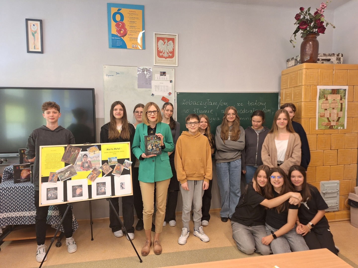 Na początku pani Motyl – która przybyła do placówki z Różycy na zaproszenie swej dawnej nauczycielki p. Ewy Pietrzyk - przedstawiła nastolatkom własną historię związaną z literacką przygodą. Jak opowiadała młoda, gdyż zaledwie trzydziestokilkuletnia pisarka, do zajęcia się pisarstwem profesjonalnie skłoniło ją spotkanie z poetą, prozaikiem, eseistą i felietonistą – Tomaszem Jastrunem. Pierwszym jej dziełem, które zyskało uznanie i sympatię czytelników, była powieść „KochAna. W pułapce anoreksji i bulimii”. Na podstawie tego utworu powstał nawet monodramat Magdaleny Dębickiej, zatytułowany „Głodne Dziecko”, wystawiony w teatrze „Baza” w Warszawie. W dalszej części tego jakże nietuzinkowego spotkania siódmoklasiści mogli zadawać pani Motyl pytania, a chcieli się dowiedzieć wielu rzeczy, m.in.: Co ją inspiruje do pisania? Jak reaguje na nieprzychylną krytykę? Czy zdarzają jej się braki weny? oraz w jaki sposób organizuje swój dzień, by pisać efektywnie? Pani Marta chętnie udzielała odpowiedzi i w bardzo swobodny sposób rozmawiała z młodzieżą, sprawiając, iż uczniowie czuli się w jej towarzystwie niezwykle komfortowo. Potem przyszła część przeznaczona na warsztaty pisarskie. Nastolatkowie otrzymali wiele cennych rad i wskazówek dotyczących tworzenia tekstu, dzięki temu zajęcia przebiegały w radosnym i twórczym nastroju. W oparciu o obraz Auguste’a Renoira „Bal w Moulin de la Galette” młodzież w kilkuosobowych grupach pisała opowiadanie, rozpoczynające się od słów: „Zobaczyłam, że tańczy w tłumie, ale wiedziałam, że ukrywa tajemnicę…”. Powstały naprawdę obiecujące prace, spośród których p. Motyl wspólnie z p. Anniką Niburską – polonistką uczącą siódmoklasistów - wyłoniły jedną najlepszą. Grupa, której liderką była Maja Świątkowska z klasy 7b, otrzymała oceny celujące z języka polskiego za znakomite ujęcie tematu i świetne korespondowanie tekstu pisanego z dziełem malarskim.