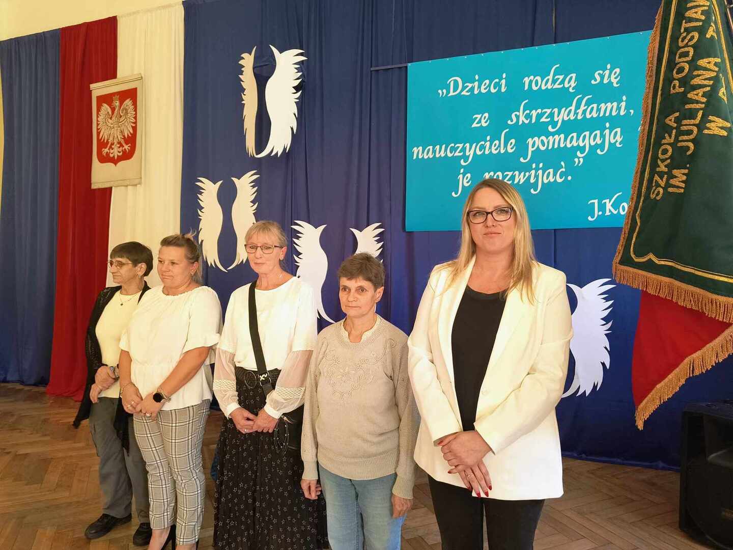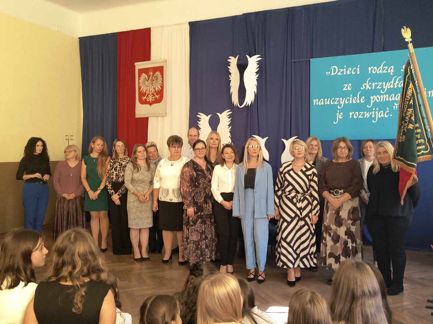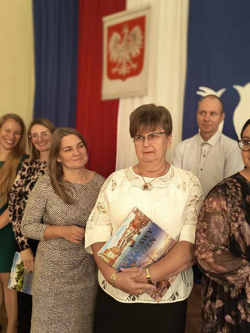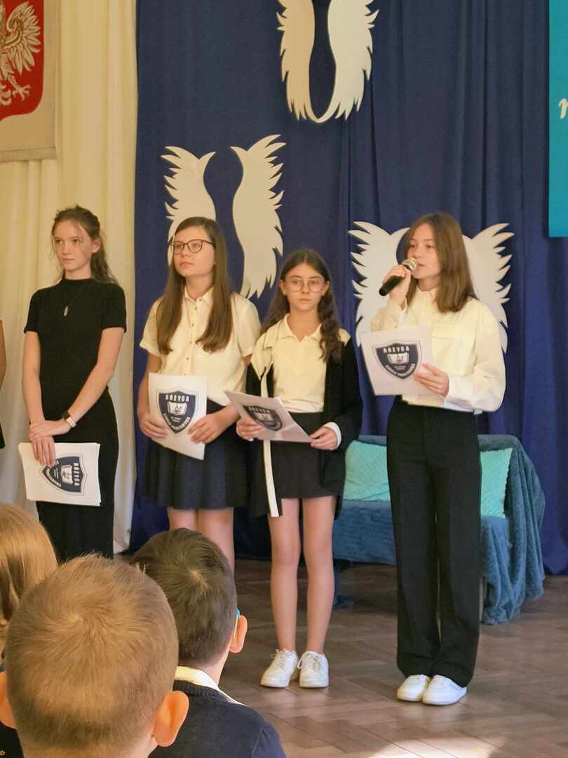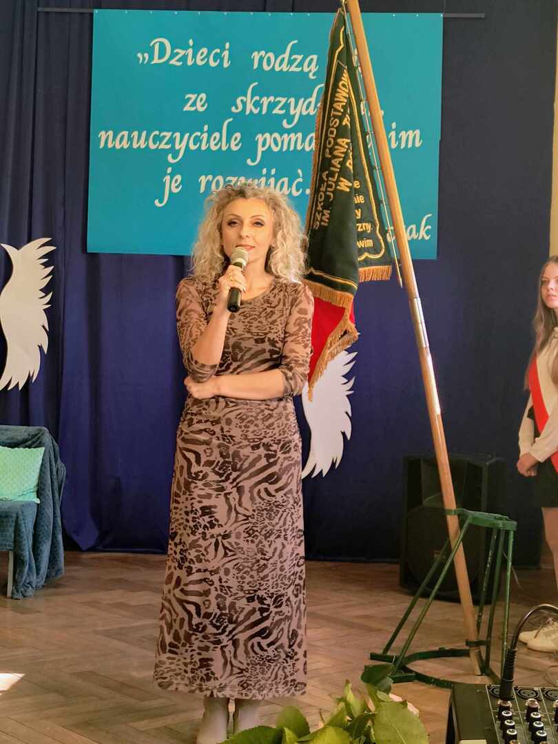 W naszej szkole podniosła akademia z okazji Dnia Edukacji Narodowej odbyła się ciut wcześniej - 10 października 2024 roku.. Na uroczystość przybyła p. dyrektor Aneta Mrówka, p. wicedyrektor Marta Lewandowska, nauczyciele, pracownicy administracji i obsługi, emeryci, przedstawiciele Rady Rodziców oraz uczniowie. W części oficjalnej glos zabrała Pani dyrektor, która złożyła serdeczne życzenia wszystkim pracownikom szkoły, podziękowała za trud włożony każdego dnia w kształcenie i wychowanie młodych pokoleń oraz wręczyła podziękowania i nagrody w postaci książkowych upominków.