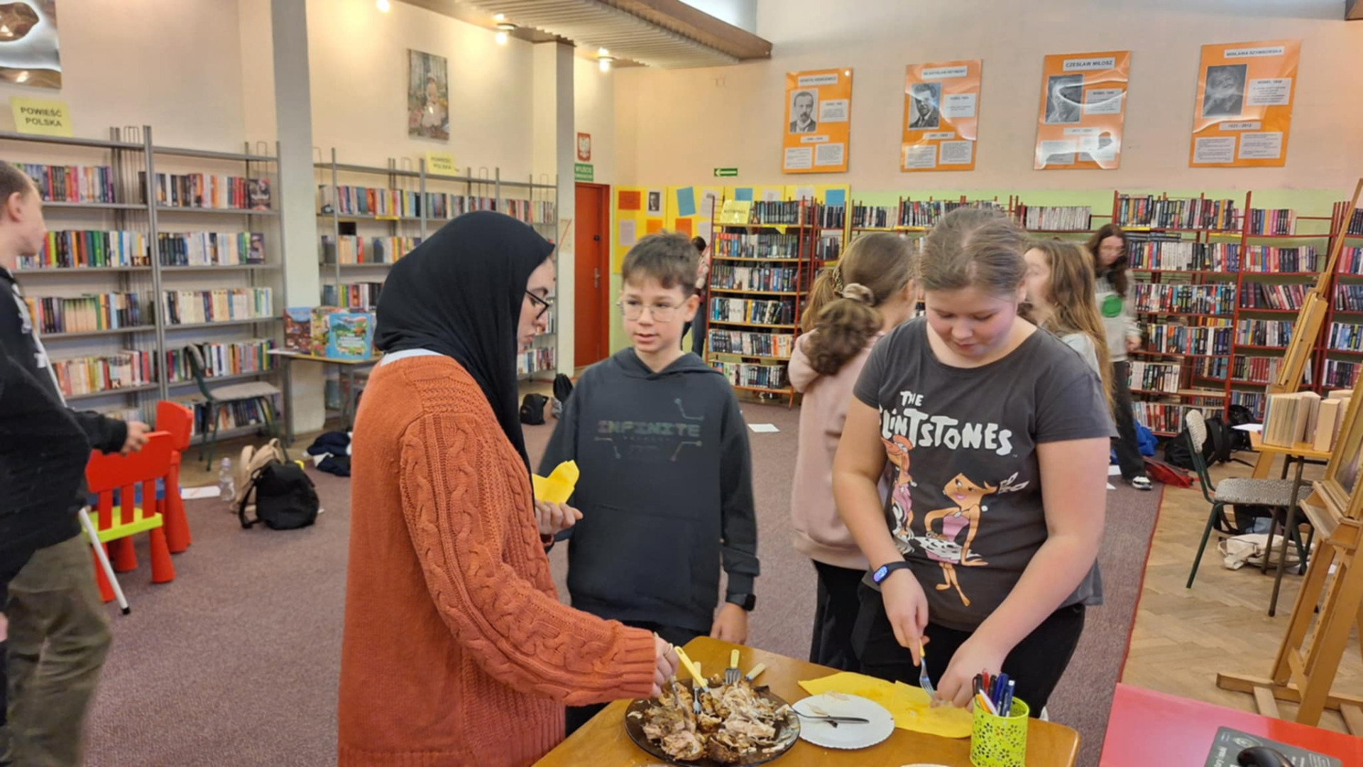 - Lamię i Zaka. Miały one miejsce w filii nr 53 Biblioteki Miejskiej w Łodzi (Biblioteka na Jurczyńskiego). W niezwykle zabawnej i przyjaznej atmosferze młodzież mogła poznać uroki najpiękniejszych zakątków Maroka - niezwykle urokliwego i bogatego w ciekawą kulturę i tradycje kraju. Jako że temat warsztatów brzmiał: „Smaki i zapachy Maroka”, młodzi ludzie skosztowali też typowych marokańskich potraw oraz spróbowali pysznej herbaty z miętą, którą serwuje się w małych, bogato zdobionych szklaneczkach i nalewa z imbryczka z wysoka. Jak przekazał Zak, Ci bardziej wprawieni potrafią nalewać herbatę ze znacznej wysokości nad szklanką, dzięki czemu napój jest lepiej napowietrzony, a na wierzchu pojawia się charakterystyczna pianka, czyli tzw. turban. Oczywiście nasi klubowicze musieli podjąć wyzwanie i nalewali marokańską herbatę z naprawdę dużej wysokości, nie roniąc przy tym ani kropli. Zajęcia przybierały różne formy, również interaktywne, gdyż nastolatkowie oglądali prezentację pełną ciekawostek związanych z intrygującym krajem wolontariuszy z EVS (European Voluntary Service). W finalnym momencie spotkania młodzież miała okazję przymierzenia typowych marokańskich strojów weselnych oraz spróbowania popularnej w Maroku zabawy, będącej świetną możliwością do wspólnej integracji.
