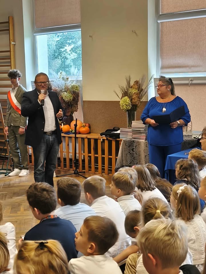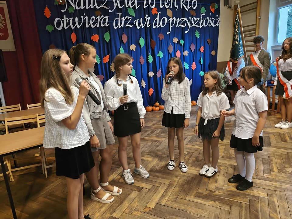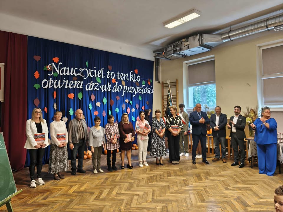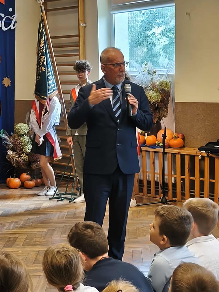 Po zakończeniu części artystycznej ciepłe słowa do zebranych skierował pan Wicekurator Jarosław Krajewski, podkreślając wyjątkową rolę nauczycieli w wychowywaniu i inspirowaniu młodego pokolenia. Następnie pan Wiceburmistrz Tomasz Krawczyk wyraził uznanie dla całej społeczności szkolnej oraz zachęcił uczniów do wspólnego podziękowania swoim pedagogom.
