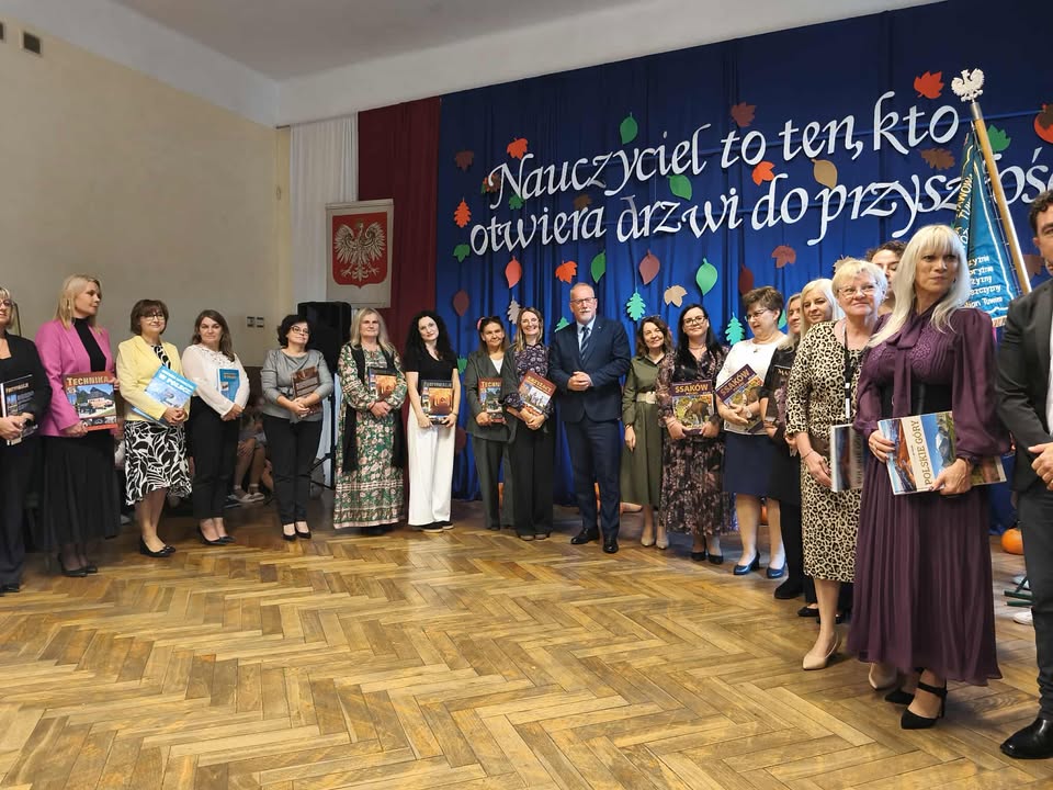 W dalszej części uroczystości znamienici goście wręczyli nauczycielom i pracownikom szkoły symboliczne upominki w postaci pięknych książek, będących wyrazem szacunku i wdzięczności. Dodatkowo Szkolne Koło Przedsiębiorczości ufundowało drobne prezenty - eleganckie długopisy, które stały się miłym i praktycznym upominkiem dla całej kadry. Ten gest sprawił, że spotkanie nabrało jeszcze bardziej wyjątkowego charakteru i z pewnością na długo pozostanie w pamięci uczestników.