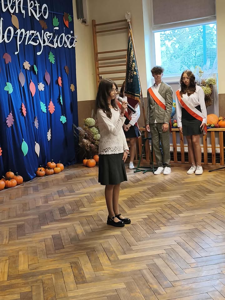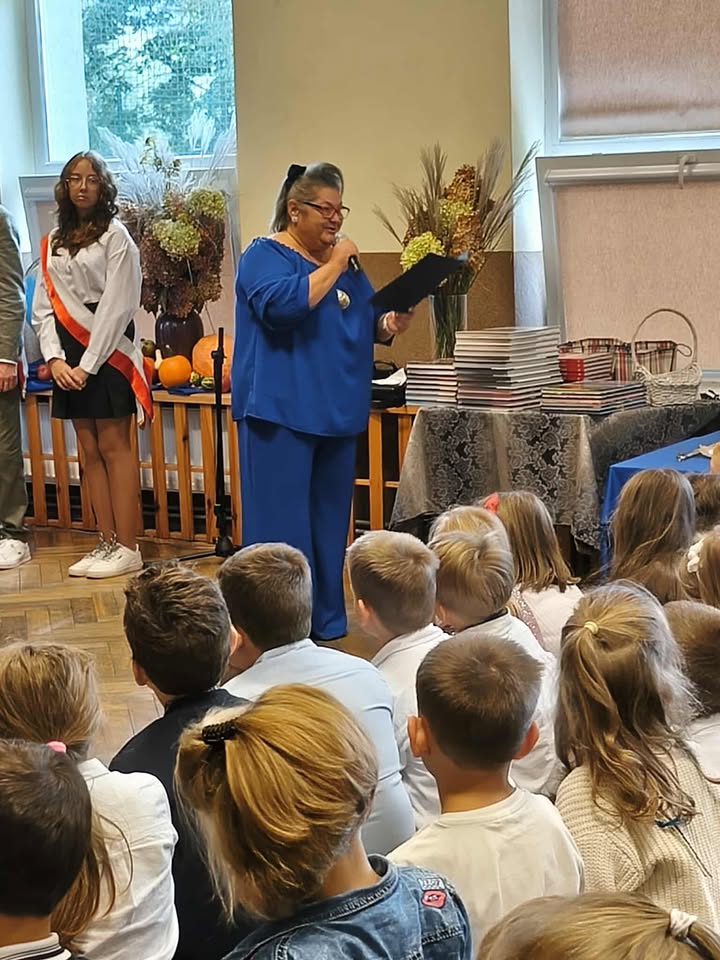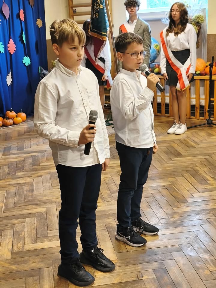 Część artystyczna, przygotowana pod kierunkiem polonistek – pani Anniki Niburskiej i pani Janiny Wiśnik – oraz przy wsparciu pani Ewy Pietrzyk, odpowiedzialnej za dekorację, była prawdziwą ucztą dla ducha. Uczniowie klas piątych zaprezentowali wzruszający program, w którym poezja, śpiew i taniec przeplatały się z humorem i refleksją. Na scenie zabrzmiały również delikatne dźwięki fletu, a zabawne scenki z życia szkolnego wywołały uśmiechy na twarzach publiczności.
