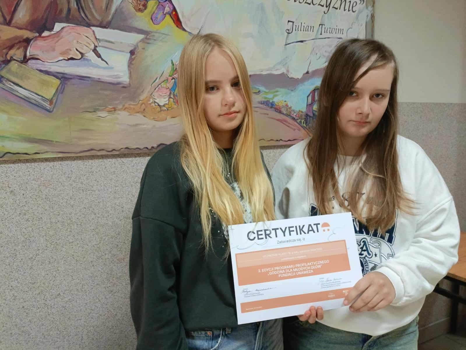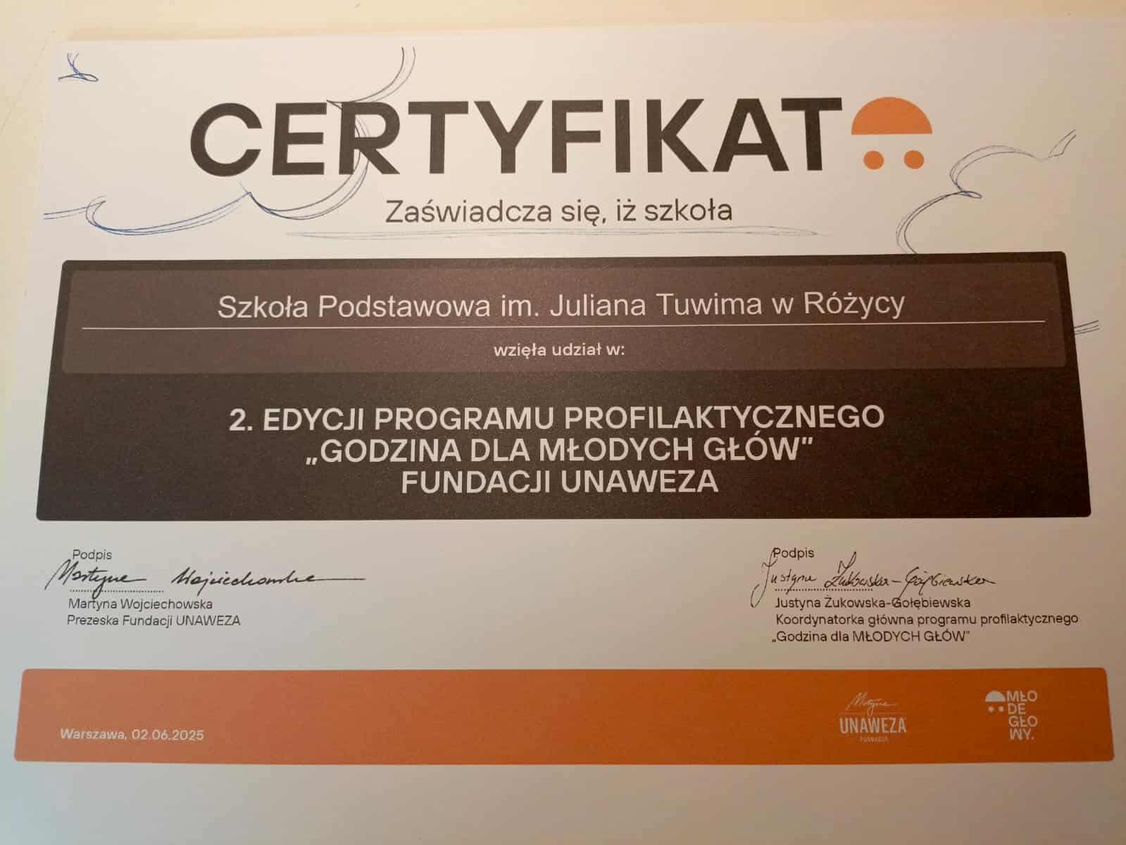 Szkoła Podstawowa im. Juliana Tuwima w Różycy została uhonorowana zaświadczeniem potwierdzającym udział w drugiej edycji ogólnopolskiego programu profilaktycznego „Godzina dla Młodych Głów”, realizowanego przez Fundację UNAWEZA Martyny Wojciechowskiej.